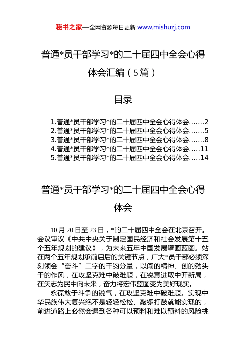 秘书之家—全网资源每日更新 www.mishuzj.com普通*员干部学习*的二十届四中全会心得体会汇编(5 篇)目录1.普通*员干部学习*的二十届四中全会心得体会.......22.普通*员干部学习*的二十届四中全会心得体会.......53.普通*员干部学习*的二十届四中全会心得体会.......84.普通*员干部学习*的二十届四中全会心得体会.....115.普通*员干部学习*的二十届四中全会心得体会.....14普通*员干部学习*的二十届四中全会心得体会10 月 20 日至 23 日,*的二十届四中全会在北京召开。会议审议《中共中央关于制定国民经济和社会发展第十五个五年规划的建议》,为未来五年中国发展擘画蓝图。站在两个五年规划承前启后的关键节点,广大*员干部必须深刻领会“奋斗”二字的千钧分量,以闯的精神、创的劲头干的作风,在攻坚克难中破难题,在锐意进取中开新局,在矢志为民中向未来,奋力将宏伟蓝图变为美好现实。永葆敢于斗争的锐气,在攻坚克难中破难题。实现中华民族伟大复兴绝不是轻轻松松、敲锣打鼓就能实现的,前进道路上必然会遇到各种可以预料和难以预料的风险挑秘书之家—全网资源每日更新 www.mishuzj.com战。面对发展中的“硬骨头”、改革中的“深水区”,是当“太平官”绕道走,还是做“主攻手”迎难上,考验着*员干部的*性与担当。广大*员干部必须发扬斗争精神,增强斗争本领,不做爱惜羽毛的“绅士”,要做敢于亮剑的“战士”。要主动投身到经济发展主战场、基层治理第一线、科技创新最前沿,敢于接“烫手的山芋”,勇于挑最重的担子。要坚决摒弃“等、靠、要”等消极思想,以“时时放心不下”的责任感,直面矛盾、动真碰硬,用实实在在的行动破解发展瓶颈,扫清前进障碍。强化改革创新的引擎,在锐意进取中开新局。惟改革者进,惟创新者强,惟改革创新者胜。面对新一轮科技革命和产业变革的浪潮,以及日趋激烈的国际竞争,因循守旧没有出路,畏缩不前坐失良机。广大*员干部必须把创新摆在发展全局的核心位置,敢于走前人没有走过的路。要自觉挣脱思想观念的束缚,打破惯性思维和路径依赖,用新发展理念指导工作,用改革的办法破解难题,努力在危机中育新机、于变局中开新局。要积极拥抱数字化、智能化浪潮,推动产业转型升级,优化营商环境,提升治理效能。要坚持“摸着石头过河”和加强顶层设计相结合,既要大胆探索、先行先试,也要蹄疾步稳、善作善成,以思想上的“破冰”引领行动上的“突围”,为高质量发展注入源源不断的动力。满怀人民至上的情怀,在矢志为民中向未来。我们*领导人民打江山、守江山,守的是人民的心。一切奋斗的最终目的,都是为了让人民过上好日子。擘画的宏伟蓝图,最终要体现在千家万户的幸福生活之中;未来的美好光景必须由全体人民共同分享。广大*员干部要常怀“我将无我,不负人民”的赤子之心,始终将人民放在心中最高位置。要坚持从群众中来、到群众中去,把办公桌搬到田间地头把会议室设在社区民居,用心倾听群众关于就业、教育、医疗、养老的急难愁盼,并将其作为履职尽责的“头等大秘书之家—全网资源每日更新 www.mishuzj.com事”。要树牢造福人民的正确政绩观,多做打基础、利长远的潜功,多办惠民生、暖民心的实事,用干部的“辛苦指数”换取群众的“幸福指数”,带领人民群众一道奔赴共同富裕的美好未来。普通*员干部学习*的二十届四中全会心得体会10 月 20 日至 23 日,*的二十届四中全会在北京召开,会议审议《中共中央关于制定国民经济和社会发展第十五个五年规划的建议》。“十五五”时期是我国开启全面建设社会主义现代化国家新征程的关键时期,擘画好这一阶段的宏伟蓝图,事关国家发展全局,事关亿万人民福祉。广大*员干部要始终坚持以人民为中心,锚定人民幸福这一“国之大者”,广泛深入一线察实情下实功、出实招办实事、用实劲求实效,用心用情用力让人民群众对美好生活的向往落地成景。察实情出实招,在街头巷尾中感知民生脉搏。知屋漏者在宇下,知政失者在草野。民声是最真实、最直接的民意表达,只有倾听最真实的声音、掌握最鲜活的民情,才能使规划更好地体现人民意愿。广大*员干部要坚持和弘扬“四下基层”优良作风,...