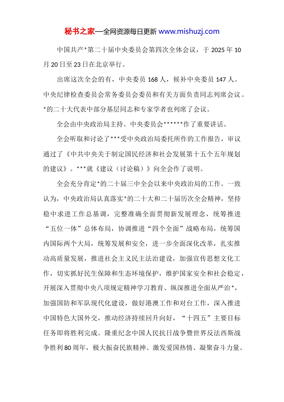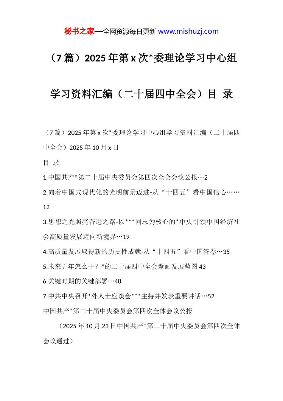 秘书之家—全网资源每日更新 www.mishuzj.com(7 篇)2025 年第 x 次*委理论学习中心组学习资料汇编(二十届四中全会)目 录(7 篇)2025 年第 x 次*委理论学习中心组学习资料汇编(二十届四中全会)2025 年 10 月 x 日目 录1.中国共产*第二十届中央委员会第四次全会会议公报…22.向着中国式现代化的光明前景迈进-从“十四五”看中国信心……123.思想之光照亮奋进之路-以***同志为核心的*中央引领中国经济社会高质量发展迈向新境界…194.高质量发展取得新的历史性成就-从“十四五”看中国答卷…355.未来五年怎么干?*的二十届四中全会擘画发展蓝图 436.关键时期的关键部署…487.中共中央召开*外人士座谈会***主持并发表重要讲话…52中国共产*第二十届中央委员会第四次全体会议公报 (2025 年 10 月 23 日中国共产*第二十届中央委员会第四次全体会议通过)秘书之家—全网资源每日更新 www.mishuzj.com 中国共产*第二十届中央委员会第四次全体会议,于 2025 年 10月 20 日至 23 日在北京举行。 出席这次全会的有,中央委员 168 人,候补中央委员 147 人。中央纪律检查委员会常务委员会委员和有关方面负责同志列席会议。*的二十大代表中部分基层同志和专家学者也列席了会议。 全会由中央政治局主持。中央委员会******作了重要讲话。 全会听取和讨论了***受中央政治局委托所作的工作报告,审议通过了《中共中央关于制定国民经济和社会发展第十五个五年规划的建议》。***就《建议(讨论稿)》向全会作了说明。 全会充分肯定*的二十届三中全会以来中央政治局的工作。一致认为,中央政治局认真落实*的二十大和二十届历次全会精神,坚持稳中求进工作总基调,完整准确全面贯彻新发展理念,统筹推进“五位一体”总体布局,协调推进“四个全面”战略布局,统筹国内国际两个大局,统筹发展和安全,进一步全面深化改革,扎实推动高质量发展,推进社会主义民主法治建设,加强宣传思想文化工作,切实抓好民生保障和生态环境保护,维护国家安全和社会稳定,开展深入贯彻中央八项规定精神学习教育、纵深推进全面从严治*,加强国防和军队现代化建设,做好港澳工作和对台工作,深入推进中国特色大国外交,推动经济持续回升向好,“十四五”主要目标任务即将胜利完成。隆重纪念中国人民抗日战争暨世界反法西斯战争胜利 80 周年,极大振奋民族精神、激发爱国热情、凝聚奋斗力量。秘书之家—全网资源每日更新 www.mishuzj.com 全会高度评价“十四五”时期我国发展取得的重大成就。“十四五”时期我国发展历程极不寻常、极不平凡。面对错综复杂的国际形势和艰巨繁重的国内改革发展稳定任务,以***同志为核心的*中央团结带领全*全国各族人民,迎难而上、砥砺前行,经受住世纪疫情严重冲击,有效应对一系列重大风险挑战,推动*和国家事业取得新的重大成就。我国经济实力、科技实力、综合国力跃上新台阶,中国式现代化迈出新的坚实步伐,第二个百年奋斗目标新征程实现良好开局。 全会指出,实现社会主义现代化是一个阶梯式递进、不断发展进步的历史过程,需要不懈努力、接续奋斗。“十五五”时期是基本实现社会主义现代化夯实基础、全面发力的关键时期,在基本实现社会主义现代化进程中具有承前启后的重要地位。“十五五”时期我国发展环境面临深刻复杂变化,我国发展处于战略机遇和风险挑战并存、不确定难预料因素增多的时期。我国经济基础稳、优势多、韧性强、潜能大,长期向好的支撑条件和基本趋势没有变,中国特色社会主义制度优势、超大规模市场优势、完整产业体系优势、丰富人才资源优势更加彰显。全*要深刻领悟“两个确立”的决定性意义,增强“四个意识”、坚定“四个自信”、做到“两个维护”,保持战略定力,增强必胜信心,积极识变应变求变,敢于斗争、善于斗争,勇于面对风高浪急甚至惊涛骇浪的重大考验,以历史主动精神克难关、战风险、迎挑战,集中力量办好自己的事,续写经济秘书之家—全网资源每日更新 www.mishuzj.com快速发展和社会长期稳定两大奇迹新篇章,奋力开创中国式现代化建设新局面。 全会强调,“十五五”时期经济社会发展,必须...