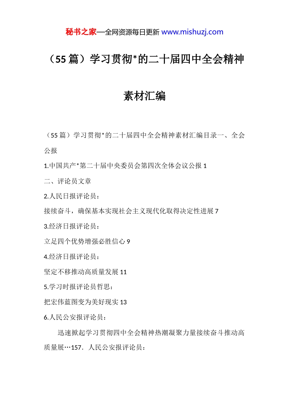 秘书之家—全网资源每日更新 www.mishuzj.com(55 篇)学习贯彻*的二十届四中全会精神素材汇编(55 篇)学习贯彻*的二十届四中全会精神素材汇编目录一、全会公报1.中国共产*第二十届中央委员会第四次全体会议公报 1二、评论员文章2.人民日报评论员:接续奋斗,确保基本实现社会主义现代化取得决定性进展 73.经济日报评论员:立足四个优势增强必胜信心 94.经济日报评论员:坚定不移推动高质量发展 115.学习时报评论员哲思:把宏伟蓝图变为美好现实 136.人民公安报评论员: 迅速掀起学习贯彻四中全会精神热潮凝聚力量接续奋斗推动高质量展…157.人民公安报评论员:秘书之家—全网资源每日更新 www.mishuzj.com坚持*对公安工作的绝对领导 171.贵州日报评论员:铸牢政治忠诚凝聚奋进伟力 192.贵州日报评论员:锚定“人民至上”的奋斗坐标 213.南方日报评论员:确保基本实现社会主义现代化取得决定性进展 234.南方日报评论员:准确把握“十五五”时期我国发展的历史方位 265.辽宁日报评论员:迅速掀起学习贯彻*的二十届四中全会精神热潮 286.福建日报评论员:迅速兴起学习贯彻热潮 307.广西日报评论员:贯彻四中全会精神全力冲刺第四季度 328.**日报评论员:兴起学习贯彻热潮实干笃行抓好落实 349.河南日报评论员:奋楫扬帆启新程 3610.河南日报评论员:接续奋斗谱新篇 38秘书之家—全网资源每日更新 www.mishuzj.com三、强烈反应和热议文章11.江西省直单位*员干部认真学习贯彻*的二十届四中全会精神 4012.*的二十届四中全会精神在重庆市广大*员干部群众中引发热烈反响…4313.广东社会各界干部群众学习贯彻落实*的二十届四中全会精神 4714.*的二十届四中全会精神在区直机关*员干部群众中引发热烈反响……5115.云南省各地干部群众认真学习*的二十届四中全会精神 5416.*的二十届四中全会精神在甘肃省干部群众中引发热烈反响 5817.*的二十届四中全会精神在江苏省级机关引发热烈反响 6018.*的二十届四中全会在吉林省引发热烈反响 6419.*的二十届四中全会精神在长沙市*员干部中引发热烈反响 6720.*的二十届四中全会在西安市引起热烈反响 7321.*的二十届四中全会精神在济南广大*员干部群众中引发热烈反响……7622.*的二十届四中全会在合肥广大*员干部群众中引发热烈反响 8023.*的二十届四中全会精神在南通市机关*员干部中引发热烈反响 82四、心得体会24.鄂伦春自治旗法院学习贯彻*的二十届四中全会精神心得体会汇编……8625.重庆无*派人士学习贯彻*的二十届四中全会精神心得体会汇编…秘书之家—全网资源每日更新 www.mishuzj.com……8926.天津民建区级组织领导谈体会学习二十届四中全会精神心得体会汇编…9527.民革上海市委会理论学习中心组成员谈学习全会精神体会汇编10128.学习中共二十届四中全会精神湖北民进会员谈心得体会汇编 10429.施乾平:学习中共二十届四中全会精神感受 10730.殷建光:强大文化“四力”扎实推进文化强国建设 10931.中央*校中国式现代化研究中心主任张占斌:奋力开创中国式现代化建设新局面 11232.广州市社会科学院现代产业研究所副所长、研究员**:建设现代化产业体系积极贡献广州力量 11433.广州实验室研究员施一:勇于探索大胆创新力争关键技术取得关键突破 11534.云蝶科技总裁田雪松:以协同合作激发市场活力积极融入经济发展大局 11635.增城区正果镇*委书记钟灼坤:抢抓引领区建设机遇推动农文旅融合高质量发展 11736.广州市博物馆协会会长、广州博物馆馆长吴凌云:秘书之家—全网资源每日更新 www.mishuzj.com讲好中国人的精彩故事用文化的力量影响世界 11837.越秀区洪桥街道办事处主任王飞:加大保障和改善民生力度提高居民生活品质 11938.陈康:用“为民”情怀交出人民满意答卷 12039.罗建华:擦亮为民底色书写“发展向前民生向暖”精彩答卷 12240.郭元鹏:奔向绚丽多彩的“下一个五年”的新目标 12441.罗建华:“五年规划”尽显“中国之治”制度优势 12642.财政部*校第 81 期处级干部进修班深入学习领会全会精神……12843.新余市工商联副主席、江西赣西教育集团董事长艾磊华:学习贯彻*的二十届四中全...