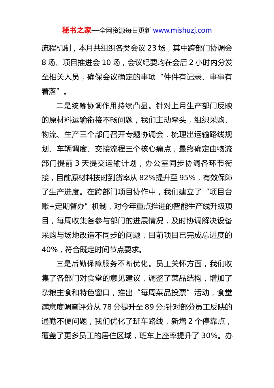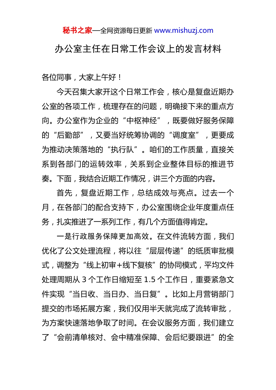 秘书之家—全网资源每日更新 www.mishuzj.com办公室主任在日常工作会议上的发言材料 各位同事,大家上午好!今天召集大家开这个日常工作会,核心是复盘近期办公室的各项工作,梳理存在的问题,明确接下来的重点方向。办公室作为企业的“中枢神经”,既要做好服务保障的“后勤部”,又要当好统筹协调的“调度室”,更要成为推动决策落地的“执行队”。咱们的工作质量,直接关系到各部门的运转效率,关系到企业整体目标的推进节奏。下面,我结合近期工作情况,讲三个方面的内容。首先,复盘近期工作,总结成效与亮点。过去一个月,在各部门的配合支持下,办公室围绕企业年度重点任务,扎实推进了一系列工作,有几个方面值得肯定。一是行政服务保障更加高效。在文件流转方面,我们优化了公文处理流程,将以往“层层传递”的纸质审批模式,调整为“线上初审+线下复核”的协同模式,平均文件处理周期从 3 个工作日缩短至 1.5 个工作日,重要紧急文件实现“当日收、当日办、当日复”。比如上月营销部门提交的市场拓展方案,我们仅用半天就完成了流转审批,为方案快速落地争取了时间。在会议服务方面,我们建立了“会前清单核对、会中精准保障、会后纪要跟进”的全秘书之家—全网资源每日更新 www.mishuzj.com流程机制,本月共组织各类会议 23 场,其中跨部门协调会8 场、项目推进会 10 场,会议纪要均在会后 2 小时内分发至相关人员,确保会议确定的事项“件件有记录、事事有着落”。二是统筹协调作用持续凸显。针对上月生产部门反映的原材料运输衔接不畅问题,我们主动牵头,组织采购、物流、生产三个部门召开专题协调会,梳理出运输路线规划、车辆调度、交接流程三个核心痛点,最终确定由物流部门提前 3 天提交运输计划,办公室同步协调各环节衔接,目前原材料按时到货率从 82%提升至 95%,有效保障了生产进度。在跨部门项目协作中,我们建立了“项目台账+定期督办”机制,对今年重点推进的智能生产线升级项目,每周收集各参与部门的进展情况,及时协调解决设备采购与场地改造不同步的问题,目前项目已完成总进度的40%,符合既定时间节点要求。三是后勤保障服务不断优化。员工关怀方面,我们收集了各部门对食堂的意见建议,调整了菜品结构,增加了杂粮主食和特色窗口,推出“每周菜品投票”活动,食堂满意度调查评分从 78 分提升至 89 分;针对部分员工反映的通勤不便问题,我们优化了班车路线,新增 2 个停靠点,覆盖了更多员工的居住区域,班车上座率提升了 30%。办秘书之家—全网资源每日更新 www.mishuzj.com公保障方面,我们完成了 2 号办公楼的设备检修,更换老化空调 12 台、办公电脑 8 台,对会议室的投影、音响设备进行了升级,确保办公环境稳定舒适;同时规范了办公用品采购与发放流程,实行“按需申领、季度盘点”,有效降低了耗材浪费,本月办公用品支出较上月减少 12%。四是督办落实工作扎实推进。围绕企业季度工作会议确定的 18 项重点任务,我们逐一分解责任部门、明确完成时限,建立了“周提醒、月通报”的督办机制。通过实地走访、电话跟进等方式,对任务推进情况进行全程跟踪,目前已有 10 项任务按计划完成,6 项任务稳步推进,2 项进度滞后的任务,我们已与责任部门沟通,分析了滞后原因并调整了推进方案,确保季度目标顺利达成。在肯定成绩的同时,我们更要清醒地看到工作中存在的问题和不足。结合近期的工作反馈和自查情况,主要有以下几个突出问题。第一,流程衔接存在“中梗阻”。部分跨部门工作中,存在“边界模糊、责任推诿”的情况。比如上月行政采购的办公家具,因未提前与后勤部门明确安装时间,导致家具到货后闲置 3 天才能安排安装,影响了新入职员工的办公使用。还有部分文件流转中,个别部门存在“压件”现象,明明是本部门职责范围内的审批,却拖延办秘书之家—全网资源每日更新 www.mishuzj.com理,导致整体流程滞后。这说明我们的流程梳理还不够细致,部门间的权责划分还不够清晰,协调联动的效率有待提升。第二,服务保障存在“温差感”。虽然我们做了不少后勤保障工作,但仍有部分员工反映“需求响应不...