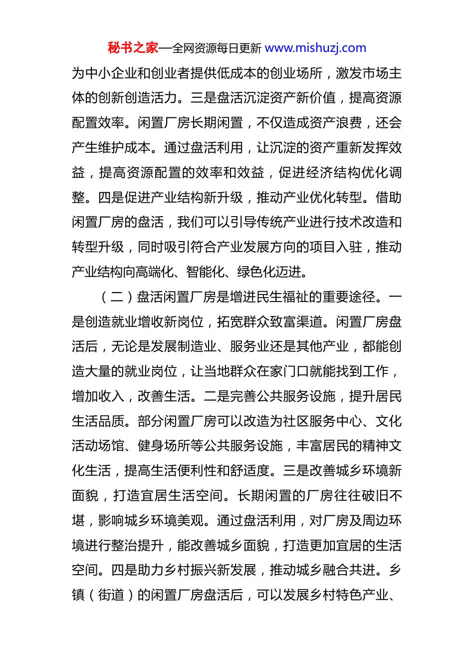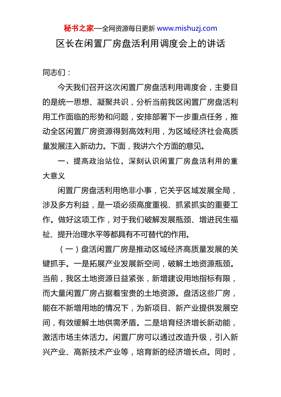 秘书之家—全网资源每日更新 www.mishuzj.com区长在闲置厂房盘活利用调度会上的讲话 同志们:今天我们召开这次闲置厂房盘活利用调度会,主要目的是统一思想、凝聚共识,分析当前我区闲置厂房盘活利用工作面临的形势和问题,安排部署下一步重点任务,推动全区闲置厂房资源得到高效利用,为区域经济社会高质量发展注入新动力。下面,我讲六个方面的意见。一、提高政治站位,深刻认识闲置厂房盘活利用的重大意义闲置厂房盘活利用绝非小事,它关乎区域发展全局,涉及多方利益,是一项必须高度重视、抓紧抓实的重要工作。做好这项工作,对于我们破解发展瓶颈、增进民生福祉、提升治理水平等都具有不可替代的作用。(一)盘活闲置厂房是推动区域经济高质量发展的关键抓手。一是拓展产业发展新空间,破解土地资源瓶颈。当前,我区土地资源日益紧张,新增建设用地指标有限,而大量闲置厂房占据着宝贵的土地资源。盘活这些厂房,能在不新增用地的情况下,为新项目、新产业提供发展空间,有效缓解土地供需矛盾。二是培育经济增长新动能,激活市场主体活力。闲置厂房可以通过改造升级,引入新兴产业、高新技术产业等,培育新的经济增长点。同时,秘书之家—全网资源每日更新 www.mishuzj.com为中小企业和创业者提供低成本的创业场所,激发市场主体的创新创造活力。三是盘活沉淀资产新价值,提高资源配置效率。闲置厂房长期闲置,不仅造成资产浪费,还会产生维护成本。通过盘活利用,让沉淀的资产重新发挥效益,提高资源配置的效率和效益,促进经济结构优化调整。四是促进产业结构新升级,推动产业优化转型。借助闲置厂房的盘活,我们可以引导传统产业进行技术改造和转型升级,同时吸引符合产业发展方向的项目入驻,推动产业结构向高端化、智能化、绿色化迈进。(二)盘活闲置厂房是增进民生福祉的重要途径。一是创造就业增收新岗位,拓宽群众致富渠道。闲置厂房盘活后,无论是发展制造业、服务业还是其他产业,都能创造大量的就业岗位,让当地群众在家门口就能找到工作,增加收入,改善生活。二是完善公共服务设施,提升居民生活品质。部分闲置厂房可以改造为社区服务中心、文化活动场馆、健身场所等公共服务设施,丰富居民的精神文化生活,提高生活便利性和舒适度。三是改善城乡环境新面貌,打造宜居生活空间。长期闲置的厂房往往破旧不堪,影响城乡环境美观。通过盘活利用,对厂房及周边环境进行整治提升,能改善城乡面貌,打造更加宜居的生活空间。四是助力乡村振兴新发展,推动城乡融合共进。乡镇(街道)的闲置厂房盘活后,可以发展乡村特色产业、秘书之家—全网资源每日更新 www.mishuzj.com农产品加工等项目,带动农村经济发展,促进城乡要素流动,助力乡村振兴战略实施。(三)盘活闲置厂房是提升基层治理效能的有效手段。一是化解基层矛盾新焦点,维护社会和谐稳定。闲置厂房可能因产权不清、租赁纠纷等问题引发矛盾,影响社会稳定。通过规范的盘活利用工作,解决这些历史遗留问题,化解矛盾纠纷,维护基层和谐稳定。二是强化基层组织功能,增强服务群众能力。在闲置厂房盘活过程中,村(社区)组织发挥着重要作用。通过参与这项工作,能提升基层组织的协调能力、服务能力和管理能力,更好地为群众服务。三是构建共建共治新机制,凝聚基层治理合力。闲置厂房盘活需要政府、企业、村(社区)、群众等多方参与,通过构建共建共治共享的机制,凝聚各方力量,形成基层治理的强大合力。四是提升区域管理新水平,促进治理精细化。在盘活利用过程中,需要建立健全各项管理制度和工作流程,这有助于提升区域管理的精细化水平,推动基层治理体系和治理能力现代化。(四)盘活闲置厂房是优化营商环境的必然要求。一是打造优质发展新平台,吸引外来投资落户。盘活后的闲置厂房可以成为招商引资的重要平台,为外来投资者提供现成的生产经营场所,降低投资成本,吸引更多项目落户我区。二是提供便捷服务新体验,增强企业发展信心。在秘书之家—全网资源每日更新 www.mishuzj.com闲置厂房盘活过程中,政府部门主动为企业提供政策支持、手续办理等服务,能让企业感受到我区优质的营商环境,增强...