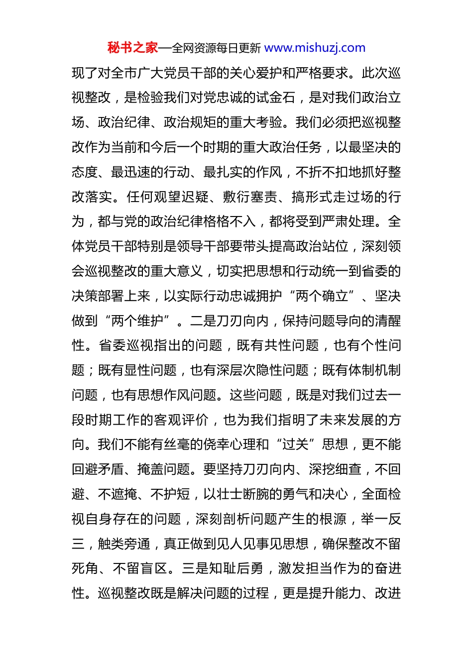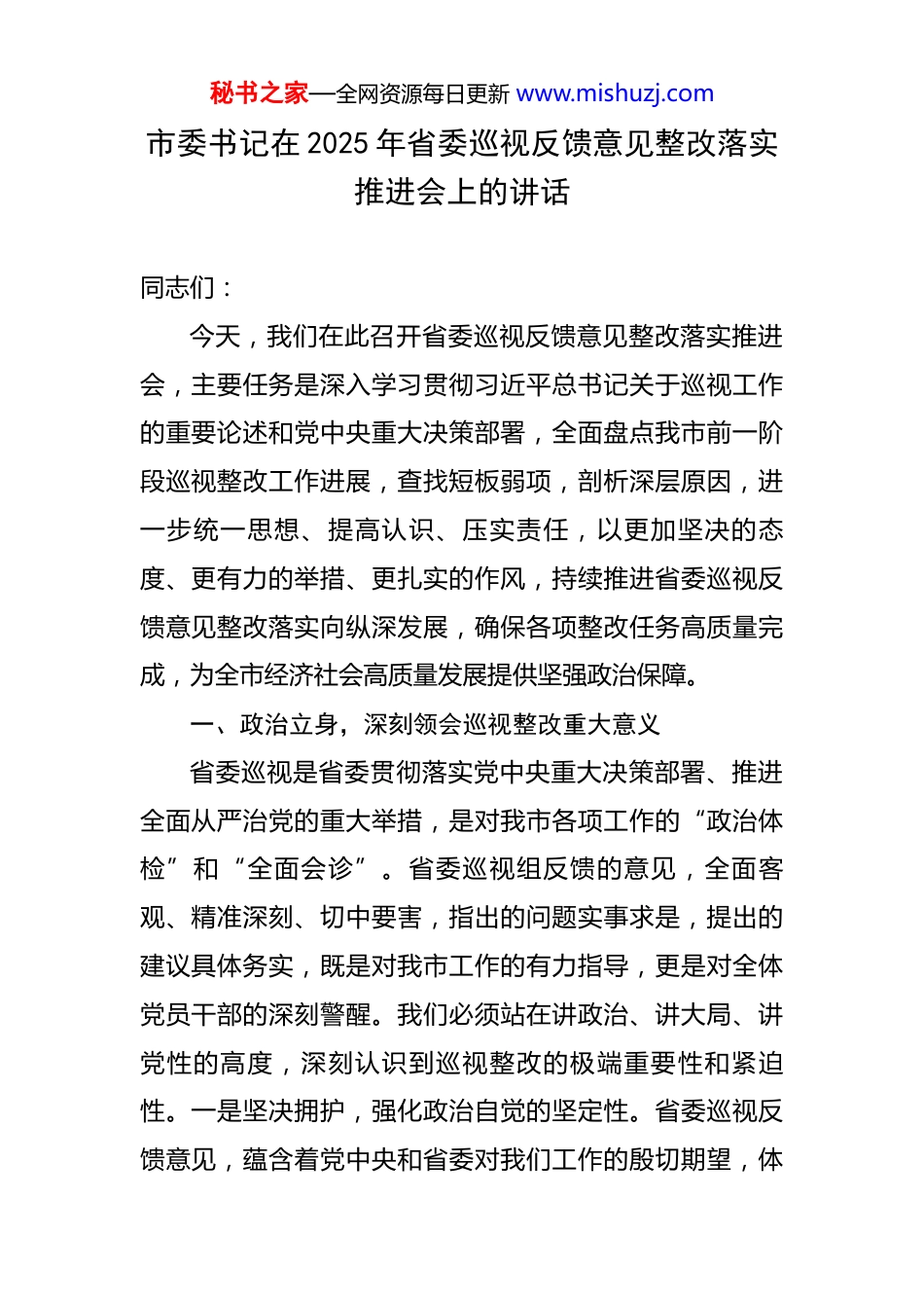 秘书之家—全网资源每日更新 www.mishuzj.com市委书记在 2025 年省委巡视反馈意见整改落实推进会上的讲话 同志们:今天,我们在此召开省委巡视反馈意见整改落实推进会,主要任务是深入学习贯彻习近平总书记关于巡视工作的重要论述和党中央重大决策部署,全面盘点我市前一阶段巡视整改工作进展,查找短板弱项,剖析深层原因,进一步统一思想、提高认识、压实责任,以更加坚决的态度、更有力的举措、更扎实的作风,持续推进省委巡视反馈意见整改落实向纵深发展,确保各项整改任务高质量完成,为全市经济社会高质量发展提供坚强政治保障。一、政治立身,深刻领会巡视整改重大意义省委巡视是省委贯彻落实党中央重大决策部署、推进全面从严治党的重大举措,是对我市各项工作的“政治体检”和“全面会诊”。省委巡视组反馈的意见,全面客观、精准深刻、切中要害,指出的问题实事求是,提出的建议具体务实,既是对我市工作的有力指导,更是对全体党员干部的深刻警醒。我们必须站在讲政治、讲大局、讲党性的高度,深刻认识到巡视整改的极端重要性和紧迫性。一是坚决拥护,强化政治自觉的坚定性。省委巡视反馈意见,蕴含着党中央和省委对我们工作的殷切期望,体秘书之家—全网资源每日更新 www.mishuzj.com现了对全市广大党员干部的关心爱护和严格要求。此次巡视整改,是检验我们对党忠诚的试金石,是对我们政治立场、政治纪律、政治规矩的重大考验。我们必须把巡视整改作为当前和今后一个时期的重大政治任务,以最坚决的态度、最迅速的行动、最扎实的作风,不折不扣地抓好整改落实。任何观望迟疑、敷衍塞责、搞形式走过场的行为,都与党的政治纪律格格不入,都将受到严肃处理。全体党员干部特别是领导干部要带头提高政治站位,深刻领会巡视整改的重大意义,切实把思想和行动统一到省委的决策部署上来,以实际行动忠诚拥护“两个确立”、坚决做到“两个维护”。二是刀刃向内,保持问题导向的清醒性。省委巡视指出的问题,既有共性问题,也有个性问题;既有显性问题,也有深层次隐性问题;既有体制机制问题,也有思想作风问题。这些问题,既是对我们过去一段时期工作的客观评价,也为我们指明了未来发展的方向。我们不能有丝毫的侥幸心理和“过关”思想,更不能回避矛盾、掩盖问题。要坚持刀刃向内、深挖细查,不回避、不遮掩、不护短,以壮士断腕的勇气和决心,全面检视自身存在的问题,深刻剖析问题产生的根源,举一反三,触类旁通,真正做到见人见事见思想,确保整改不留死角、不留盲区。三是知耻后勇,激发担当作为的奋进性。巡视整改既是解决问题的过程,更是提升能力、改进秘书之家—全网资源每日更新 www.mishuzj.com作风、推动发展的契机。通过巡视,我们能够更加清晰地看到自身存在的差距和不足,这正是我们改进工作、弥补短板的宝贵机会。要把巡视整改与推动高质量发展紧密结合起来,与深化改革创新、优化营商环境、保障和改善民生、防范化解风险等重点工作深度融合,真正把巡视成果转化为推动全市各项事业全面进步的强大动力。要以巡视整改为契机,进一步激发广大党员干部干事创业的精气神,以实际行动回应省委的关切和人民群众的期待,以高质量的整改成效推动全市高质量发展迈上新台阶。二、高位推动,系统集成整改落实务求实效自省委巡视反馈意见以来,市委高度重视,迅速行动,周密部署,扎实推动各项整改任务有序开展。全市各级各部门积极响应,上下联动,形成了齐抓共管的良好局面,整改工作取得了阶段性成效。一是强化组织领导,构建科学整改体系。市委第一时间成立了由我任组长、相关市领导任副组长的巡视整改工作领导小组,下设专门的办公室,统筹协调全市巡视整改工作。领导小组多次召开专题会议,传达学习省委巡视反馈意见,研究制定整改方案,细化任务分工,明确责任主体和完成时限。各牵头单位和责任单位也分别成立了工作专班,制定了具体整改措施,确保各项任务落到实处。通过构建“市委总揽、部门负责、上下联动、高效运转”的整改工作体系,为整改工秘书之家—全网资源每日更新 www.mishuzj.com作的顺利推进提供了坚强组织保障。二是聚焦问题清单,精准施策...