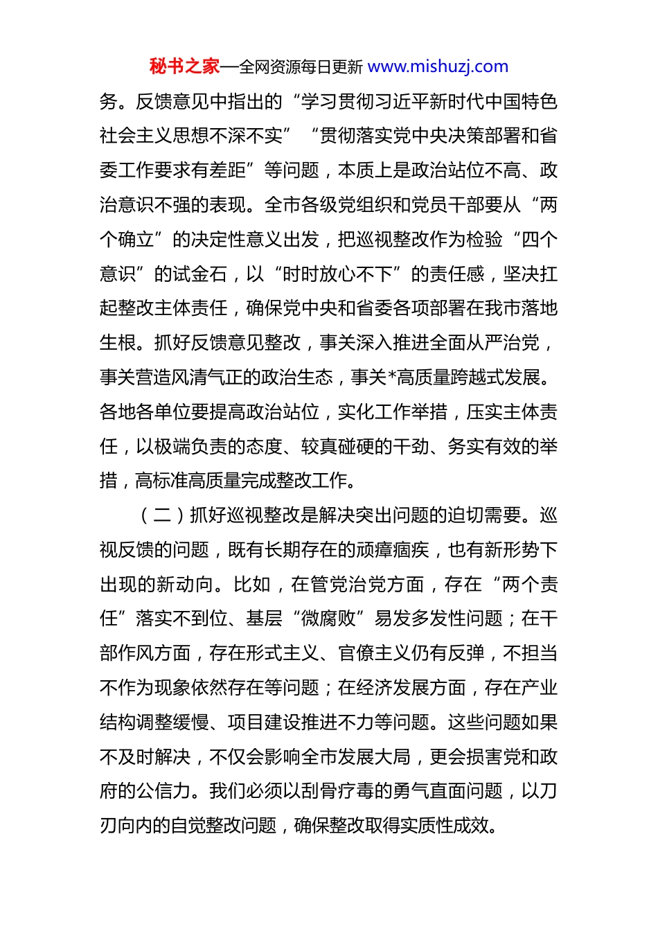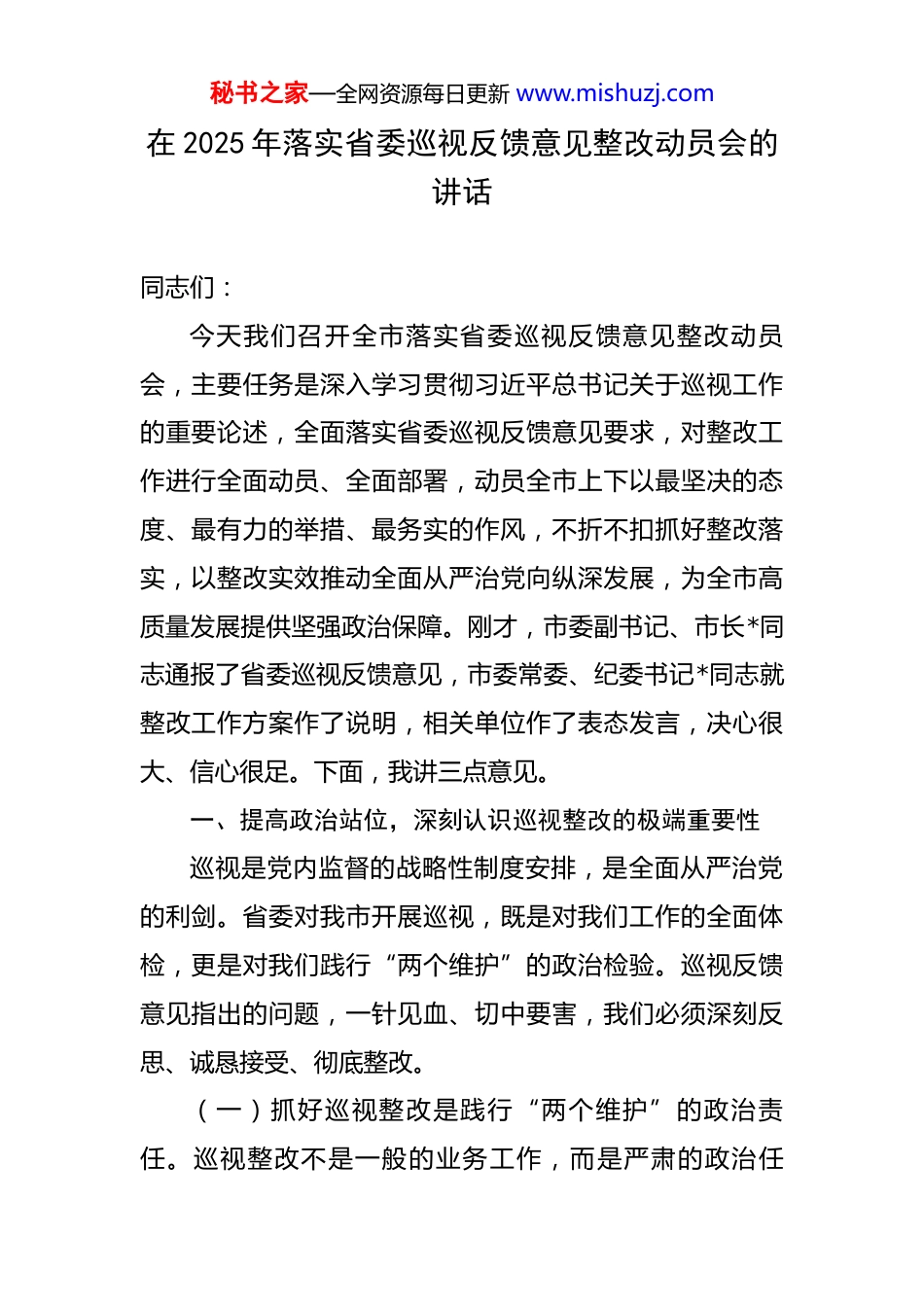 秘书之家—全网资源每日更新 www.mishuzj.com在 2025 年落实省委巡视反馈意见整改动员会的讲话 同志们:今天我们召开全市落实省委巡视反馈意见整改动员会,主要任务是深入学习贯彻习近平总书记关于巡视工作的重要论述,全面落实省委巡视反馈意见要求,对整改工作进行全面动员、全面部署,动员全市上下以最坚决的态度、最有力的举措、最务实的作风,不折不扣抓好整改落实,以整改实效推动全面从严治党向纵深发展,为全市高质量发展提供坚强政治保障。刚才,市委副书记、市长*同志通报了省委巡视反馈意见,市委常委、纪委书记*同志就整改工作方案作了说明,相关单位作了表态发言,决心很大、信心很足。下面,我讲三点意见。一、提高政治站位,深刻认识巡视整改的极端重要性巡视是党内监督的战略性制度安排,是全面从严治党的利剑。省委对我市开展巡视,既是对我们工作的全面体检,更是对我们践行“两个维护”的政治检验。巡视反馈意见指出的问题,一针见血、切中要害,我们必须深刻反思、诚恳接受、彻底整改。(一)抓好巡视整改是践行“两个维护”的政治责任。巡视整改不是一般的业务工作,而是严肃的政治任秘书之家—全网资源每日更新 www.mishuzj.com务。反馈意见中指出的“学习贯彻习近平新时代中国特色社会主义思想不深不实”“贯彻落实党中央决策部署和省委工作要求有差距”等问题,本质上是政治站位不高、政治意识不强的表现。全市各级党组织和党员干部要从“两个确立”的决定性意义出发,把巡视整改作为检验“四个意识”的试金石,以“时时放心不下”的责任感,坚决扛起整改主体责任,确保党中央和省委各项部署在我市落地生根。抓好反馈意见整改,事关深入推进全面从严治党,事关营造风清气正的政治生态,事关*高质量跨越式发展。各地各单位要提高政治站位,实化工作举措,压实主体责任,以极端负责的态度、较真碰硬的干劲、务实有效的举措,高标准高质量完成整改工作。(二)抓好巡视整改是解决突出问题的迫切需要。巡视反馈的问题,既有长期存在的顽瘴痼疾,也有新形势下出现的新动向。比如,在管党治党方面,存在“两个责任”落实不到位、基层“微腐败”易发多发性问题;在干部作风方面,存在形式主义、官僚主义仍有反弹,不担当不作为现象依然存在等问题;在经济发展方面,存在产业结构调整缓慢、项目建设推进不力等问题。这些问题如果不及时解决,不仅会影响全市发展大局,更会损害党和政府的公信力。我们必须以刮骨疗毒的勇气直面问题,以刀刃向内的自觉整改问题,确保整改取得实质性成效。秘书之家—全网资源每日更新 www.mishuzj.com(三)抓好巡视整改是推动高质量发展的重要契机。巡视既是“体检”也是“赋能”。反馈意见不仅指出了问题,更指明了方向。我们要把巡视整改与贯彻党的二十大精神结合起来,与落实省委“*战略”结合起来,与推动我市“十四五”规划实施结合起来,切实把整改成效转化为推动高质量发展的强大动力。要通过整改,进一步优化营商环境,激发市场主体活力;进一步改进干部作风,提升治理效能;进一步密切党群干群关系,凝聚发展合力,为加快建设现代化*提供坚强保障。二、聚焦问题导向,以钉钉子精神抓好整改落实巡视整改,关键在“改”,核心在“实”。全市各级党组织要对照省委巡视反馈意见,制定整改方案,建立问题清单、责任清单、时限清单,确保每个问题都有明确的整改措施、责任单位、责任人和完成时限。(一)坚持政治引领,在强化理论武装上见实效。针对“学习贯彻习近平新时代中国特色社会主义思想不深不实”问题,要把政治建设摆在首位,严格落实“第一议题”制度,深入开展学习贯彻习近平新时代中国特色社会主义思想主题教育,重点学习习近平总书记关于本地区本领域工作的重要讲话和指示批示精神。要创新学习方式,通过专题研讨、理论学习中心组学习、基层宣讲等形式,推动学习往深里走、往实里走、往心里走。要坚持学用结秘书之家—全网资源每日更新 www.mishuzj.com合,把学习成果转化为解决实际问题、推动高质量发展的具体行动,确保党中央和省委各项决策部署在我市不折不扣落实到位。(二)坚持从严从实,在压实“两个...