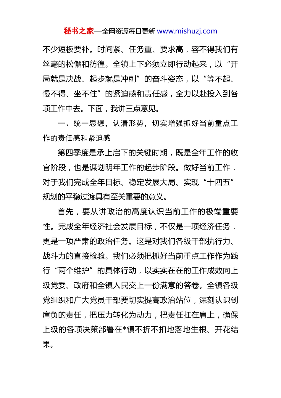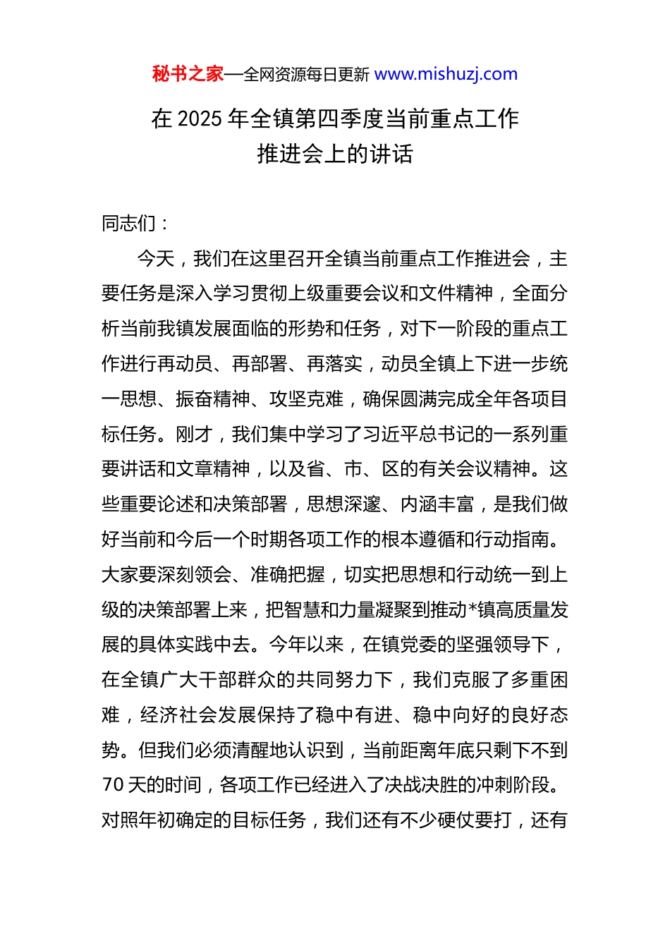 秘书之家—全网资源每日更新 www.mishuzj.com在 2025 年全镇第四季度当前重点工作推进会上的讲话 同志们:今天,我们在这里召开全镇当前重点工作推进会,主要任务是深入学习贯彻上级重要会议和文件精神,全面分析当前我镇发展面临的形势和任务,对下一阶段的重点工作进行再动员、再部署、再落实,动员全镇上下进一步统一思想、振奋精神、攻坚克难,确保圆满完成全年各项目标任务。刚才,我们集中学习了习近平总书记的一系列重要讲话和文章精神,以及省、市、区的有关会议精神。这些重要论述和决策部署,思想深邃、内涵丰富,是我们做好当前和今后一个时期各项工作的根本遵循和行动指南。大家要深刻领会、准确把握,切实把思想和行动统一到上级的决策部署上来,把智慧和力量凝聚到推动*镇高质量发展的具体实践中去。今年以来,在镇党委的坚强领导下,在全镇广大干部群众的共同努力下,我们克服了多重困难,经济社会发展保持了稳中有进、稳中向好的良好态势。但我们必须清醒地认识到,当前距离年底只剩下不到70 天的时间,各项工作已经进入了决战决胜的冲刺阶段。对照年初确定的目标任务,我们还有不少硬仗要打,还有秘书之家—全网资源每日更新 www.mishuzj.com不少短板要补。时间紧、任务重、要求高,容不得我们有丝毫的松懈和彷徨。全镇上下必须立即行动起来,以“开局就是决战、起步就是冲刺”的奋斗姿态,以“等不起、慢不得、坐不住”的紧迫感和责任感,全力以赴投入到各项工作中去。下面,我讲三点意见。一、统一思想,认清形势,切实增强抓好当前重点工作的责任感和紧迫感第四季度是承上启下的关键时期,既是全年工作的收官阶段,也是谋划明年工作的起步阶段。做好当前工作,对于我们完成全年目标、稳定发展大局、实现“十四五”规划的平稳过渡具有至关重要的意义。首先,要从讲政治的高度认识当前工作的极端重要性。完成全年经济社会发展目标,不仅是一项经济任务,更是一项严肃的政治任务。这是对我们各级干部执行力、战斗力的直接检验。我们必须把抓好当前重点工作作为践行“两个维护”的具体行动,以实实在在的工作成效向上级党委、政府和全镇人民交上一份满意的答卷。全镇各级党组织和广大党员干部要切实提高政治站位,深刻认识到肩负的责任,把压力转化为动力,把责任扛在肩上,确保上级的各项决策部署在*镇不折不扣地落地生根、开花结果。秘书之家—全网资源每日更新 www.mishuzj.com其次,要从谋发展的维度把握当前工作的现实紧迫性。当前,区域竞争日趋激烈,发展如逆水行舟,不进则退,慢进亦退。虽然今年我镇在项目建设、产业发展等方面取得了一些成绩,但与先进地区相比,我们的发展基础依然薄弱,产业结构仍需优化,增长后劲尚显不足。特别是对照高质量发展的要求,我们在民生保障、生态环境、社会治理等方面还存在诸多差距。如果我们不能在第四季度迎头赶上,奋力一搏,不仅会影响全年的整体评价,更可能在未来的区域发展格局中处于被动地位。因此,我们必须牢固树立“慢走一步、差之千里”的危机意识,紧紧抓住项目建设这个“牛鼻子”,持续优化营商环境,全力以赴稳增长、促发展。最后,要从惠民生的角度理解当前工作的核心指向性。发展的根本目的是人民。我们工作的出发点和落脚点,就是要不断满足人民群众对美好生活的向往。当前我们推进的地质灾害避险搬迁、小额信贷清收、安全生产、环境整治等工作,每一项都与群众的切身利益息息相关。地灾搬迁关系到群众的生命财产安全,信贷清收关系到金融生态和群众信用,安全生产是不可逾越的红线,环境整治直接决定着群众的生活品质。这些工作做得好不好,直接关系到群众的获得感、幸福感、安全感,也直接考验着秘书之家—全网资源每日更新 www.mishuzj.com我们的初心使命。我们必须始终坚持以人民为中心的发展思想,用心用情用力解决好群众的急难愁盼问题,让发展的成果更多更公平地惠及全体人民。二、聚焦重点,聚力突破,全力推动各项工作任务落地见效目标已经明确,关键在于落实。全镇上下要牢固树立“一盘棋”思想,紧盯目标任务,聚焦关键环节,以钉钉子精神逐项抓好落实。(一)着力强化党建引领,...