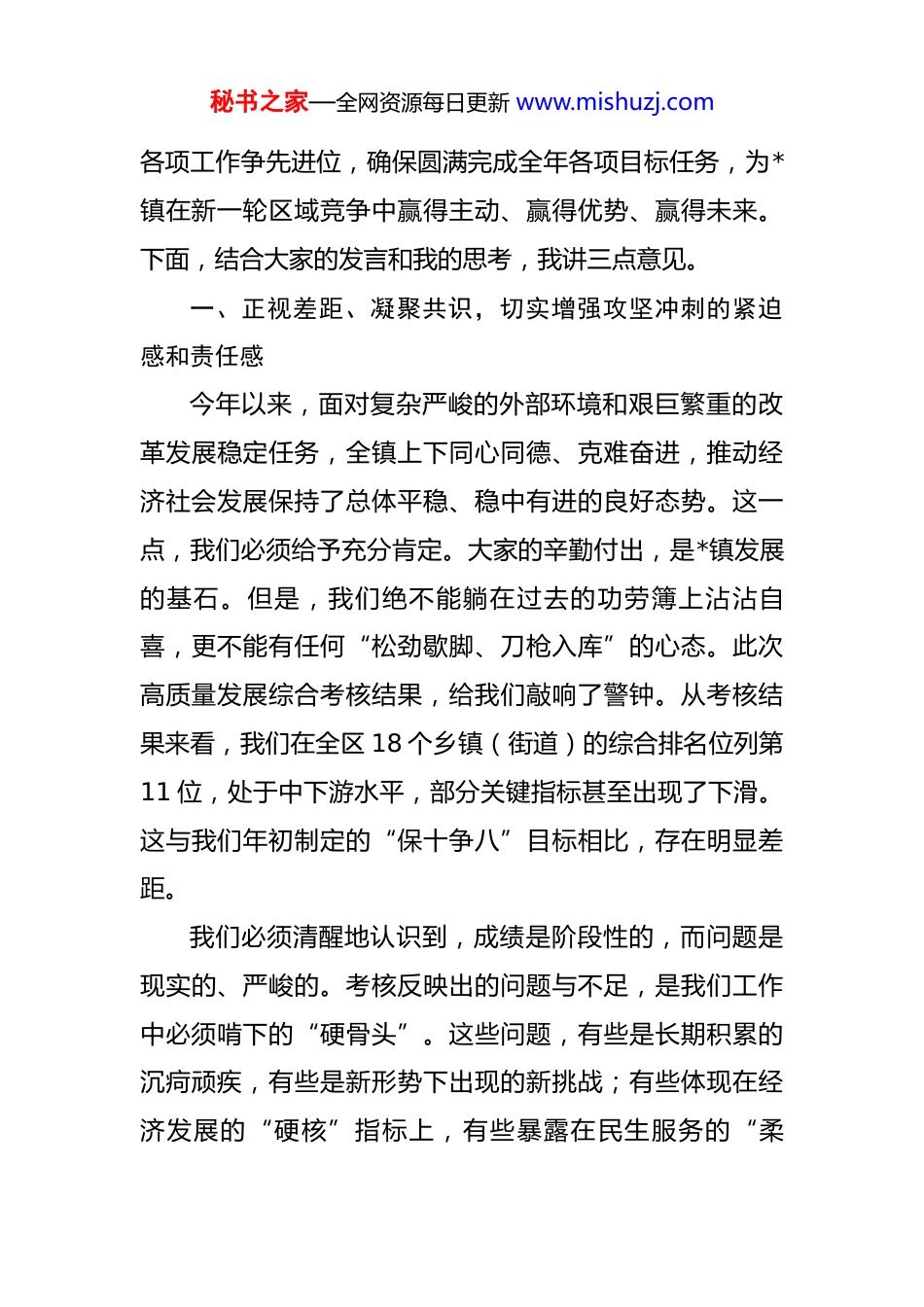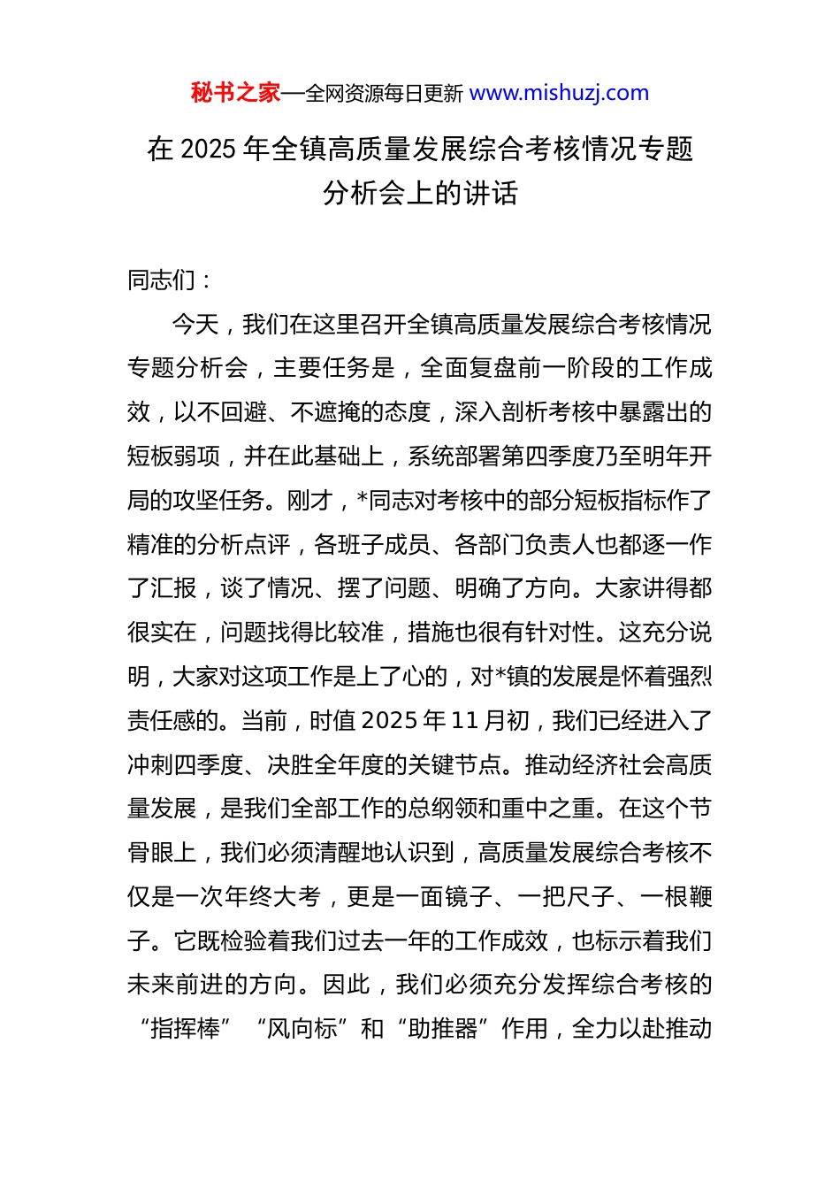 秘书之家—全网资源每日更新 www.mishuzj.com在 2025 年全镇高质量发展综合考核情况专题分析会上的讲话 同志们:今天,我们在这里召开全镇高质量发展综合考核情况专题分析会,主要任务是,全面复盘前一阶段的工作成效,以不回避、不遮掩的态度,深入剖析考核中暴露出的短板弱项,并在此基础上,系统部署第四季度乃至明年开局的攻坚任务。刚才,*同志对考核中的部分短板指标作了精准的分析点评,各班子成员、各部门负责人也都逐一作了汇报,谈了情况、摆了问题、明确了方向。大家讲得都很实在,问题找得比较准,措施也很有针对性。这充分说明,大家对这项工作是上了心的,对*镇的发展是怀着强烈责任感的。当前,时值 2025 年 11 月初,我们已经进入了冲刺四季度、决胜全年度的关键节点。推动经济社会高质量发展,是我们全部工作的总纲领和重中之重。在这个节骨眼上,我们必须清醒地认识到,高质量发展综合考核不仅是一次年终大考,更是一面镜子、一把尺子、一根鞭子。它既检验着我们过去一年的工作成效,也标示着我们未来前进的方向。因此,我们必须充分发挥综合考核的“指挥棒”“风向标”和“助推器”作用,全力以赴推动秘书之家—全网资源每日更新 www.mishuzj.com各项工作争先进位,确保圆满完成全年各项目标任务,为*镇在新一轮区域竞争中赢得主动、赢得优势、赢得未来。下面,结合大家的发言和我的思考,我讲三点意见。一、正视差距、凝聚共识,切实增强攻坚冲刺的紧迫感和责任感今年以来,面对复杂严峻的外部环境和艰巨繁重的改革发展稳定任务,全镇上下同心同德、克难奋进,推动经济社会发展保持了总体平稳、稳中有进的良好态势。这一点,我们必须给予充分肯定。大家的辛勤付出,是*镇发展的基石。但是,我们绝不能躺在过去的功劳簿上沾沾自喜,更不能有任何“松劲歇脚、刀枪入库”的心态。此次高质量发展综合考核结果,给我们敲响了警钟。从考核结果来看,我们在全区 18 个乡镇(街道)的综合排名位列第11 位,处于中下游水平,部分关键指标甚至出现了下滑。这与我们年初制定的“保十争八”目标相比,存在明显差距。我们必须清醒地认识到,成绩是阶段性的,而问题是现实的、严峻的。考核反映出的问题与不足,是我们工作中必须啃下的“硬骨头”。这些问题,有些是长期积累的沉疴顽疾,有些是新形势下出现的新挑战;有些体现在经济发展的“硬核”指标上,有些暴露在民生服务的“柔秘书之家—全网资源每日更新 www.mishuzj.com软”环节中。我们不能把这些问题简单归结于外部环境的影响,更不能以“大家都有类似问题”为借口来寻求自我安慰。逆水行舟,不进则退;慢进,亦是退。我们必须以此次考核结果为镜鉴,深刻反思、深挖根源,把思想和行动迅速统一到区委、区政府的决策部署上来,统一到“补短板、强弱项、促提升”的工作主线上来。全镇上下要牢固树立“不进是过、慢进也是过”的危机意识,切实把考核压力转化为冲刺四季度的强大动力,以“坐不住等不起、慢不得”的姿态,向问题叫板,拿成果说话。二、聚焦短板、精准施策,全力提升整改落实的穿透力和实效性距离年底只剩下两个月时间,时间紧、任务重、要求高。我们必须坚持问题导向、目标导向、结果导向相统一,拿出“分秒必争、寸土不让”的拼劲和韧劲,针对考核中暴露出的各项短板弱项,逐项分析、靶向施策、挂图作战,全力推动各项工作落地见效。(一)紧盯经济运行“主引擎”,筑牢高质量发展的“硬支撑”。经济发展是高质量发展的基石,项目建设是经济发展的生命线。此次考核中,我们的经济类指标失分较为严重,必须引起高度警惕。数据显示,我们前三季度的固定资产投资增速为 4.8%,低于全区平均水平 2 个百分秘书之家—全网资源每日更新 www.mishuzj.com点;规上工业增加值增速虽然达到了 6.5%,但在全区的排位中仅列第 13 位;招商引资新签约项目开工转化率仅为55%,多个计划在上半年开工的项目至今仍在“纸上画图”。这些数据背后,是我们在抓经济、抓项目上的力度还不够大、办法还不够多、成效还不够实。下一步,我们必须牢固树立“经济运行是头版头条、项目建设是生命线”的意识。经济发...