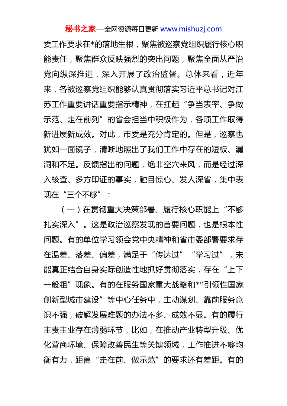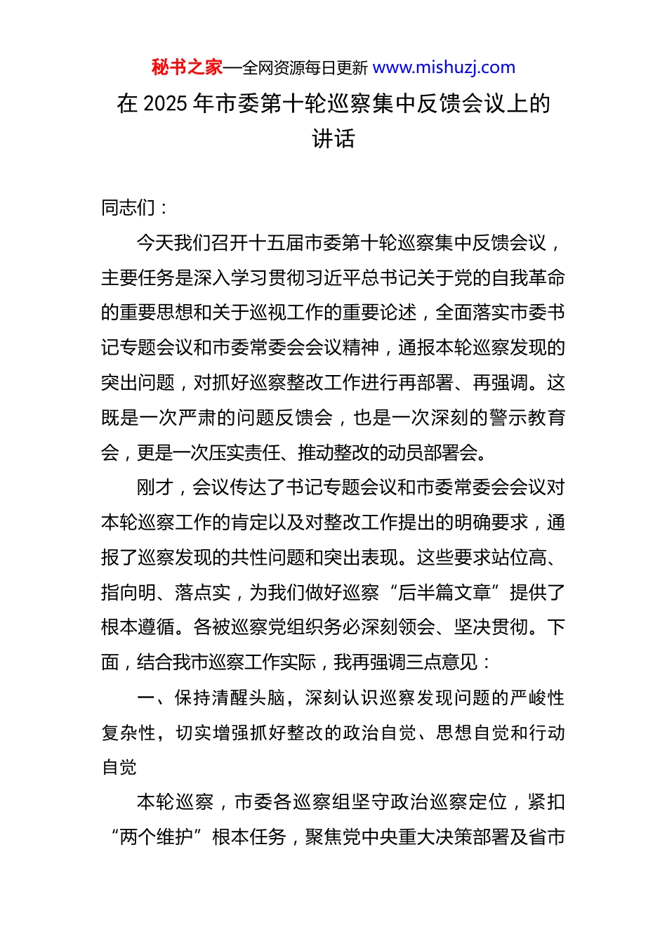 秘书之家—全网资源每日更新 www.mishuzj.com在 2025 年市委第十轮巡察集中反馈会议上的讲话 同志们:今天我们召开十五届市委第十轮巡察集中反馈会议,主要任务是深入学习贯彻习近平总书记关于党的自我革命的重要思想和关于巡视工作的重要论述,全面落实市委书记专题会议和市委常委会会议精神,通报本轮巡察发现的突出问题,对抓好巡察整改工作进行再部署、再强调。这既是一次严肃的问题反馈会,也是一次深刻的警示教育会,更是一次压实责任、推动整改的动员部署会。刚才,会议传达了书记专题会议和市委常委会会议对本轮巡察工作的肯定以及对整改工作提出的明确要求,通报了巡察发现的共性问题和突出表现。这些要求站位高、指向明、落点实,为我们做好巡察“后半篇文章”提供了根本遵循。各被巡察党组织务必深刻领会、坚决贯彻。下面,结合我市巡察工作实际,我再强调三点意见:一、保持清醒头脑,深刻认识巡察发现问题的严峻性复杂性,切实增强抓好整改的政治自觉、思想自觉和行动自觉本轮巡察,市委各巡察组坚守政治巡察定位,紧扣“两个维护”根本任务,聚焦党中央重大决策部署及省市秘书之家—全网资源每日更新 www.mishuzj.com委工作要求在*的落地生根,聚焦被巡察党组织履行核心职能责任,聚焦群众反映强烈的突出问题,聚焦全面从严治党向纵深推进,深入开展了政治监督。总体来看,近年来,各被巡察党组织能够认真贯彻落实习近平总书记对江苏工作重要讲话重要指示精神,在扛起“争当表率、争做示范、走在前列”的省会担当中积极作为,各项工作取得新进展新成效。对此,市委是充分肯定的。但是,巡察也犹如一面镜子,清晰地照出了我们工作中存在的短板、漏洞和不足。反馈指出的问题,绝非空穴来风,而是经过深入核查、多方印证的事实,触目惊心、发人深省,集中表现在“三个不够”:(一)在贯彻重大决策部署、履行核心职能上“不够扎实深入”。这是政治巡察发现的首要问题,也是根本性问题。有的单位学习领会党中央精神和省市委部署要求存在温差、落差、偏差,满足于“传达过”“学习过”,未能真正结合自身实际创造性地抓好贯彻落实,存在“上下一般粗”现象。有的在服务国家重大战略和*“引领性国家创新型城市建设”等中心任务中,主动谋划、靠前服务意识不强,破解发展难题的办法不多、成效不显。有的履行主责主业存在薄弱环节,比如,在推动产业转型升级、优化营商环境、保障改善民生等关键领域,工作推进不够均衡有力,距离“走在前、做示范”的要求还有差距。有的秘书之家—全网资源每日更新 www.mishuzj.com单位“新官不理旧账”,对历史遗留问题能拖则拖、能绕则绕,缺乏攻坚克难的担当。(二)在防范化解风险、强化监督管理上“不够到位严密”。风险意识不强、防控措施不力、监管存在盲区的问题在一些领域依然突出。有的对财政资金、国有资产、公共资源交易等重点领域的风险隐患缺乏系统排查和有效应对,监管制度形同虚设或执行走样。比如,在工程项目招投标、政府采购、国资运营等方面,仍存在程序不规范、监管不到位甚至利益输送的隐患。有的对意识形态、安全生产、金融债务、社会稳定等领域的风险敏感性不足,预见性不强,未能做到抓早抓小、防患于未然。有的内部管理松弛,权力运行监督制约机制不健全,特别是对下属单位、关键岗位、重点人员的监督管理失之于宽、失之于软,存在“灯下黑”风险。(三)在坚持严的基调、深化管党治党上“不够坚强有力”。全面从严治党永远在路上,但一些单位压力传导层层递减的问题依然存在。有的党组织履行主体责任意识不强,“一把手”第一责任人责任和班子成员“一岗双责”落实不到位,对党员干部日常教育管理监督不够严格,存在“好人主义”思想。有的落实中央八项规定及其实施细则精神不够坚决彻底,“四风”问题特别是形式主义、官僚主义禁而未绝,比如,文山会海、过度留痕、检秘书之家—全网资源每日更新 www.mishuzj.com查考核过多过滥等隐形变异问题有所反弹,加重了基层负担。有的干部队伍建设和选人用人工作存在短板,干部能力素质与新时代新任务要求不相适应,激励担当作为的机制尚不完善。尤其需要警醒的是...
