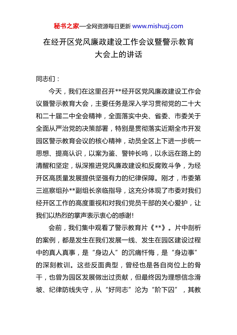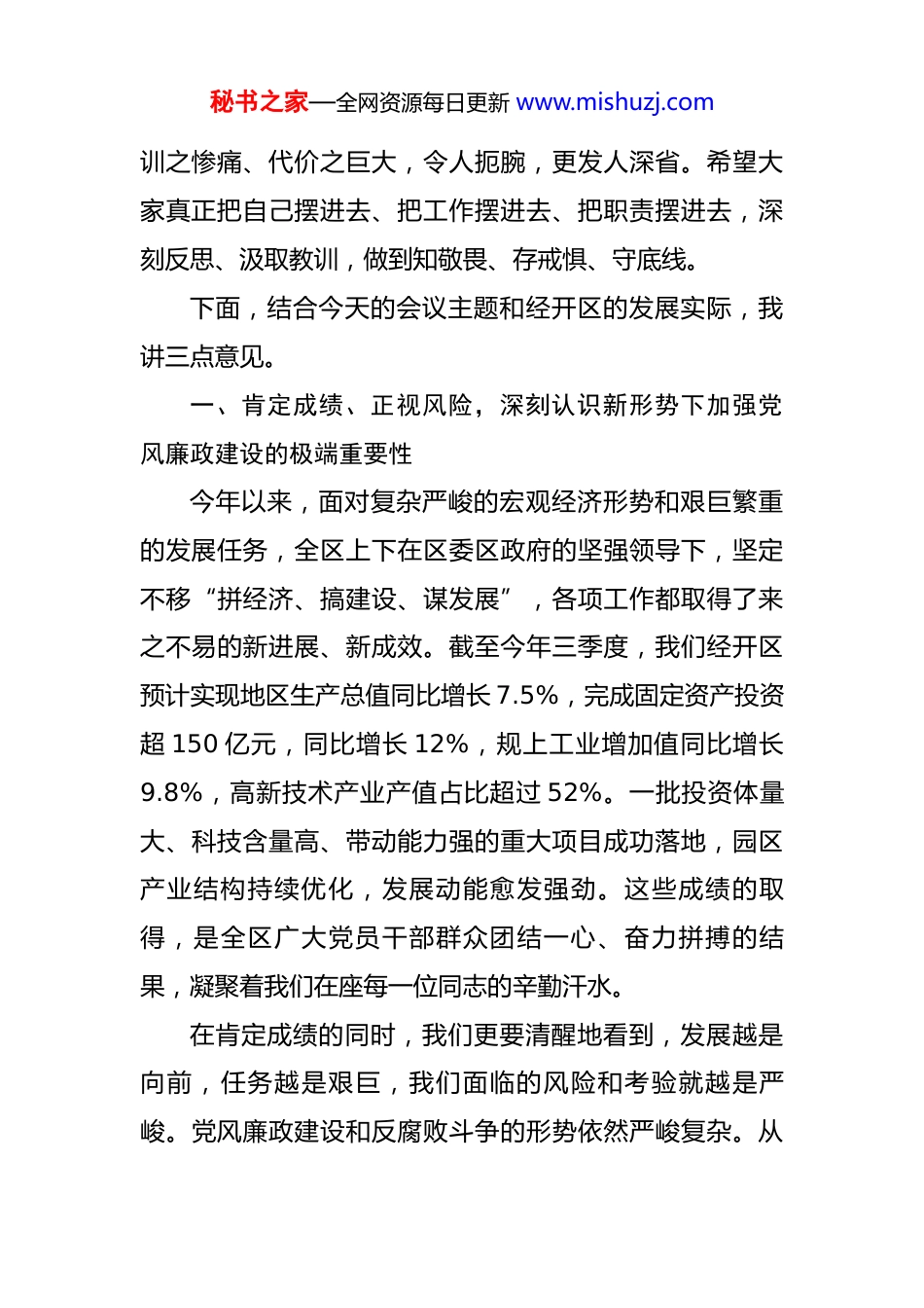 秘书之家—全网资源每日更新 www.mishuzj.com在经开区党风廉政建设工作会议暨警示教育大会上的讲话 同志们:今天,我们在这里召开**经开区党风廉政建设工作会议暨警示教育大会,主要任务是深入学习贯彻党的二十大和二十届二中全会精神,全面落实中央、省委、市委关于全面从严治党的决策部署,特别是贯彻落实近期全市开发园区警示教育会议的核心精神,动员全区上下进一步统一思想、提高认识,以案为鉴、警钟长鸣,以永远在路上的清醒和坚定,纵深推进党风廉政建设和反腐败斗争,为经开区高质量发展提供坚强有力的纪律保障。刚才,市委第三巡察组孙**副组长亲临指导,这充分体现了市委对我们经开区工作的高度重视和对我们党员干部的关心爱护,让我们以热烈的掌声表示衷心的感谢!会前,我们集中观看了警示教育片《**》。片中剖析的案例,都是发生在我们发展一线、发生在园区建设过程中的真人真事,是“身边人”的沉痛忏悔,是“身边事”的深刻教训。这些反面典型,曾经也是各自岗位上的骨干,也曾为园区发展做出过贡献,但最终因为理想信念滑坡、纪律防线失守,从“好同志”沦为“阶下囚”,其教秘书之家—全网资源每日更新 www.mishuzj.com训之惨痛、代价之巨大,令人扼腕,更发人深省。希望大家真正把自己摆进去、把工作摆进去、把职责摆进去,深刻反思、汲取教训,做到知敬畏、存戒惧、守底线。下面,结合今天的会议主题和经开区的发展实际,我讲三点意见。一、肯定成绩、正视风险,深刻认识新形势下加强党风廉政建设的极端重要性今年以来,面对复杂严峻的宏观经济形势和艰巨繁重的发展任务,全区上下在区委区政府的坚强领导下,坚定不移“拼经济、搞建设、谋发展”,各项工作都取得了来之不易的新进展、新成效。截至今年三季度,我们经开区预计实现地区生产总值同比增长 7.5%,完成固定资产投资超 150 亿元,同比增长 12%,规上工业增加值同比增长9.8%,高新技术产业产值占比超过 52%。一批投资体量大、科技含量高、带动能力强的重大项目成功落地,园区产业结构持续优化,发展动能愈发强劲。这些成绩的取得,是全区广大党员干部群众团结一心、奋力拼搏的结果,凝聚着我们在座每一位同志的辛勤汗水。在肯定成绩的同时,我们更要清醒地看到,发展越是向前,任务越是艰巨,我们面临的风险和考验就越是严峻。党风廉政建设和反腐败斗争的形势依然严峻复杂。从秘书之家—全网资源每日更新 www.mishuzj.com我们观看的警示教育片,以及近年来查处的一些开发园区违纪违法案件来看,腐败问题在一些领域依然易发多发,廉政风险不容忽视。这些问题,不仅严重损害了党和政府的形象,更严重破坏了我们经开区来之不易的营商环境和政治生态,侵蚀着我们高质量发展的根基。我们必须深刻认识到,党风廉政建设是具体的,不是虚的。它与我们的每一项工作、每一个项目、每一分资金都息息相关。一个地方的发展,短期看项目,中期看政策,长期看环境。而这个环境,最重要的就是风清气正的政治生态和廉洁高效的营商环境。如果我们的干部队伍出了问题,吃拿卡要、优亲厚友、与企争利,甚至以权谋私、贪污腐败,那么再好的蓝图也无法实现,再大的投资也会望而却步。可以说,抓不好党风廉政建设,我们前面取得的一切成绩都可能化为乌有,我们未来的发展目标就是空中楼阁。因此,全区各级党组织和全体党员干部必须站在政治和全局的高度,深刻认识加强党风廉政建设的极端重要性和现实紧迫性,切实增强忧患意识和责任意识。我们决不能有“看戏”心态,觉得片中人是“他”,与己无关;决不能有“侥幸”心理,认为偶尔越界无伤大雅;更不能有“麻痹”思想,觉得身处发展一线,只要能干事、能出业秘书之家—全网资源每日更新 www.mishuzj.com绩,作风纪律方面的小问题就可以被原谅。必须时刻保持“赶考”的清醒,以“零容忍”的态度惩治腐败,以抓铁有痕、踏石留印的决心狠抓作风建设,为经开区这艘航船行稳致远保驾护航。二、以案为鉴、深挖根源,精准把握开发园区廉政风险的关键点和要害处警示教育片中的案例,就像一面镜子,照出了当前开发园区在快速发展过程中容易滋生腐败的几个关键领域和共性问题。...