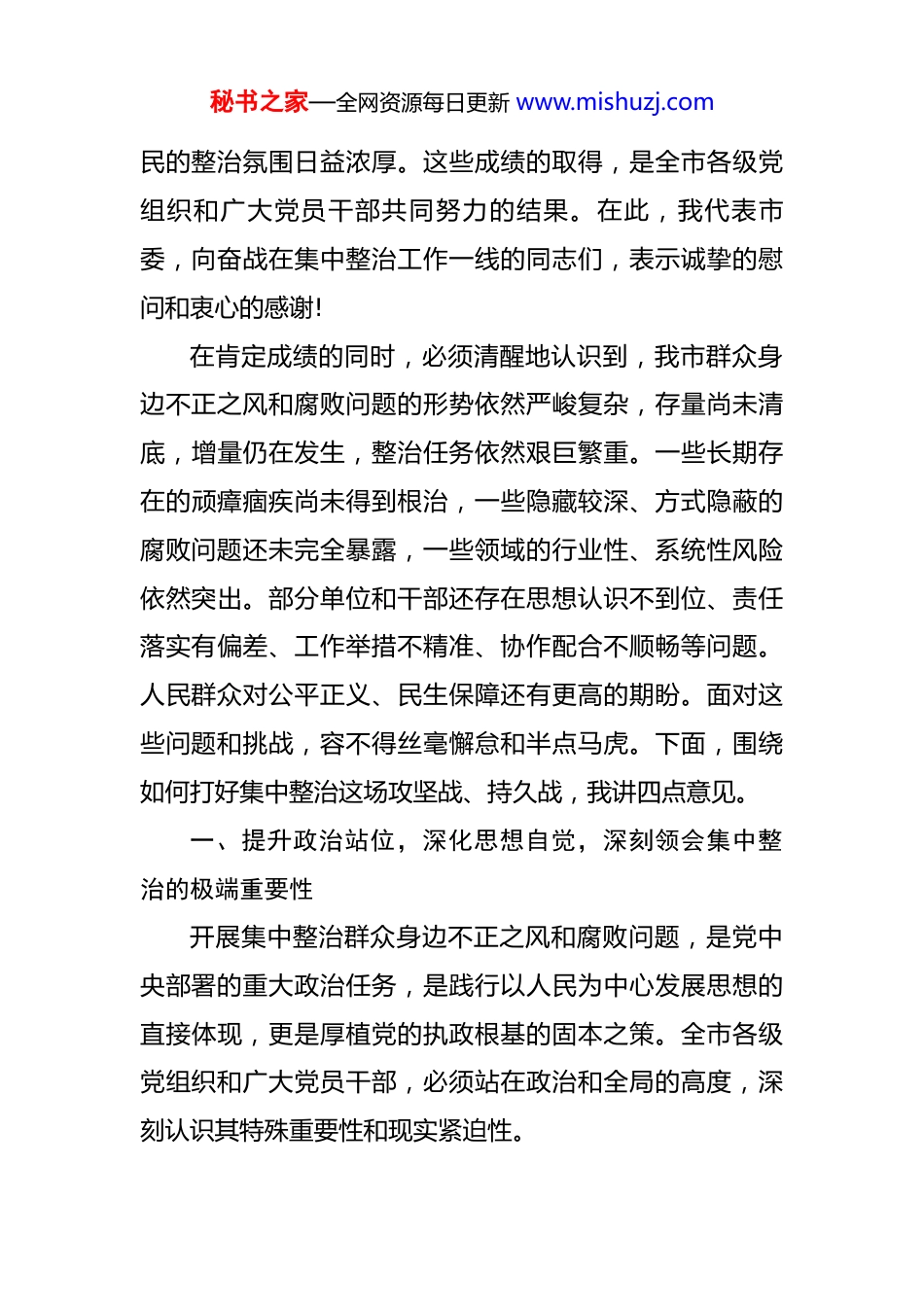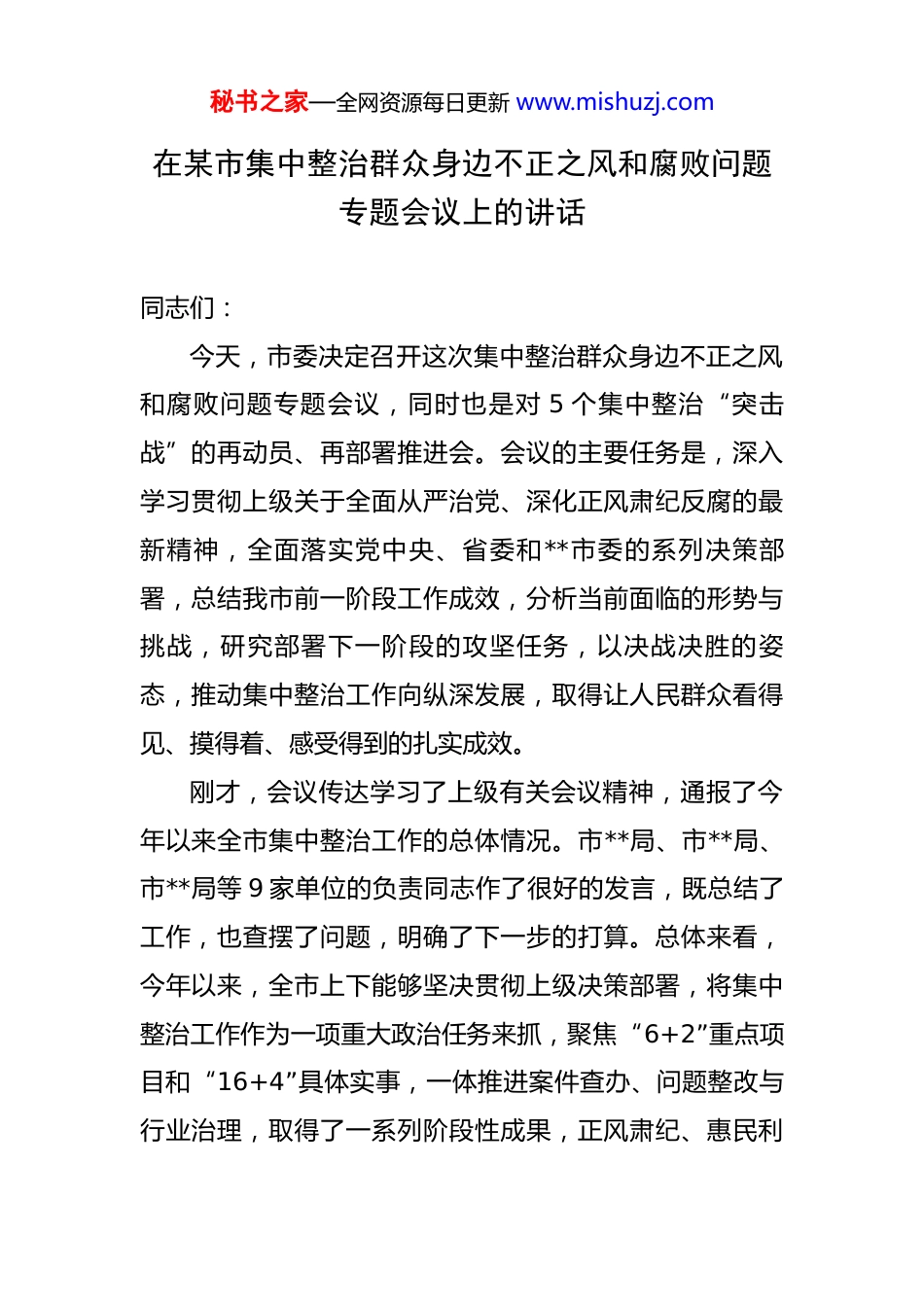 秘书之家—全网资源每日更新 www.mishuzj.com在某市集中整治群众身边不正之风和腐败问题专题会议上的讲话 同志们:今天,市委决定召开这次集中整治群众身边不正之风和腐败问题专题会议,同时也是对 5 个集中整治“突击战”的再动员、再部署推进会。会议的主要任务是,深入学习贯彻上级关于全面从严治党、深化正风肃纪反腐的最新精神,全面落实党中央、省委和**市委的系列决策部署,总结我市前一阶段工作成效,分析当前面临的形势与挑战,研究部署下一阶段的攻坚任务,以决战决胜的姿态,推动集中整治工作向纵深发展,取得让人民群众看得见、摸得着、感受得到的扎实成效。刚才,会议传达学习了上级有关会议精神,通报了今年以来全市集中整治工作的总体情况。市**局、市**局、市**局等 9 家单位的负责同志作了很好的发言,既总结了工作,也查摆了问题,明确了下一步的打算。总体来看,今年以来,全市上下能够坚决贯彻上级决策部署,将集中整治工作作为一项重大政治任务来抓,聚焦“6+2”重点项目和“16+4”具体实事,一体推进案件查办、问题整改与行业治理,取得了一系列阶段性成果,正风肃纪、惠民利秘书之家—全网资源每日更新 www.mishuzj.com民的整治氛围日益浓厚。这些成绩的取得,是全市各级党组织和广大党员干部共同努力的结果。在此,我代表市委,向奋战在集中整治工作一线的同志们,表示诚挚的慰问和衷心的感谢!在肯定成绩的同时,必须清醒地认识到,我市群众身边不正之风和腐败问题的形势依然严峻复杂,存量尚未清底,增量仍在发生,整治任务依然艰巨繁重。一些长期存在的顽瘴痼疾尚未得到根治,一些隐藏较深、方式隐蔽的腐败问题还未完全暴露,一些领域的行业性、系统性风险依然突出。部分单位和干部还存在思想认识不到位、责任落实有偏差、工作举措不精准、协作配合不顺畅等问题。人民群众对公平正义、民生保障还有更高的期盼。面对这些问题和挑战,容不得丝毫懈怠和半点马虎。下面,围绕如何打好集中整治这场攻坚战、持久战,我讲四点意见。一、提升政治站位,深化思想自觉,深刻领会集中整治的极端重要性开展集中整治群众身边不正之风和腐败问题,是党中央部署的重大政治任务,是践行以人民为中心发展思想的直接体现,更是厚植党的执政根基的固本之策。全市各级党组织和广大党员干部,必须站在政治和全局的高度,深刻认识其特殊重要性和现实紧迫性。秘书之家—全网资源每日更新 www.mishuzj.com第一,必须将集中整治作为检验政治忠诚的“试金石”。政治忠诚不是抽象的口号,而是具体的行动。检验是否对党忠诚,一个重要的标尺就是看能否不折不扣地贯彻落实党中央的决策部署。此次集中整治,就是具体的“国之大者”。全市上下要严格落实“第一议题”制度,持续深入学习领会中央关于全面从严治党的新论述、新要求,时刻对标对表,校准思想偏差和行动航向。要把抓好集中整治的实际成效,作为深刻领悟“两个确立”的决定性意义、坚决做到“两个维护”的直接检验。决不能把这项工作看作是纪检监察机关一家的事,更不能有“一阵风”“走过场”的错误心态。要强化政治担当,严明政治规矩,把牢政治标准,确保上级的各项指令在我市得到最坚决、最彻底的执行。第二,必须将集中整治作为赢得民心民意的“关键招”。人心向背是最大的政治。腐败和不正之风,特别是发生在群众身边的“蝇贪蚁腐”,啃食的是群众的获得感,挥霍的是基层群众对党的信任。这些问题看似小事,但直接关系到群众的切身利益,影响极其恶劣。一个项目、一笔补贴、一次执法,都可能成为群众评判党风政风的“窗口”。如果漠视群众的呼声,放任这些问题滋生蔓延,就会动摇党的执政基础。因此,必须下最大气力解决秘书之家—全网资源每日更新 www.mishuzj.com好这些群众“急难愁盼”问题,通过实实在在的整治成效,让群众感受到公平正义就在身边,感受到党的温暖就在身边,从而不断增强人民群众对党的信心、信任和信赖。第三,必须将集中整治作为护航高质量发展的“净化器”。一个地方的营商环境、发展生态,与政治生态密切相关。群众身边的不正之风和腐败问题,不仅损害群众利益,也破坏市场秩序,污染...