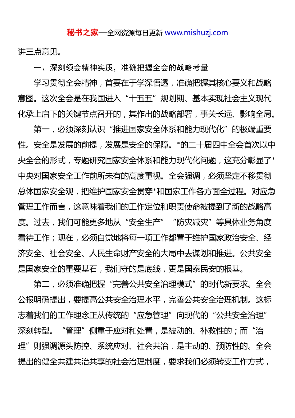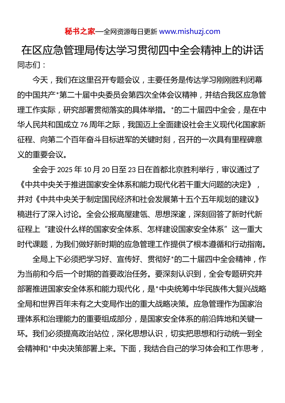 秘书之家—全网资源每日更新 www.mishuzj.com在区应急管理局传达学习贯彻四中全会精神上的讲话同志们:今天,我们在这里召开专题会议,主要任务是传达学习刚刚胜利闭幕的中国共产*第二十届中央委员会第四次全体会议精神,并结合我区应急管理工作实际,研究部署贯彻落实的具体举措。*的二十届四中全会,是在中华人民共和国成立 76 周年之际,我国迈上全面建设社会主义现代化国家新征程、向第二个百年奋斗目标进军的关键时刻,召开的一次具有里程碑意义的重要会议。全会于 2025 年 10 月 20 日至 23 日在首都北京胜利举行,审议通过了《中共中央关于推进国家安全体系和能力现代化若干重大问题的决定》,并对《中共中央关于制定国民经济和社会发展第十五个五年规划的建议》稿进行了深入讨论。全会公报高屋建瓴、思想深邃,深刻回答了新时代新征程上“建设什么样的国家安全体系、怎样建设国家安全体系”这一重大时代课题,为我们做好新时期的应急管理工作提供了根本遵循和行动指南。全局上下必须把学习好、宣传好、贯彻好*的二十届四中全会精神,作为当前和今后一个时期的首要政治任务。要深刻认识到,全会专题研究并部署推进国家安全体系和能力现代化,是*中央统筹中华民族伟大复兴战略全局和世界百年未有之大变局作出的重大战略决策。应急管理作为国家治理体系和治理能力的重要组成部分,是国家安全体系的前沿阵地和关键一环。我们必须提高政治站位,深化思想认识,切实把思想和行动统一到全会精神和*中央决策部署上来。下面,我结合自己的学习体会和工作思考,秘书之家—全网资源每日更新 www.mishuzj.com讲三点意见。一、深刻领会精神实质,准确把握全会的战略考量学习贯彻全会精神,首要在于学深悟透,准确把握其核心要义和战略意图。这次全会是在我国进入“十五五”规划期、基本实现社会主义现代化承上启下的关键节点召开的,其作出的战略部署,事关长远、影响全局。第一,必须深刻认识“推进国家安全体系和能力现代化”的极端重要性。安全是发展的前提,发展是安全的保障。*的二十届四中全会首次以中央全会的形式,专题研究国家安全体系和能力现代化问题,这充分彰显了*中央对国家安全工作前所未有的高度重视。全会强调,必须坚定不移贯彻总体国家安全观,把维护国家安全贯穿*和国家工作各方面全过程。对应急管理工作而言,这意味着我们的工作定位和职责使命被提到了新的战略高度。过去,我们可能更多地从“安全生产”“防灾减灾”等具体业务角度看待工作;现在,必须自觉地将每一项工作都置于维护国家政治安全、经济安全、社会安全、人民生命财产安全的大局中去谋划和推进。公共安全是国家安全的重要基石,我们守的是底线,更是国泰民安的根基。第二,必须准确把握“完善公共安全治理模式”的时代新要求。全会公报明确提出,要提高公共安全治理水平,完善公共安全治理机制。这标志着我们的工作理念正从传统的“应急管理”向现代的“公共安全治理”深刻转型。“管理”侧重于应对和处置,是被动的、补救性的;而“治理”则强调源头防控、系统应对、社会共治,是主动的、预防性的。全会提出的健全共建共治共享的社会治理制度,要求我们必须转变工作方式,秘书之家—全网资源每日更新 www.mishuzj.com不能再仅仅满足于“不出事”,而是要构建一个风险可知、可控、可防的韧性社会环境。这需要我们推动应急管理的触角向社会治理的“神经末梢”延伸,发动更广泛的社会力量参与,形成人人有责、人人尽责、人人享有的公共安全治理共同体。第三,必须清醒认识“统筹发展和安全”面临的新挑战。当前,世界进入新的动荡变革期,我国发展面临的内外环境日趋复杂,不确定、难预料因素显著增多。全会强调要健全国家安全风险监测预警体系,这正是对当前复杂形势的精准回应。就我们 x 区而言,作为 x 市的核心城区之一,经济活跃、人口密集、新业态新领域不断涌现。高层建筑、地下空间、大型商业综合体、交通枢纽等风险点位高度集中;同时,随着城市更新加速,各类建设工程点多面广,传统风险与新型风险交织叠加。比如,人工智能、大数据等新技术在带来发展机遇的同时,也可能...