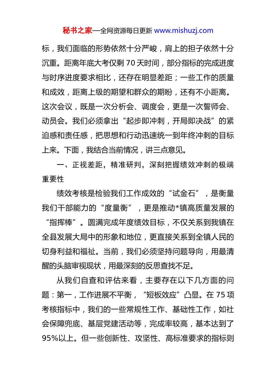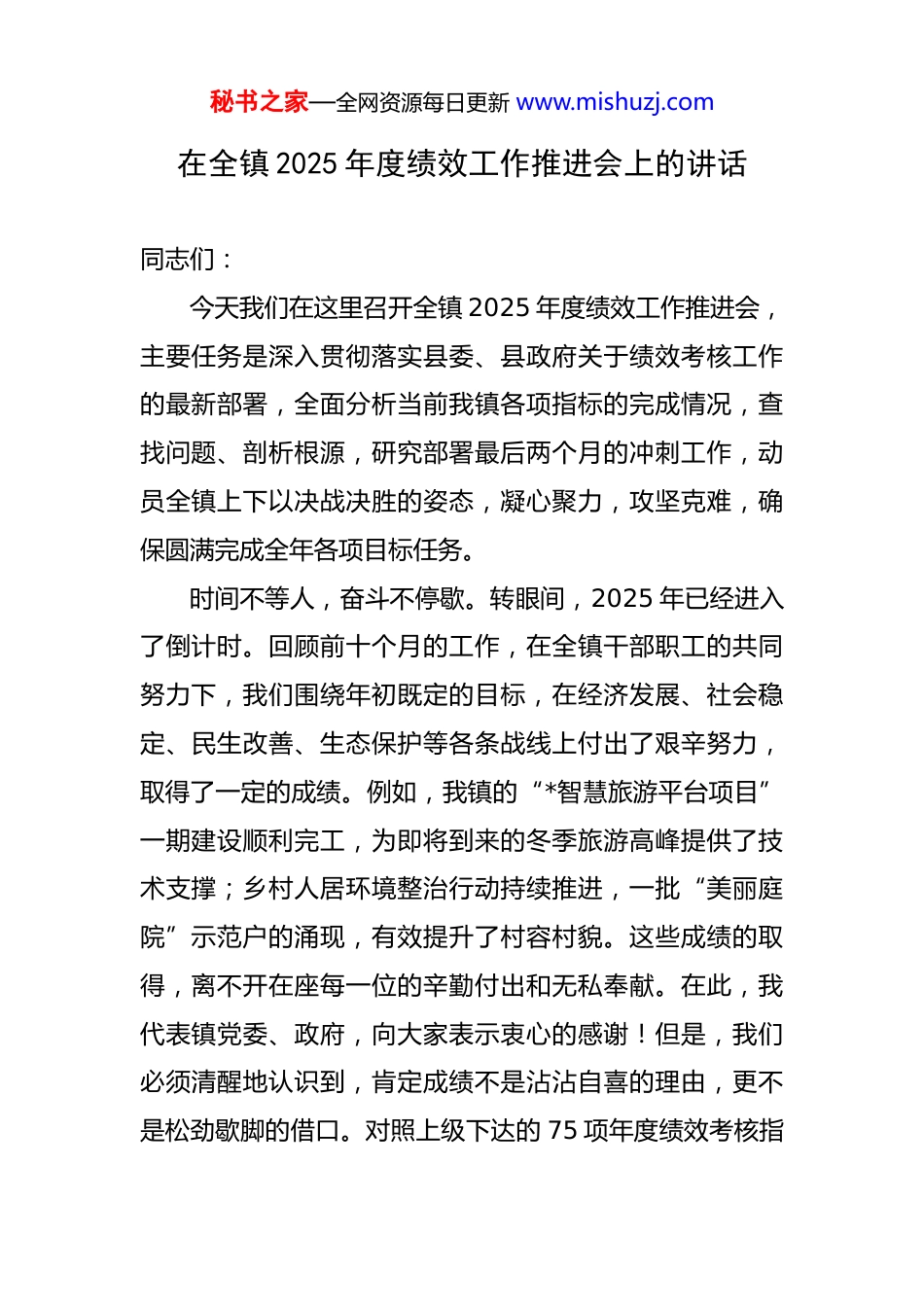 秘书之家—全网资源每日更新 www.mishuzj.com在全镇 2025 年度绩效工作推进会上的讲话 同志们:今天我们在这里召开全镇 2025 年度绩效工作推进会,主要任务是深入贯彻落实县委、县政府关于绩效考核工作的最新部署,全面分析当前我镇各项指标的完成情况,查找问题、剖析根源,研究部署最后两个月的冲刺工作,动员全镇上下以决战决胜的姿态,凝心聚力,攻坚克难,确保圆满完成全年各项目标任务。时间不等人,奋斗不停歇。转眼间,2025 年已经进入了倒计时。回顾前十个月的工作,在全镇干部职工的共同努力下,我们围绕年初既定的目标,在经济发展、社会稳定、民生改善、生态保护等各条战线上付出了艰辛努力,取得了一定的成绩。例如,我镇的“*智慧旅游平台项目”一期建设顺利完工,为即将到来的冬季旅游高峰提供了技术支撑;乡村人居环境整治行动持续推进,一批“美丽庭院”示范户的涌现,有效提升了村容村貌。这些成绩的取得,离不开在座每一位的辛勤付出和无私奉献。在此,我代表镇党委、政府,向大家表示衷心的感谢!但是,我们必须清醒地认识到,肯定成绩不是沾沾自喜的理由,更不是松劲歇脚的借口。对照上级下达的 75 项年度绩效考核指秘书之家—全网资源每日更新 www.mishuzj.com标,我们面临的形势依然十分严峻,肩上的担子依然十分沉重。距离年底大考仅剩 70 天时间,部分指标的完成进度与时序进度要求相比,还存在明显差距;一些工作的质量和成效,距离上级的期望和群众的期盼,还有不小距离。这次会议,既是一次分析会、调度会,更是一次誓师会、动员会。我们必须拿出“起步即冲刺,开局即决战”的紧迫感和责任感,把思想和行动迅速统一到年终冲刺的目标上来。下面,我结合当前情况,讲三点意见。一、正视差距,精准研判,深刻把握绩效冲刺的极端重要性绩效考核是检验我们工作成效的“试金石”,是衡量我们干部能力的“度量衡”,更是推动*镇高质量发展的“指挥棒”。圆满完成年度绩效目标,不仅关系到我镇在全县发展大局中的形象和地位,更直接关系到全镇人民的切身利益和福祉。当前,我们必须坚持问题导向,用最清醒的头脑审视现状,用最深刻的反思查找不足。从我们自查和评估来看,主要存在以下几方面的问题:第一,工作进展不平衡,“短板效应”凸显。在 75 项考核指标中,我们的一些常规性工作、基础性工作,如社会保障兜底、基层党建活动等,完成率较高,基本达到了95%以上。但一些创新性、攻坚性、高标准要求的指标则秘书之家—全网资源每日更新 www.mishuzj.com严重滞后。比如,在经济发展领域,固定资产投资完成率目前仅为 78%,与年度目标的差距较大;在招商引资方面,虽然我们积极对接洽谈,但真正落地生效的合同金额与预期目标相比,还有不小的缺口。在乡村振兴领域,我们的“*特色农产品品牌培育计划”虽然已经启动,但在市场推广和带动农民增收方面的实际效果尚未充分显现,相关效益指标的支撑材料还很薄弱。这种“长短腿”的现象,严重影响了我们的总体得分和发展全局。第二,任务落实不深入,“表层化”现象存在。部分工作看似完成了,但质量不高、成效不显。比如,在人居环境整治工作中,我们虽然组织了多次集中清理行动,但长效管护机制尚未完全建立,一些村组“脏乱差”现象时有反弹,群众满意度未能达到预期。在公共安全领域,安全生产检查的次数和覆盖面足够了,但检查过程中是否真正发现了隐患、是否督促整改到位、是否形成了闭环管理,还需要打一个问号。这种“只求过得去,不求过得硬”的思想,是绩效工作的大忌。上级的考核越来越注重实绩实效,任何形式主义、表面文章都经不起检验。第三,部门协同不紧密,“单打独斗”问题突出。绩效考核的 75 项指标是一个有机整体,许多工作都需要多个部门、多个中心协同作战。但从日常工作来看,“各扫门前雪”的现象依然存秘书之家—全网资源每日更新 www.mishuzj.com在。例如,我镇的“*生态旅游示范带”建设项目,涉及经发办、农业农村办、文旅中心等多个部门,但在实际推进中,存在规划衔接不畅、信息沟通不及时、责任边界不清等问题,导致项目进度慢于预期。有的部门在接到需要协作...