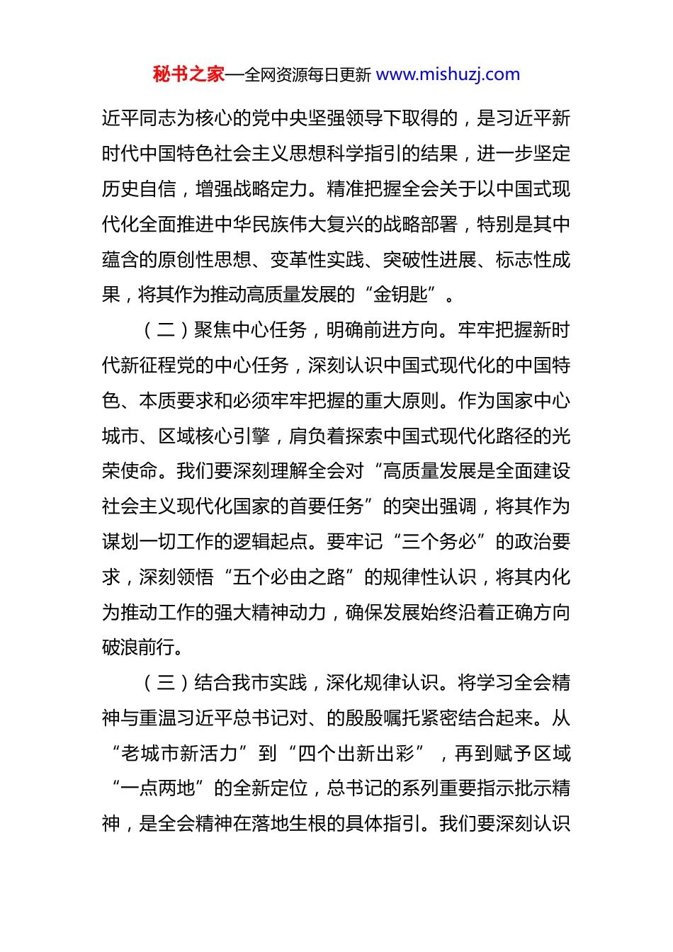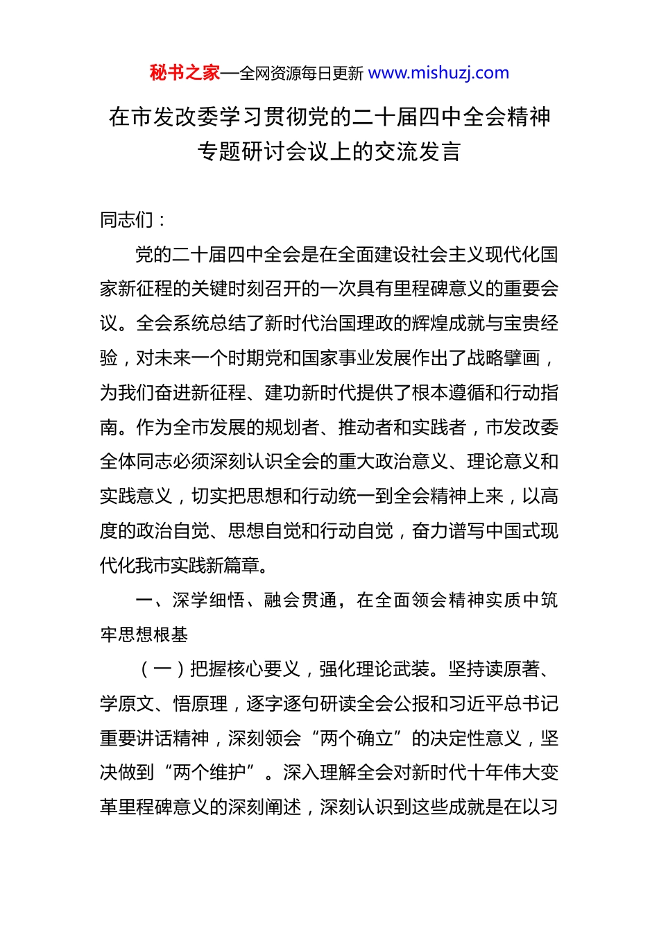 秘书之家—全网资源每日更新 www.mishuzj.com在市发改委学习贯彻党的二十届四中全会精神专题研讨会议上的交流发言 同志们:党的二十届四中全会是在全面建设社会主义现代化国家新征程的关键时刻召开的一次具有里程碑意义的重要会议。全会系统总结了新时代治国理政的辉煌成就与宝贵经验,对未来一个时期党和国家事业发展作出了战略擘画,为我们奋进新征程、建功新时代提供了根本遵循和行动指南。作为全市发展的规划者、推动者和实践者,市发改委全体同志必须深刻认识全会的重大政治意义、理论意义和实践意义,切实把思想和行动统一到全会精神上来,以高度的政治自觉、思想自觉和行动自觉,奋力谱写中国式现代化我市实践新篇章。一、深学细悟、融会贯通,在全面领会精神实质中筑牢思想根基(一)把握核心要义,强化理论武装。坚持读原著、学原文、悟原理,逐字逐句研读全会公报和习近平总书记重要讲话精神,深刻领会“两个确立”的决定性意义,坚决做到“两个维护”。深入理解全会对新时代十年伟大变革里程碑意义的深刻阐述,深刻认识到这些成就是在以习秘书之家—全网资源每日更新 www.mishuzj.com近平同志为核心的党中央坚强领导下取得的,是习近平新时代中国特色社会主义思想科学指引的结果,进一步坚定历史自信,增强战略定力。精准把握全会关于以中国式现代化全面推进中华民族伟大复兴的战略部署,特别是其中蕴含的原创性思想、变革性实践、突破性进展、标志性成果,将其作为推动高质量发展的“金钥匙”。(二)聚焦中心任务,明确前进方向。牢牢把握新时代新征程党的中心任务,深刻认识中国式现代化的中国特色、本质要求和必须牢牢把握的重大原则。作为国家中心城市、区域核心引擎,肩负着探索中国式现代化路径的光荣使命。我们要深刻理解全会对“高质量发展是全面建设社会主义现代化国家的首要任务”的突出强调,将其作为谋划一切工作的逻辑起点。要牢记“三个务必”的政治要求,深刻领悟“五个必由之路”的规律性认识,将其内化为推动工作的强大精神动力,确保发展始终沿着正确方向破浪前行。(三)结合我市实践,深化规律认识。将学习全会精神与重温习近平总书记对、的殷殷嘱托紧密结合起来。从“老城市新活力”到“四个出新出彩”,再到赋予区域“一点两地”的全新定位,总书记的系列重要指示批示精神,是全会精神在落地生根的具体指引。我们要深刻认识秘书之家—全网资源每日更新 www.mishuzj.com到,过去十年在科技创新、产业升级、城市治理、民生改善等方面取得的显著成就,正是贯彻落实党中央决策部署、践行新发展理念的生动体现。要系统梳理在改革开放前沿探索中积累的宝贵经验,将其升华为规律性认识,为未来高质量发展提供坚实支撑。二、创新载体、营造氛围,在全面学习宣传中凝聚奋进力量(一)构建多层次学习矩阵,实现全员覆盖。把学习宣传贯彻全会精神作为当前和今后一个时期的首要政治任务。领导干部要率先垂范,通过理论学习中心组学习、专题读书班等形式,先学一步、学深一层。各党支部要依托“三会一课”、主题党日等载体,组织党员干部原原本本学、深入研讨学。要充分利用“学习强国”平台、干部培训网络学院等线上资源,打造“集中研学+个人自学”、“线上互动+线下交流”的全方位学习格局。邀请权威专家进行深度解读辅导,帮助党员干部准确把握精神实质和政策精髓。(二)打造立体化宣传格局,唱响时代强音。充分发挥传统媒体与新兴媒体融合优势,精心策划宣传主题。在委门户网站、微信公众号开设专题专栏,及时发布学习动态、解读文章和心得体会。利用宣传橱窗、电子显示屏等秘书之家—全网资源每日更新 www.mishuzj.com阵地,营造浓厚学习氛围。主动加强与省市主流媒体的沟通协作,宣传报道我委学习贯彻全会精神的新思路、新举措、新成效,讲好发改人在新时代新征程上担当作为的故事。注重挖掘和宣传基层学习贯彻的典型经验和先进人物,发挥示范引领作用。(三)开展接地气宣讲活动,推动入脑入心。结合领导干部基层联系点制度,组织骨干力量成立宣讲小分队,深入对口联系的区、镇街、企业、项目一线开展对象化、分众化、互动化宣讲。宣讲内容要紧...