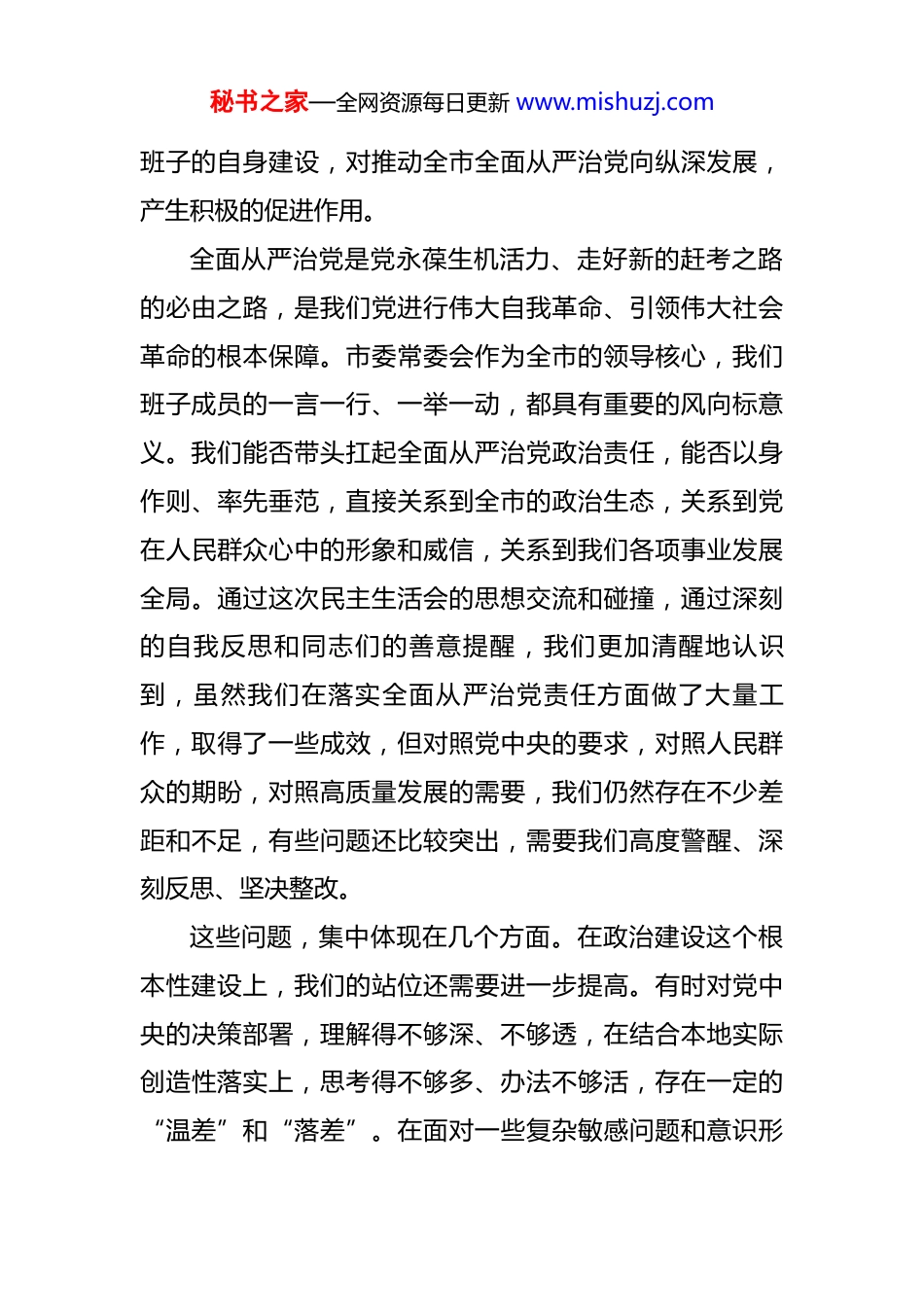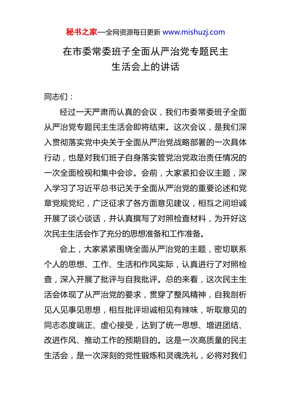 秘书之家—全网资源每日更新 www.mishuzj.com在市委常委班子全面从严治党专题民主生活会上的讲话 同志们:经过一天严肃而认真的会议,我们市委常委班子全面从严治党专题民主生活会即将结束。这次会议,是我们深入贯彻落实党中央关于全面从严治党战略部署的一次具体行动,也是对我们班子自身落实管党治党政治责任情况的一次全面检视和集中会诊。会前,大家紧扣会议主题,深入学习了习近平总书记关于全面从严治党的重要论述和党章党规党纪,广泛征求了各方面意见建议,相互之间坦诚开展了谈心谈话,并认真撰写了对照检查材料,为开好这次民主生活会作了充分的思想准备和工作准备。会上,大家紧紧围绕全面从严治党的主题,密切联系个人的思想、工作、生活和作风实际,认真进行了对照检查,深入开展了批评与自我批评。总的来看,这次民主生活会体现了从严治党的要求,贯穿了整风精神,自我剖析见人见事见思想,相互批评坦诚相见有辣味,听取意见的同志态度端正、虚心接受,达到了统一思想、增进团结、改进作风、推动工作的预期目的。这是一次高质量的民主生活会,是一次深刻的党性锻炼和灵魂洗礼,必将对我们秘书之家—全网资源每日更新 www.mishuzj.com班子的自身建设,对推动全市全面从严治党向纵深发展,产生积极的促进作用。全面从严治党是党永葆生机活力、走好新的赶考之路的必由之路,是我们党进行伟大自我革命、引领伟大社会革命的根本保障。市委常委会作为全市的领导核心,我们班子成员的一言一行、一举一动,都具有重要的风向标意义。我们能否带头扛起全面从严治党政治责任,能否以身作则、率先垂范,直接关系到全市的政治生态,关系到党在人民群众心中的形象和威信,关系到我们各项事业发展全局。通过这次民主生活会的思想交流和碰撞,通过深刻的自我反思和同志们的善意提醒,我们更加清醒地认识到,虽然我们在落实全面从严治党责任方面做了大量工作,取得了一些成效,但对照党中央的要求,对照人民群众的期盼,对照高质量发展的需要,我们仍然存在不少差距和不足,有些问题还比较突出,需要我们高度警醒、深刻反思、坚决整改。这些问题,集中体现在几个方面。在政治建设这个根本性建设上,我们的站位还需要进一步提高。有时对党中央的决策部署,理解得不够深、不够透,在结合本地实际创造性落实上,思考得不够多、办法不够活,存在一定的“温差”和“落差”。在面对一些复杂敏感问题和意识形秘书之家—全网资源每日更新 www.mishuzj.com态领域斗争时,政治敏锐性和政治鉴别力有待加强,斗争精神有时还不够坚决。在强化理论武装上,学习的系统性、深入性还有欠缺,满足于一般性学习多,真正静下心来悟原理、联系实际找方法做得还不够,运用党的创新理论指导实践、破解难题的能力有待提升。在落实主体责任上,我们的压力传导还需要进一步压实。有时存在“上热中温下冷”的现象,对下级党组织特别是“一把手”履行管党治党责任的督促检查不够经常、不够严格,责任追究有时失之于宽、失之于软。在持之以恒正风肃纪上,韧劲和恒心还需要进一步增强。形式主义、官僚主义的顽瘴痼疾尚未根除,一些领域和环节还存在新的表现形式,比如文山会海问题时有反弹,调查研究“走马观花”、“蜻蜓点水”的现象依然存在。对享乐主义、奢靡之风的警惕性需要持续保持,对一些隐形变异的“四风”问题,发现和查处的能力有待提高。在纪律建设这个治本之策上,我们的严格尺度还需要进一步强化。有时存在“好人主义”思想,对干部队伍中一些苗头性、倾向性问题,提醒批评不够及时、不够严厉,怕影响团结、怕伤和气。监督执纪“四种形态”特别是第一种形态的运用还不够充分、不够到位,抓早抓小、防微杜渐的意识和措施需要进一步强化。在严肃党内政治秘书之家—全网资源每日更新 www.mishuzj.com生活上,战斗性原则性还需要进一步锤炼。批评与自我批评的武器用得还不够经常、不够熟练,有时自我批评遮遮掩掩,相互批评隔靴搔痒,“红脸出汗”的效果未能常态化。在廉洁自律这个底线性要求上,我们的标杆作用还需要进一步提升。虽然班子成员自身能够做到廉洁奉公,但对家属和身边工作人员的教育、...