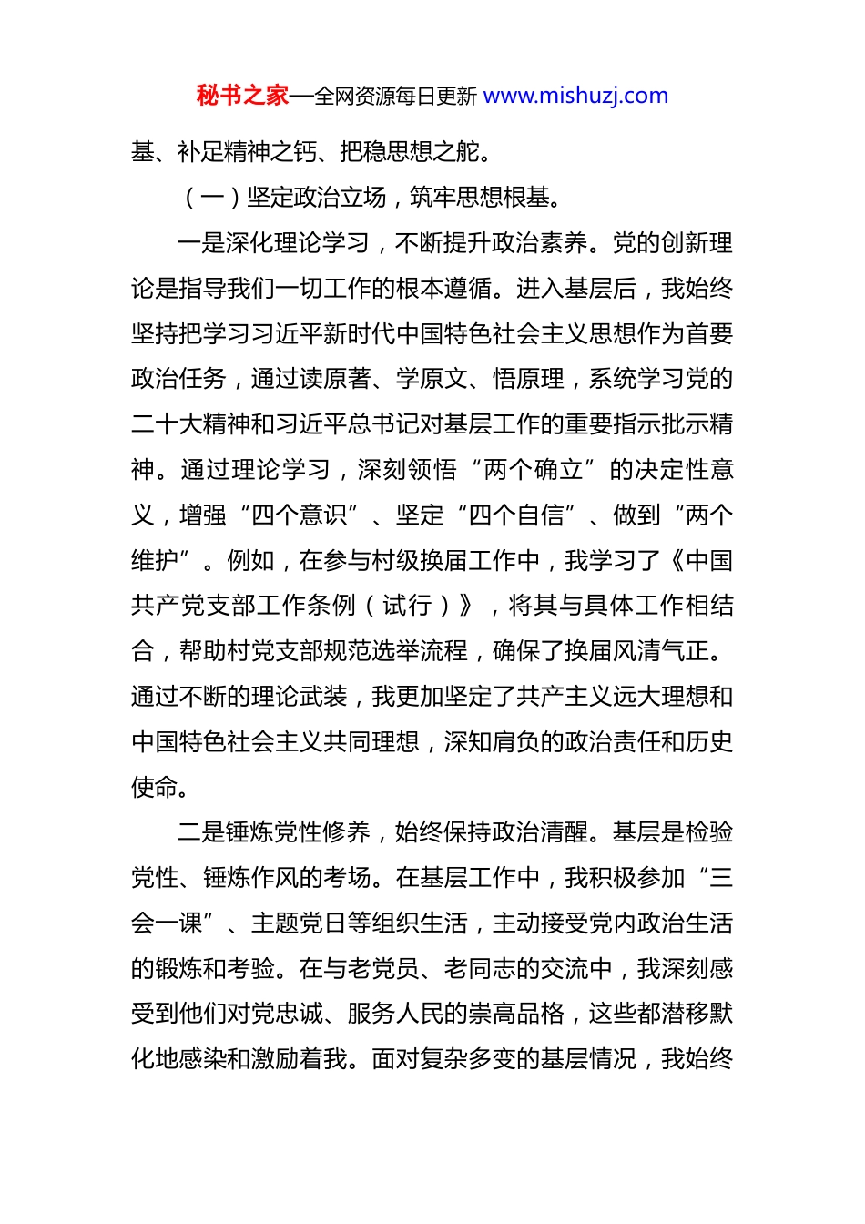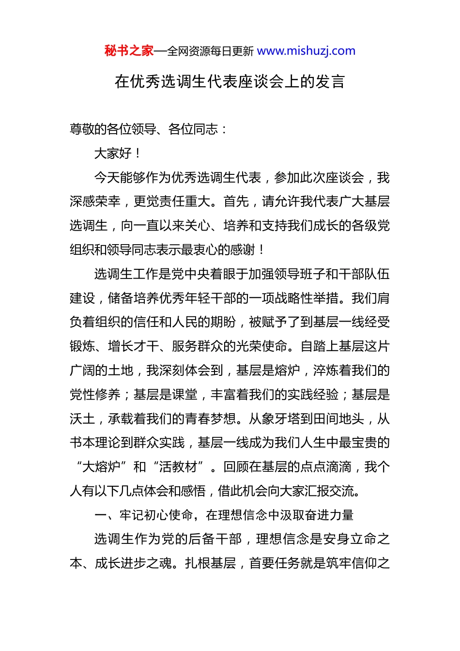 秘书之家—全网资源每日更新 www.mishuzj.com在优秀选调生代表座谈会上的发言 尊敬的各位领导、各位同志:大家好!今天能够作为优秀选调生代表,参加此次座谈会,我深感荣幸,更觉责任重大。首先,请允许我代表广大基层选调生,向一直以来关心、培养和支持我们成长的各级党组织和领导同志表示最衷心的感谢!选调生工作是党中央着眼于加强领导班子和干部队伍建设,储备培养优秀年轻干部的一项战略性举措。我们肩负着组织的信任和人民的期盼,被赋予了到基层一线经受锻炼、增长才干、服务群众的光荣使命。自踏上基层这片广阔的土地,我深刻体会到,基层是熔炉,淬炼着我们的党性修养;基层是课堂,丰富着我们的实践经验;基层是沃土,承载着我们的青春梦想。从象牙塔到田间地头,从书本理论到群众实践,基层一线成为我们人生中最宝贵的“大熔炉”和“活教材”。回顾在基层的点点滴滴,我个人有以下几点体会和感悟,借此机会向大家汇报交流。一、牢记初心使命,在理想信念中汲取奋进力量选调生作为党的后备干部,理想信念是安身立命之本、成长进步之魂。扎根基层,首要任务就是筑牢信仰之秘书之家—全网资源每日更新 www.mishuzj.com基、补足精神之钙、把稳思想之舵。(一)坚定政治立场,筑牢思想根基。一是深化理论学习,不断提升政治素养。党的创新理论是指导我们一切工作的根本遵循。进入基层后,我始终坚持把学习习近平新时代中国特色社会主义思想作为首要政治任务,通过读原著、学原文、悟原理,系统学习党的二十大精神和习近平总书记对基层工作的重要指示批示精神。通过理论学习,深刻领悟“两个确立”的决定性意义,增强“四个意识”、坚定“四个自信”、做到“两个维护”。例如,在参与村级换届工作中,我学习了《中国共产党支部工作条例(试行)》,将其与具体工作相结合,帮助村党支部规范选举流程,确保了换届风清气正。通过不断的理论武装,我更加坚定了共产主义远大理想和中国特色社会主义共同理想,深知肩负的政治责任和历史使命。二是锤炼党性修养,始终保持政治清醒。基层是检验党性、锤炼作风的考场。在基层工作中,我积极参加“三会一课”、主题党日等组织生活,主动接受党内政治生活的锻炼和考验。在与老党员、老同志的交流中,我深刻感受到他们对党忠诚、服务人民的崇高品格,这些都潜移默化地感染和激励着我。面对复杂多变的基层情况,我始终秘书之家—全网资源每日更新 www.mishuzj.com保持政治敏感性和鉴别力,坚持原则,不越底线,在思想上政治上行动上同以习近平同志为核心的中共中央保持高度一致。例如,在处理一些涉及群众切身利益的敏感问题时,我坚持从党的政策出发,从大局着眼,耐心细致地做好解释引导工作,有效化解了矛盾。三是站稳人民立场,厚植为民情怀。我们党的力量来自人民、根基在于人民。作为一名选调生,我始终牢记“为人民服务”的宗旨,把群众的安危冷暖放在心上。初到基层,我便要求自己“脱下学生气,沾上泥土味”,主动深入田间地头、农家小院,与村民同吃同住同劳动,用真心真情换取群众信任。在走访慰问中,我看到乡村振兴的巨大成就,也了解到部分群众在教育、医疗、养老等方面的实际困难。这些都让我更加深刻地理解了“人民至上”的深刻内涵,更加坚定了为人民服务的信念。群众一句朴实的“小伙子,谢谢你”,是最高的褒奖,也是最沉甸甸的动力。(二)感恩组织培养,转化担当动力。一是铭记殷切期望,化为前行引擎。组织对选调生的培养倾注了大量心血,从岗前培训到日常指导,从思想引领到实践帮带,无不体现着组织的关怀和期盼。我时常对照入职时的誓言,反思自己是否做到了忠诚担当、不负韶秘书之家—全网资源每日更新 www.mishuzj.com华。这种期望化作了我在基层攻坚克难的内在动力。每当遇到困难挫折时,我都会想起组织的信任,想起前辈们的教诲,从而坚定信心、迎难而上。组织的培养,是我们基层干部成长最宝贵的财富,更是我们担当作为、干事创业最强大的后盾。二是珍惜基层舞台,不负青春韶华。基层是干事创业的广阔舞台,也是检验真才实学的“试金石”。在基层,我们有幸参与到乡村振兴、基层治理、民生服务等各项...