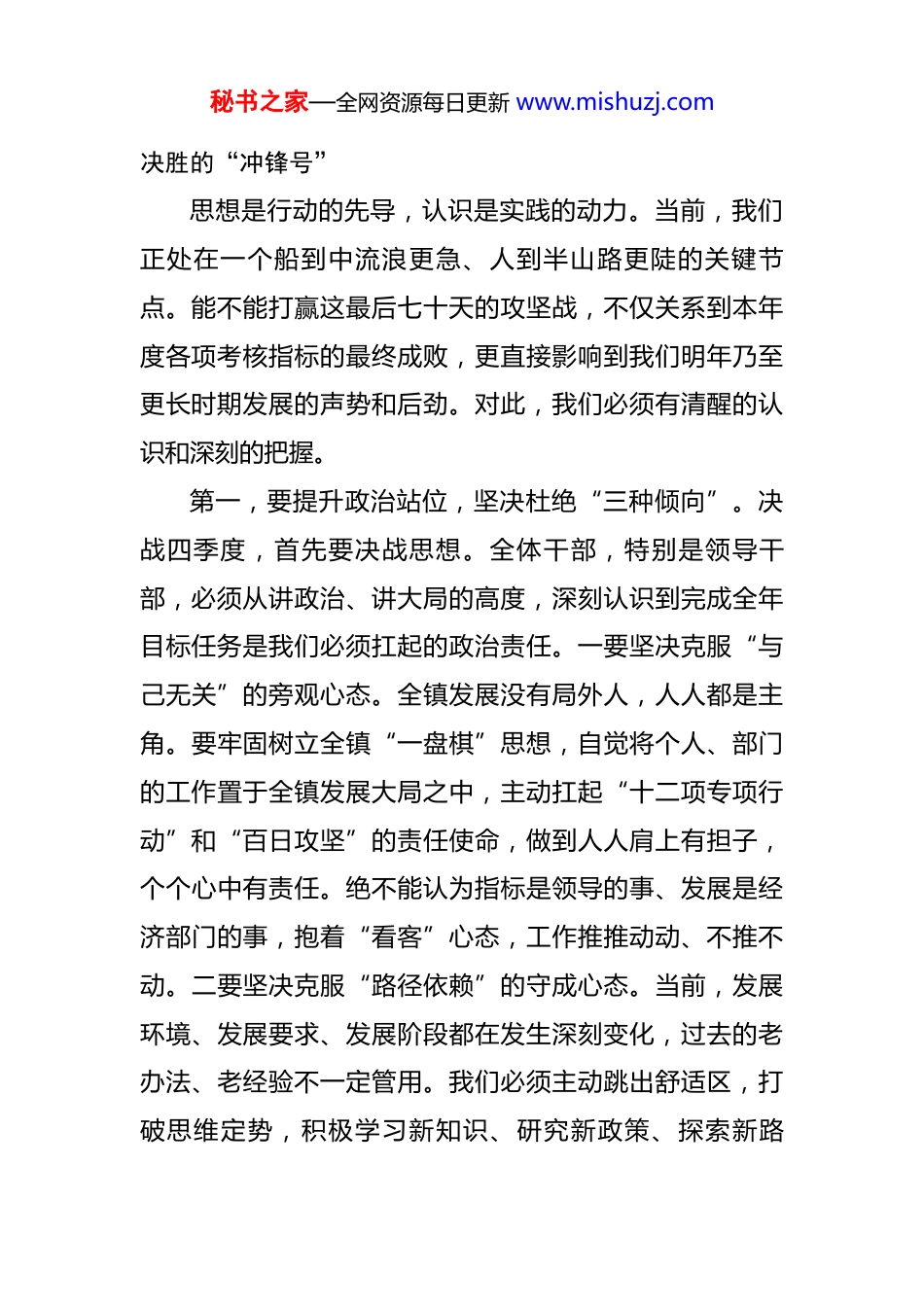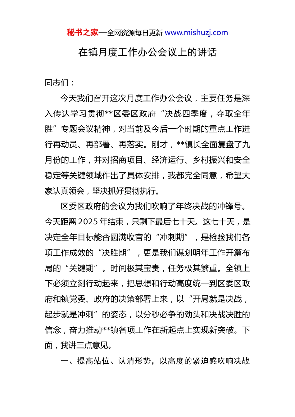 秘书之家—全网资源每日更新 www.mishuzj.com在镇月度工作办公会议上的讲话 同志们:今天我们召开这次月度工作办公会议,主要任务是深入传达学习贯彻**区委区政府“决战四季度,夺取全年胜”专题会议精神,对当前及今后一个时期的重点工作进行再动员、再部署、再落实。刚才,**镇长全面复盘了九月份的工作,并对招商项目、经济运行、乡村振兴和安全稳定等关键领域作出了具体安排,我都完全同意,希望大家认真领会,坚决抓好贯彻执行。区委区政府的会议为我们吹响了年终决战的冲锋号。今天距离 2025 年结束,只剩下最后七十天。这七十天,是决定全年目标能否圆满收官的“冲刺期”,是检验我们各项工作成效的“决胜期”,更是我们谋划明年工作开篇布局的“关键期”。时间极其宝贵,任务极其繁重。全镇上下必须立刻行动起来,把思想和行动高度统一到区委区政府和镇党委、政府的决策部署上来,以“开局就是决战,起步就是冲刺”的姿态,以分秒必争的劲头和决战决胜的信念,奋力推动**镇各项工作在新起点上实现新突破。下面,我讲三点意见。一、提高站位、认清形势,以高度的紧迫感吹响决战秘书之家—全网资源每日更新 www.mishuzj.com决胜的“冲锋号”思想是行动的先导,认识是实践的动力。当前,我们正处在一个船到中流浪更急、人到半山路更陡的关键节点。能不能打赢这最后七十天的攻坚战,不仅关系到本年度各项考核指标的最终成败,更直接影响到我们明年乃至更长时期发展的声势和后劲。对此,我们必须有清醒的认识和深刻的把握。第一,要提升政治站位,坚决杜绝“三种倾向”。决战四季度,首先要决战思想。全体干部,特别是领导干部,必须从讲政治、讲大局的高度,深刻认识到完成全年目标任务是我们必须扛起的政治责任。一要坚决克服“与己无关”的旁观心态。全镇发展没有局外人,人人都是主角。要牢固树立全镇“一盘棋”思想,自觉将个人、部门的工作置于全镇发展大局之中,主动扛起“十二项专项行动”和“百日攻坚”的责任使命,做到人人肩上有担子,个个心中有责任。绝不能认为指标是领导的事、发展是经济部门的事,抱着“看客”心态,工作推推动动、不推不动。二要坚决克服“路径依赖”的守成心态。当前,发展环境、发展要求、发展阶段都在发生深刻变化,过去的老办法、老经验不一定管用。我们必须主动跳出舒适区,打破思维定势,积极学习新知识、研究新政策、探索新路秘书之家—全网资源每日更新 www.mishuzj.com径,以思想的破冰引领行动的突围,主动适应高质量发展的新常态、新要求。三要坚决克服“急于求成”的短视心态。冲刺不等于蛮干,决战更需要智慧。我们要坚持科学冲刺与长远谋划相结合,既要立足当前,全力以赴补短板、强弱项,确保完成硬任务;又要着眼长远,系统谋划明年工作的思路、目标和举措,处理好“显绩”与“潜绩”的关系,做到既为一域争光、又为全局添彩。第二,要对标发展要求,精准建立“三张清单”。目标是奋斗的航标。要将区委区政府下达的任务和我们年初确定的目标,转化为具体可操作的行动指南。一要制定明晰化的“任务清单”。各线、各办、各村(居)要对照全年目标责任状,将每一项指标、每一项任务进行再梳理、再分解,把任务量化到岗、分解到人、进度精确到天,形成挂图作战、倒排工期的工作格局。确保每一项工作都有人抓、有人管、有人负责到底。二要建立动态化的“问题清单”。要敢于直面问题,善于发现问题。通过深入一线调研、召开座谈会、走访企业群众等方式,全面排查当前工作中存在的堵点、难点和痛点。对排查出的问题,要建立台账,逐一分析原因,明确整改措施、责任人和完成时限,实行销号管理,确保问题不解决不松手。三要挖掘前瞻性的“潜力清单”。在全力完成既定目标的同时,要有秘书之家—全网资源每日更新 www.mishuzj.com“跳起来摘桃子”的追求。要深入分析我们的优势所在、潜力所在,积极寻找新的经济增长点、工作闪光点和改革创新点。要在招商引资、项目建设、财源培植、民生改善等方面,自我加压,挖掘潜力,力争在一些关键指标上实现超越,超额完成任务,为全区发展大局作出更大贡献。二、聚焦关键、精准发力,以务...