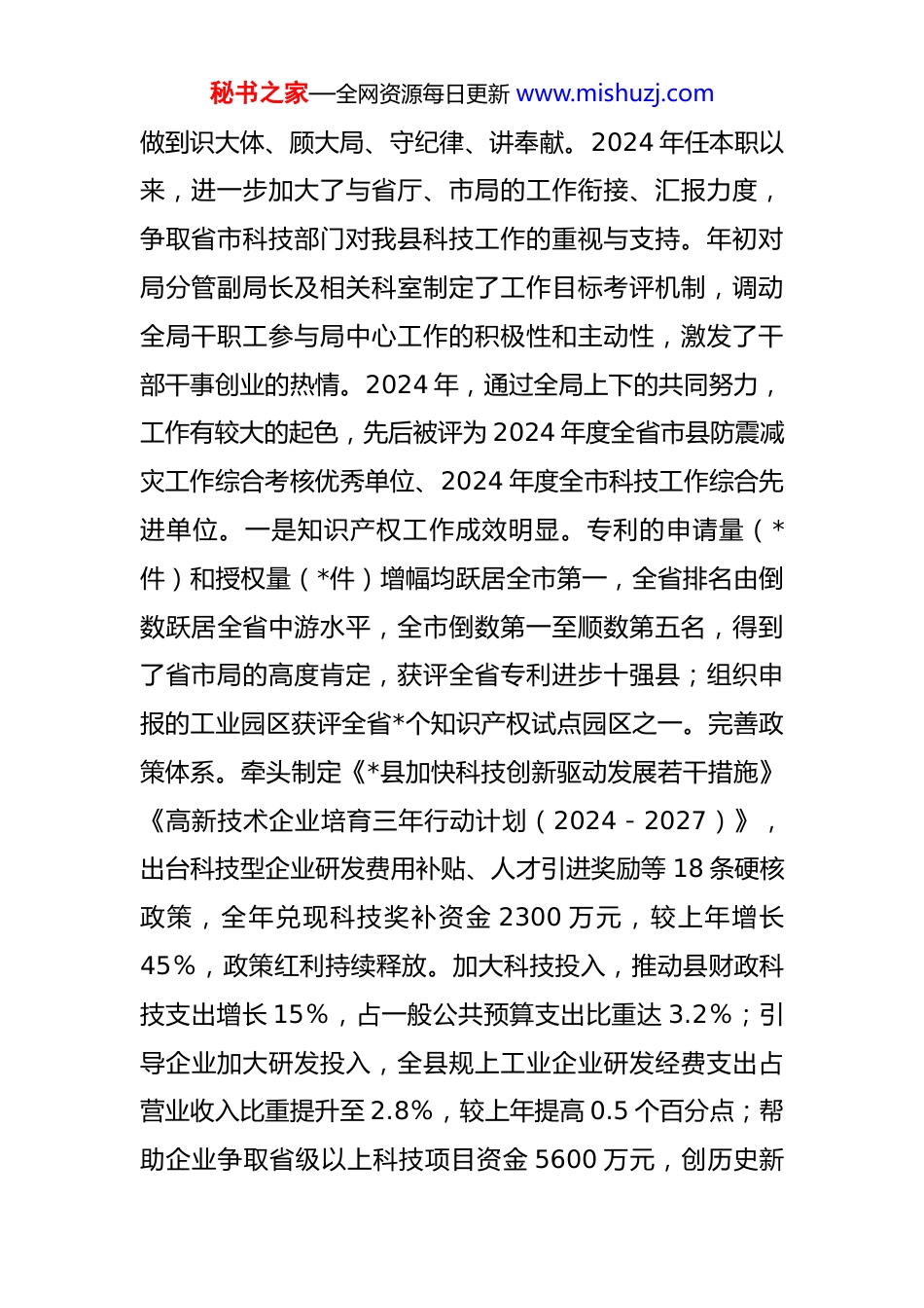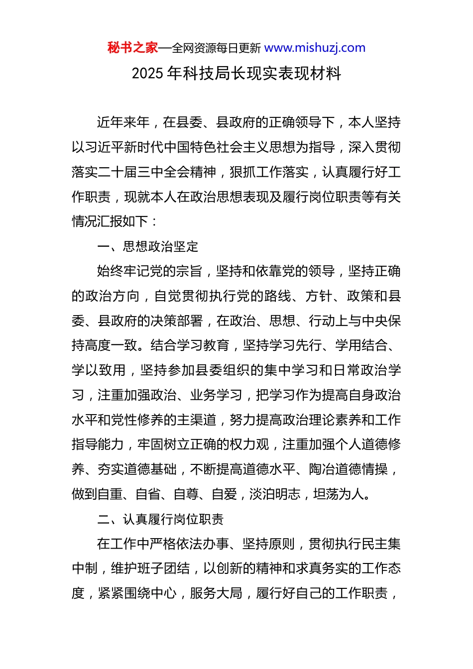 秘书之家—全网资源每日更新 www.mishuzj.com2025 年科技局长现实表现材料 近年来年,在县委、县政府的正确领导下,本人坚持以习近平新时代中国特色社会主义思想为指导,深入贯彻落实二十届三中全会精神,狠抓工作落实,认真履行好工作职责,现就本人在政治思想表现及履行岗位职责等有关情况汇报如下:一、思想政治坚定始终牢记党的宗旨,坚持和依靠党的领导,坚持正确的政治方向,自觉贯彻执行党的路线、方针、政策和县委、县政府的决策部署,在政治、思想、行动上与中央保持高度一致。结合学习教育,坚持学习先行、学用结合、学以致用,坚持参加县委组织的集中学习和日常政治学习,注重加强政治、业务学习,把学习作为提高自身政治水平和党性修养的主渠道,努力提高政治理论素养和工作指导能力,牢固树立正确的权力观,注重加强个人道德修养、夯实道德基础,不断提高道德水平、陶冶道德情操,做到自重、自省、自尊、自爱,淡泊明志,坦荡为人。二、认真履行岗位职责在工作中严格依法办事、坚持原则,贯彻执行民主集中制,维护班子团结,以创新的精神和求真务实的工作态度,紧紧围绕中心,服务大局,履行好自己的工作职责,秘书之家—全网资源每日更新 www.mishuzj.com做到识大体、顾大局、守纪律、讲奉献。2024 年任本职以来,进一步加大了与省厅、市局的工作衔接、汇报力度,争取省市科技部门对我县科技工作的重视与支持。年初对局分管副局长及相关科室制定了工作目标考评机制,调动全局干职工参与局中心工作的积极性和主动性,激发了干部干事创业的热情。2024 年,通过全局上下的共同努力,工作有较大的起色,先后被评为 2024 年度全省市县防震减灾工作综合考核优秀单位、2024 年度全市科技工作综合先进单位。一是知识产权工作成效明显。专利的申请量(*件)和授权量(*件)增幅均跃居全市第一,全省排名由倒数跃居全省中游水平,全市倒数第一至顺数第五名,得到了省市局的高度肯定,获评全省专利进步十强县;组织申报的工业园区获评全省*个知识产权试点园区之一。完善政策体系。牵头制定《*县加快科技创新驱动发展若干措施》《高新技术企业培育三年行动计划(2024-2027)》,出台科技型企业研发费用补贴、人才引进奖励等 18 条硬核政策,全年兑现科技奖补资金 2300 万元,较上年增长45%,政策红利持续释放。加大科技投入,推动县财政科技支出增长 15%,占一般公共预算支出比重达 3.2%;引导企业加大研发投入,全县规上工业企业研发经费支出占营业收入比重提升至 2.8%,较上年提高 0.5 个百分点;帮助企业争取省级以上科技项目资金 5600 万元,创历史新秘书之家—全网资源每日更新 www.mishuzj.com高。优化服务效能。建立“科技干部包联企业”机制,组织 20 名干部对口联系 86 家重点企业,开展“研发费用加计扣除”“高新技术企业申报”等政策宣讲 32 场次,惠及企业 300 余家;设立“科技创新服务窗口”,实现项目申报、成果登记等业务“一窗受理、全程代办”,平均办理时限缩短 40%。二是计划项目质优量升。全县共组织申报*省级重点新产品,其中*个通过了省厅的验收。组织*等*个项目申报省科技计划项目资金扶助。*药业被评为高新技术企业。此外,组织了*两家企业参与全省节能减排创新示范企业评选,并当选全省 60 家企业之一。盛伟公司并获全省知识产权优势企业称号。*公司获省工程技术研究中心称号。这些工作量和质都较往年有较大幅度的提升,助推了企业的创新发展。实施“高企培育倍增计划”,建立“微成长、小升高、高变强”培育库,全年新增高新技术企业28 家,总数达 76 家,同比增长 58%;新增科技型中小企业 112 家,入库总数突破 300 家,位列全市前三。指导企业申报省级以上专精特新“小巨人”企业,新增省级专精特新企业 12 家、国家级 1 家;支持*公司建设“省级企业技术中心”,推动*合作社创建“农业科技型企业”,形成“科技型企业+产业链”发展模式。推动*经开区与二十大学共建“*产业技术研究院”,引进教授团队 5 个,联合开展关键技术攻关 12 项;新建“*新材料中试基地”“农产秘书之家—全网...