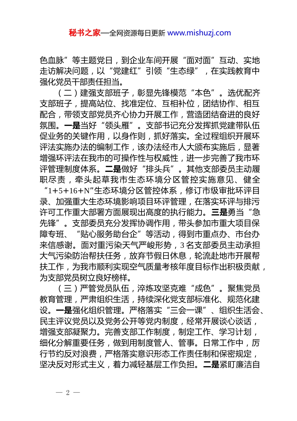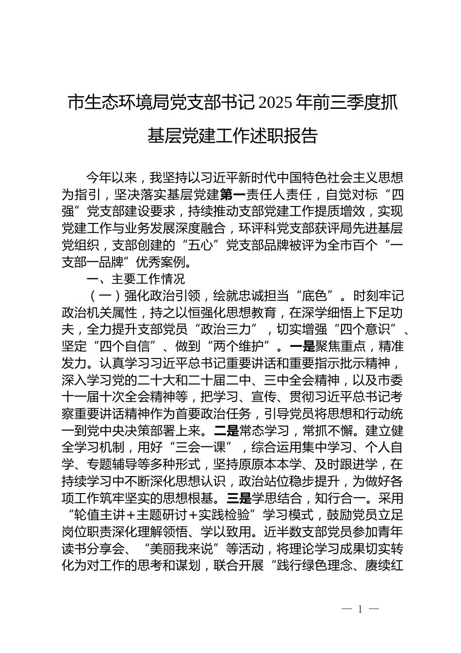 市生态环境局党支部书记 2025 年前三季度抓基层党建工作述职报告今年以来,我坚持以习近平新时代中国特色社会主义思想为指引,坚决落实基层党建第一责任人责任,自觉对标“四强”党支部建设要求,持续推动支部党建工作提质增效,实现党建工作与业务发展深度融合,环评科党支部获评局先进基层党组织,支部创建的“五心”党支部品牌被评为全市百个“一支部一品牌”优秀案例。一、主要工作情况(一)强化政治引领,绘就忠诚担当“底色”。时刻牢记政治机关属性,持之以恒强化思想教育,在深学细悟上下足功夫,全力提升支部党员“政治三力”,切实增强“四个意识”、坚定“四个自信”、做到“两个维护”。一是聚焦重点,精准发力。认真学习习近平总书记重要讲话和重要指示批示精神,深入学习党的二十大和二十届二中、三中全会精神,以及市委十一届十次全会精神等,把学习、宣传、贯彻习近平总书记考察重要讲话精神作为首要政治任务,引导党员将思想和行动统一到党中央决策部署上来。二是常态学习,常抓不懈。建立健全学习机制,用好“三会一课”,综合运用集中学习、个人自学、专题辅导等多种形式,坚持原原本本学、及时跟进学,在持续学习中不断深化思想认识,政治站位稳步提升,为做好各项工作筑牢坚实的思想根基。三是学思结合,知行合一。采用“轮值主讲+主题研讨+实践检验”学习模式,鼓励党员立足岗位职责深化理解领悟、学以致用。近半数支部党员参加青年读书分享会、“美丽我来说”等活动,将理论学习成果切实转化为对工作的思考和谋划,联合开展“践行绿色理念、赓续红— 1 —秘书之家—全网资源每日更新 www.mishuzj.com色血脉”等主题党日,到企业车间开展“面对面”互动、实地走访解决问题,以“党建红”引领“生态绿”,在实践教育中强化党员干部责任担当。(二)建强支部班子,彰显先锋模范“本色”。选优配齐支部班子,提高站位、找准定位、互相补位,团结协作、相互配合,带领支部党员齐心协力开展工作,营造团结奋进的良好氛围。一是当好“领头雁”。支部书记充分发挥抓党建带队伍促业务的关键作用,以身作则,抓好落实。全过程组织开展环评法实施办法的编制工作,该办法经市人大颁布实施后,显著增强环评法在我市的可操作性与权威性,进一步完善了我市环评管理制度体系。二是做好“排头兵”。其他支部委员主动履职尽责,牵头起草我市生态环境分区管控实施意见、健全“1+5+16+N”生态环境分区管控体系,修订市级审批环评目录、加强重大生态环境影响项目环评管理,在落实环评与排污许可工作重大部署方面展现出高度的执行能力。三是勇当“急先锋”。支部委员充分发挥协调作用,带头参加市重大项目保障专班、“贴心服务助台企”等活动,得到市重点办、市台办来信感谢。面对重污染天气严峻形势,3 名支部委员主动承担大气污染防治帮扶任务,放弃节假日休息,轮流赴地市开展帮扶工作,为我市顺利实现空气质量考核年度目标作出积极贡献,为支部党员树立良好榜样。(三)严管党员队伍,淬炼攻坚克难“成色”。聚焦党员教育管理,严肃组织生活,持续深化党支部标准化、规范化建设。一是强化组织管理。严格落实“三会一课”、组织生活会、民主评议党员以及党务公开等党内制度,经常开展谈心谈话,增强支部凝聚力。完善支部工作制度,制定工作、学习计划,细化分解重要任务,做到用制度管人、管事。日常工作中,厉行节约反对浪费,严格落实意识形态工作责任制和保密规定,坚决反对形式主义,着力减轻基层工作负担。二是紧盯廉洁自— 2 —律。扎实开展深入贯彻中央八项规定精神学习教育,强化自我革命精神,保持优良作风,经常对支部党员进行教育提醒,督促严格自律。组织实施全市环评领域专题警示教育,深入开展学习教育、专题研讨等活动,积极落实“嵌入式”监督,进一步规范全市环评审批行为,有效防范廉政风险,提升环评队伍整体作风和业务水平。三是砥砺党员品格。加强党员队伍的教育培养,鼓励党员在重点任务中经受锻炼、增长才干、做出表率,支部党员先后参与巡察、督察、审计等工作,综合素质得到显著提升,也得到上级部门一致好评。近年来,环评科先后被生态环境...