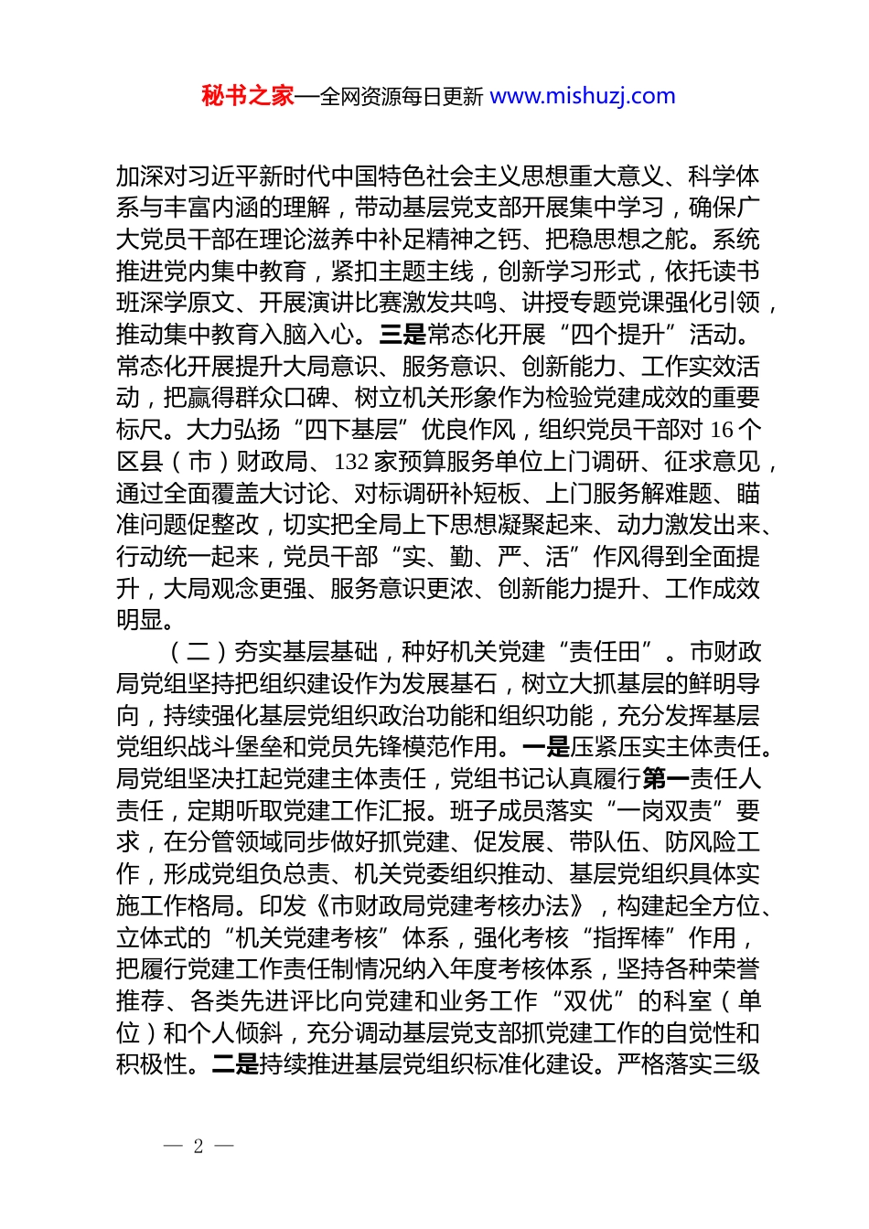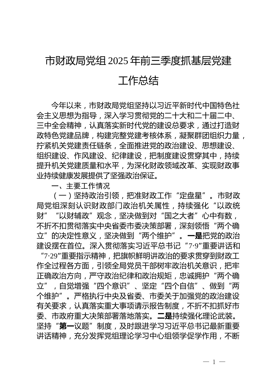市财政局党组 2025 年前三季度抓基层党建工作总结今年以来,市财政局党组坚持以习近平新时代中国特色社会主义思想为指导,深入学习贯彻党的二十大和二十届二中、三中全会精神,认真落实新时代党的建设总要求,通过打造财政特色党建品牌,构建完整党建考核体系,凝聚群团组织力量,拧紧机关党建责任链条,全面推进党的政治建设、思想建设、组织建设、作风建设、纪律建设,把制度建设贯穿其中,持续提升机关党建质量和水平,为深化财政领域改革、实现财政事业持续健康发展提供了坚强政治保证。一、主要工作情况(一)坚持政治引领,把准财政工作“定盘星”。市财政局党组深刻认识财政部门政治机关属性,持续强化“以政统财”“以财辅政”观念,坚决做到对“国之大者”心中有数,不折不扣贯彻落实中央省委市委决策部署,深刻领悟“两个确立”的决定性意义,坚决做到“两个维护”。一是把党的政治建设摆在首位。深入贯彻落实习近平总书记“7·9”重要讲话和“7·29”重要指示精神,把旗帜鲜明讲政治的要求贯穿到财政工作全过程各方面,引领全局党员干部树牢政治机关意识,把牢正确政治方向,严守政治纪律和政治规矩,忠诚拥护“两个确立”,自觉增强“四个意识”、坚定“四个自信”、做到“两个维护”。严格执行中央及省委、市委关于加强党的政治建设有关要求,认真落实重大事项请示报告制度,不折不扣抓好市委、市政府重大决策部署落地落实。二是持续强化理论武装。坚持“第一议题”制度,及时跟进学习习近平总书记最新重要讲话精神,充分发挥党组理论学习中心组领学促学作用,不断— 1 —秘书之家—全网资源每日更新 www.mishuzj.com加深对习近平新时代中国特色社会主义思想重大意义、科学体系与丰富内涵的理解,带动基层党支部开展集中学习,确保广大党员干部在理论滋养中补足精神之钙、把稳思想之舵。系统推进党内集中教育,紧扣主题主线,创新学习形式,依托读书班深学原文、开展演讲比赛激发共鸣、讲授专题党课强化引领,推动集中教育入脑入心。三是常态化开展“四个提升”活动。常态化开展提升大局意识、服务意识、创新能力、工作实效活动,把赢得群众口碑、树立机关形象作为检验党建成效的重要标尺。大力弘扬“四下基层”优良作风,组织党员干部对 16 个区县(市)财政局、132 家预算服务单位上门调研、征求意见,通过全面覆盖大讨论、对标调研补短板、上门服务解难题、瞄准问题促整改,切实把全局上下思想凝聚起来、动力激发出来、行动统一起来,党员干部“实、勤、严、活”作风得到全面提升,大局观念更强、服务意识更浓、创新能力提升、工作成效明显。(二)夯实基层基础,种好机关党建“责任田”。市财政局党组坚持把组织建设作为发展基石,树立大抓基层的鲜明导向,持续强化基层党组织政治功能和组织功能,充分发挥基层党组织战斗堡垒和党员先锋模范作用。一是压紧压实主体责任。局党组坚决扛起党建主体责任,党组书记认真履行第一责任人责任,定期听取党建工作汇报。班子成员落实“一岗双责”要求,在分管领域同步做好抓党建、促发展、带队伍、防风险工作,形成党组负总责、机关党委组织推动、基层党组织具体实施工作格局。印发《市财政局党建考核办法》,构建起全方位、立体式的“机关党建考核”体系,强化考核“指挥棒”作用,把履行党建工作责任制情况纳入年度考核体系,坚持各种荣誉推荐、各类先进评比向党建和业务工作“双优”的科室(单位)和个人倾斜,充分调动基层党支部抓党建工作的自觉性和积极性。二是持续推进基层党组织标准化建设。严格落实三级— 2 —四岗工作责任制,按期开展基层党组织换届工作,依据各基层党组织换届时间,提前下发提醒督促单进行换届提醒,选优配强支部书记、支委委员、专职党务干部。以模范机关建设为抓手,常态化开展“四强支部”创建工作,多维度发力,督促指导各基层党支部严格落实《关于新形势下党内政治生活的若干准则》,定期对“三会一课”、主题党日、组织生活会、民主评议党员等组织生活进行专项检查,及时纠正不规范问题,切实把党支部建设成为坚强战斗堡垒,推动基层党组织标准化、规范化提升。三是持续加强党...