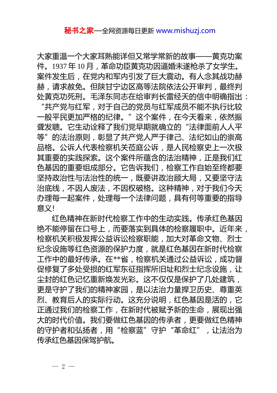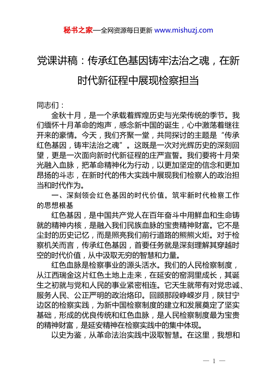 秘书之家—全网资源每日更新 www.mishuzj.com党课讲稿:传承红色基因铸牢法治之魂,在新时代新征程中展现检察担当同志们:金秋十月,是一个承载着辉煌历史与光荣传统的季节。我们缅怀十月革命的炮声,感念新中国的诞生,心中激荡着继往开来的豪情。今天,我们齐聚一堂,共同探讨的主题是“传承红色基因,铸牢法治之魂”。这既是一次对光辉历史的深刻回望,更是一次面向新时代新征程的庄严宣誓。我们要将十月荣光融入血脉,把革命精神化为行动,以更加坚定的信念和更加昂扬的斗志,在新时代的伟大实践中展现我们检察人的政治担当和时代作为。一、深刻领会红色基因的时代价值,筑牢新时代检察工作的思想根基红色基因,是中国共产党人在百年奋斗中用鲜血和生命铸就的精神内核,是融入我们民族血脉的宝贵精神财富。它不是尘封的历史记忆,而是照亮我们前行道路的熊熊火炬。对于检察机关而言,传承红色基因,首要任务就是深刻理解其穿越时空的时代价值,从中汲取无穷的智慧和力量。红色血脉是检察事业的源头活水。我们的人民检察制度,从江西瑞金这片红色土地上走来,在延安的窑洞里成长,其诞生之初就与党和人民的事业紧密相连。它天生就带有对党忠诚、服务人民、公正严明的政治烙印。回顾那段峥嵘岁月,陕甘宁边区的检察实践,为新中国检察制度的建立和发展奠定了坚实基础,形成的优良传统和红色血脉,是人民检察制度最为宝贵的精神财富,是延安精神在检察实践中的集中体现。以史为鉴,从革命法治实践中汲取智慧。在这里,我想和— 1 —秘书之家—全网资源每日更新 www.mishuzj.com大家重温一个大家耳熟能详但又常学常新的故事——黄克功案件。1937 年 10 月,革命功臣黄克功因逼婚未遂枪杀了女学生。案件发生后,在党内和军内引发了巨大震动。有人念其战功赫赫,请求赦免。但陕甘宁边区高等法院依法公开审判,最终判处黄克功死刑。毛泽东同志在给审判长雷经天的信中明确指出:“共产党与红军,对于自己的党员与红军成员不能不执行比较一般平民更加严格的纪律。”这个案件,在今天看来,依然振聋发聩。它生动诠释了我们党早期就确立的“法律面前人人平等”的法治原则,彰显了共产党人严于律己、法纪如山的崇高品格。公诉人代表检察机关莅庭公诉,是人民检察史上一次极其重要的实践探索。这个案件所蕴含的法治精神,正是我们红色基因的重要组成部分。它告诉我们,检察工作自始至终都要坚持政治性与法治性的统一,既要讲政治顾大局,又要坚守法治底线,不因人废法,不因权破格。这种精神,对于我们今天办理每一起案件,处理每一个法律问题,具有何等重要的指导意义!红色精神在新时代检察工作中的生动实践。传承红色基因绝不能停留在口号上,而要落实到具体的检察履职中。近年来,检察机关积极发挥公益诉讼检察职能,加大对革命文物、烈士纪念设施等红色资源的保护力度,就是红色基因在新时代检察工作中的最好传承。在**省,检察机关通过公益诉讼,成功督促修复了多处受损的红军东征指挥所旧址和烈士纪念设施,让尘封的红色记忆重新焕发光彩。这不仅仅是保护了几处建筑,更是守护了我们的精神家园,是以法治力量捍卫历史、尊重英烈、教育后人的实际行动。这充分说明,红色基因是活的,它正通过我们的检察工作,在新时代被赋予新的生命,展现出强大的时代价值。我们要做红色基因的传承者,更要做红色精神的守护者和弘扬者,用“检察蓝”守护“革命红”,让法治为传承红色基因保驾护航。— 2 —秘书之家—全网资源每日更新 www.mishuzj.com二、坚决扛起党风廉政建设政治责任,锻造忠诚干净担当的检察铁军检察机关是法律监督机关,是维护社会公平正义的最后一道防线,这支队伍的纯洁性和战斗力直接关系到党的形象和司法公信力。因此,抓好党风廉政建设,对检察机关而言,是须臾不可放松的政治责任,是检察工作的生命线。党风廉政建设是检察工作的生命线。习近平总书记反复强调,腐败是我们党执政的最大风险。检察机关手握法律监督重权,面临的考验和诱惑更加直接。我们必须清醒地认识到,检察队伍不是生活在真空中,也没有天然的免疫力。一旦放松警惕,就可能出现问题,甚至发生系...