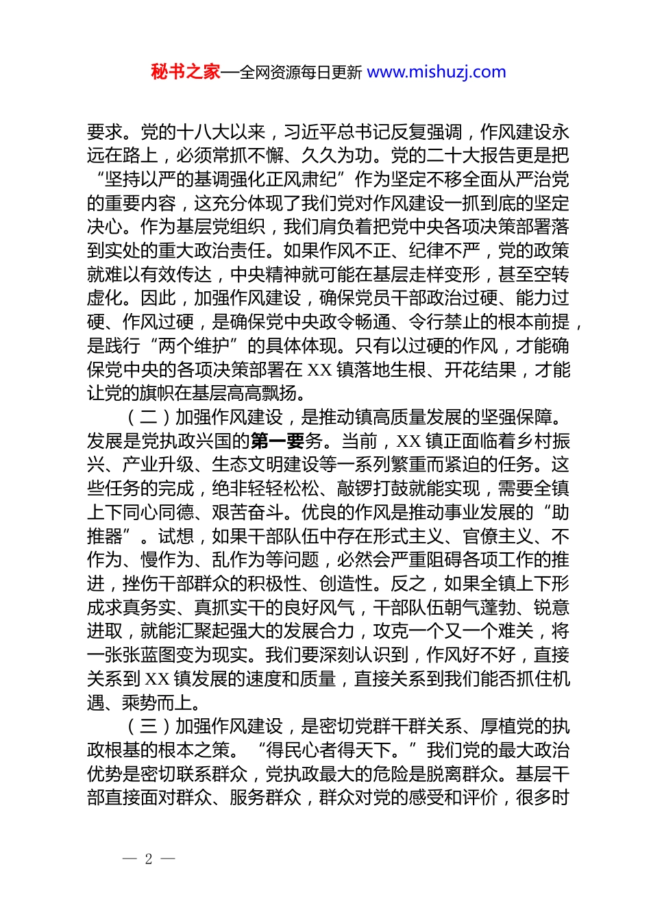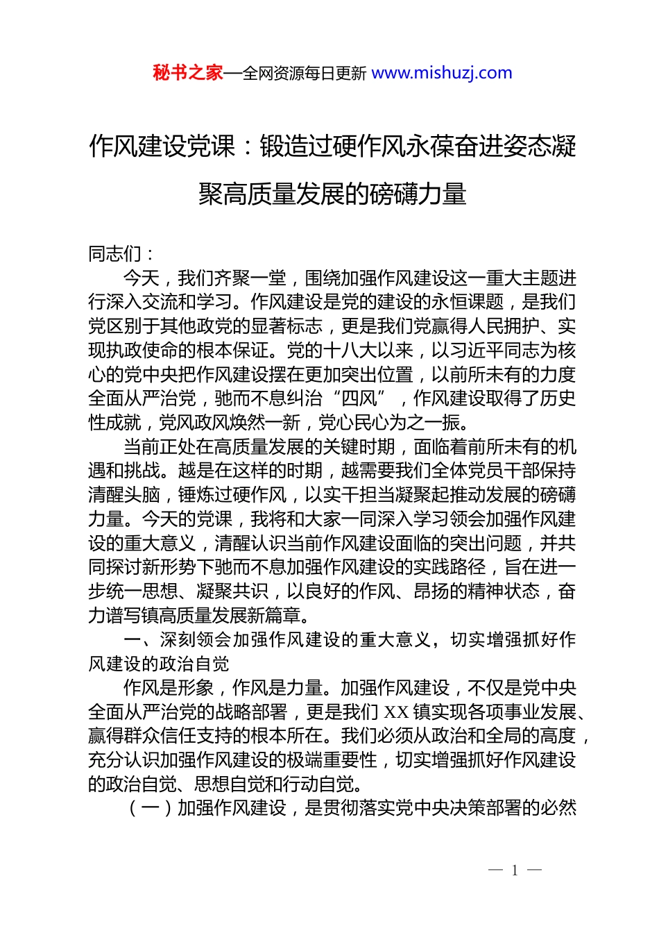 秘书之家—全网资源每日更新 www.mishuzj.com作风建设党课:锻造过硬作风永葆奋进姿态凝聚高质量发展的磅礴力量同志们:今天,我们齐聚一堂,围绕加强作风建设这一重大主题进行深入交流和学习。作风建设是党的建设的永恒课题,是我们党区别于其他政党的显著标志,更是我们党赢得人民拥护、实现执政使命的根本保证。党的十八大以来,以习近平同志为核心的党中央把作风建设摆在更加突出位置,以前所未有的力度全面从严治党,驰而不息纠治“四风”,作风建设取得了历史性成就,党风政风焕然一新,党心民心为之一振。当前正处在高质量发展的关键时期,面临着前所未有的机遇和挑战。越是在这样的时期,越需要我们全体党员干部保持清醒头脑,锤炼过硬作风,以实干担当凝聚起推动发展的磅礴力量。今天的党课,我将和大家一同深入学习领会加强作风建设的重大意义,清醒认识当前作风建设面临的突出问题,并共同探讨新形势下驰而不息加强作风建设的实践路径,旨在进一步统一思想、凝聚共识,以良好的作风、昂扬的精神状态,奋力谱写镇高质量发展新篇章。一、深刻领会加强作风建设的重大意义,切实增强抓好作风建设的政治自觉作风是形象,作风是力量。加强作风建设,不仅是党中央全面从严治党的战略部署,更是我们 XX 镇实现各项事业发展、赢得群众信任支持的根本所在。我们必须从政治和全局的高度,充分认识加强作风建设的极端重要性,切实增强抓好作风建设的政治自觉、思想自觉和行动自觉。(一)加强作风建设,是贯彻落实党中央决策部署的必然— 1 —秘书之家—全网资源每日更新 www.mishuzj.com要求。党的十八大以来,习近平总书记反复强调,作风建设永远在路上,必须常抓不懈、久久为功。党的二十大报告更是把“坚持以严的基调强化正风肃纪”作为坚定不移全面从严治党的重要内容,这充分体现了我们党对作风建设一抓到底的坚定决心。作为基层党组织,我们肩负着把党中央各项决策部署落到实处的重大政治责任。如果作风不正、纪律不严,党的政策就难以有效传达,中央精神就可能在基层走样变形,甚至空转虚化。因此,加强作风建设,确保党员干部政治过硬、能力过硬、作风过硬,是确保党中央政令畅通、令行禁止的根本前提,是践行“两个维护”的具体体现。只有以过硬的作风,才能确保党中央的各项决策部署在 XX 镇落地生根、开花结果,才能让党的旗帜在基层高高飘扬。(二)加强作风建设,是推动镇高质量发展的坚强保障。发展是党执政兴国的第一要务。当前,XX 镇正面临着乡村振兴、产业升级、生态文明建设等一系列繁重而紧迫的任务。这些任务的完成,绝非轻轻松松、敲锣打鼓就能实现,需要全镇上下同心同德、艰苦奋斗。优良的作风是推动事业发展的“助推器”。试想,如果干部队伍中存在形式主义、官僚主义、不作为、慢作为、乱作为等问题,必然会严重阻碍各项工作的推进,挫伤干部群众的积极性、创造性。反之,如果全镇上下形成求真务实、真抓实干的良好风气,干部队伍朝气蓬勃、锐意进取,就能汇聚起强大的发展合力,攻克一个又一个难关,将一张张蓝图变为现实。我们要深刻认识到,作风好不好,直接关系到 XX 镇发展的速度和质量,直接关系到我们能否抓住机遇、乘势而上。(三)加强作风建设,是密切党群干群关系、厚植党的执政根基的根本之策。“得民心者得天下。”我们党的最大政治优势是密切联系群众,党执政最大的危险是脱离群众。基层干部直接面对群众、服务群众,群众对党的感受和评价,很多时— 2 —秘书之家—全网资源每日更新 www.mishuzj.com候就是通过基层干部的言谈举止来形成的。如果我们的干部能够心系群众、勤政为民,把群众的小事当作自己的大事,真心实意为群众解决急难愁盼问题,群众就会感到温暖,就会更加信任和拥护党。反之,如果干部作风粗暴、衙门习气,甚至以权谋私,就会严重损害党在人民群众心中的形象,侵蚀党群干群关系,动摇党的执政根基。加强作风建设,就是要引导党员干部始终牢记全心全意为人民服务的宗旨,以实际行动赢得民心,汇聚起最广泛的民心民意,为实现中华民族伟大复兴的中国梦奠定坚实的群众基础。二、准确把握当前作风建设的突出...
