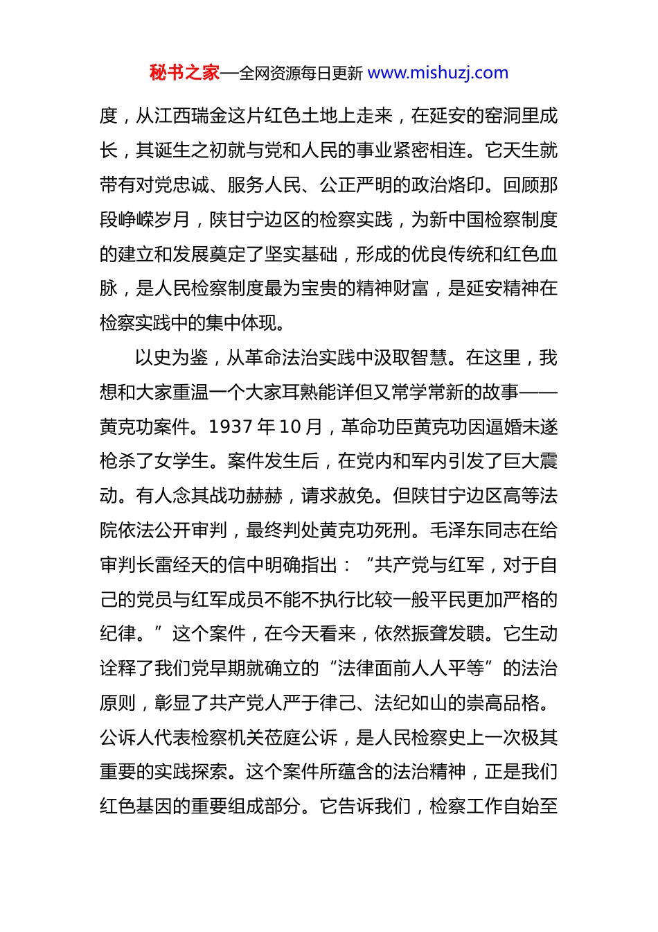 秘书之家—全网资源每日更新 www.mishuzj.com党课讲稿:传承红色基因铸牢法治之魂,在新时代新征程中展现检察担当 同志们:金秋十月,是一个承载着辉煌历史与光荣传统的季节。我们缅怀十月革命的炮声,感念新中国的诞生,心中激荡着继往开来的豪情。今天,我们齐聚一堂,共同探讨的主题是“传承红色基因,铸牢法治之魂”。这既是一次对光辉历史的深刻回望,更是一次面向新时代新征程的庄严宣誓。我们要将十月荣光融入血脉,把革命精神化为行动,以更加坚定的信念和更加昂扬的斗志,在新时代的伟大实践中展现我们检察人的政治担当和时代作为。一、深刻领会红色基因的时代价值,筑牢新时代检察工作的思想根基红色基因,是中国共产党人在百年奋斗中用鲜血和生命铸就的精神内核,是融入我们民族血脉的宝贵精神财富。它不是尘封的历史记忆,而是照亮我们前行道路的熊熊火炬。对于检察机关而言,传承红色基因,首要任务就是深刻理解其穿越时空的时代价值,从中汲取无穷的智慧和力量。红色血脉是检察事业的源头活水。我们的人民检察制秘书之家—全网资源每日更新 www.mishuzj.com度,从江西瑞金这片红色土地上走来,在延安的窑洞里成长,其诞生之初就与党和人民的事业紧密相连。它天生就带有对党忠诚、服务人民、公正严明的政治烙印。回顾那段峥嵘岁月,陕甘宁边区的检察实践,为新中国检察制度的建立和发展奠定了坚实基础,形成的优良传统和红色血脉,是人民检察制度最为宝贵的精神财富,是延安精神在检察实践中的集中体现。以史为鉴,从革命法治实践中汲取智慧。在这里,我想和大家重温一个大家耳熟能详但又常学常新的故事——黄克功案件。1937 年 10 月,革命功臣黄克功因逼婚未遂枪杀了女学生。案件发生后,在党内和军内引发了巨大震动。有人念其战功赫赫,请求赦免。但陕甘宁边区高等法院依法公开审判,最终判处黄克功死刑。毛泽东同志在给审判长雷经天的信中明确指出:“共产党与红军,对于自己的党员与红军成员不能不执行比较一般平民更加严格的纪律。”这个案件,在今天看来,依然振聋发聩。它生动诠释了我们党早期就确立的“法律面前人人平等”的法治原则,彰显了共产党人严于律己、法纪如山的崇高品格。公诉人代表检察机关莅庭公诉,是人民检察史上一次极其重要的实践探索。这个案件所蕴含的法治精神,正是我们红色基因的重要组成部分。它告诉我们,检察工作自始至秘书之家—全网资源每日更新 www.mishuzj.com终都要坚持政治性与法治性的统一,既要讲政治顾大局,又要坚守法治底线,不因人废法,不因权破格。这种精神,对于我们今天办理每一起案件,处理每一个法律问题,具有何等重要的指导意义!红色精神在新时代检察工作中的生动实践。传承红色基因,绝不能停留在口号上,而要落实到具体的检察履职中。近年来,检察机关积极发挥公益诉讼检察职能,加大对革命文物、烈士纪念设施等红色资源的保护力度,就是红色基因在新时代检察工作中的最好传承。在**省,检察机关通过公益诉讼,成功督促修复了多处受损的红军东征指挥所旧址和烈士纪念设施,让尘封的红色记忆重新焕发光彩。这不仅仅是保护了几处建筑,更是守护了我们的精神家园,是以法治力量捍卫历史、尊重英烈、教育后人的实际行动。这充分说明,红色基因是活的,它正通过我们的检察工作,在新时代被赋予新的生命,展现出强大的时代价值。我们要做红色基因的传承者,更要做红色精神的守护者和弘扬者,用“检察蓝”守护“革命红”,让法治为传承红色基因保驾护航。二、坚决扛起党风廉政建设政治责任,锻造忠诚干净担当的检察铁军检察机关是法律监督机关,是维护社会公平正义的最秘书之家—全网资源每日更新 www.mishuzj.com后一道防线,这支队伍的纯洁性和战斗力直接关系到党的形象和司法公信力。因此,抓好党风廉政建设,对检察机关而言,是须臾不可放松的政治责任,是检察工作的生命线。党风廉政建设是检察工作的生命线。习近平总书记反复强调,腐败是我们党执政的最大风险。检察机关手握法律监督重权,面临的考验和诱惑更加直接。我们必须清醒地认识到,检察队伍不是生活在真空中,也没有天然的免疫力。一旦放松警...