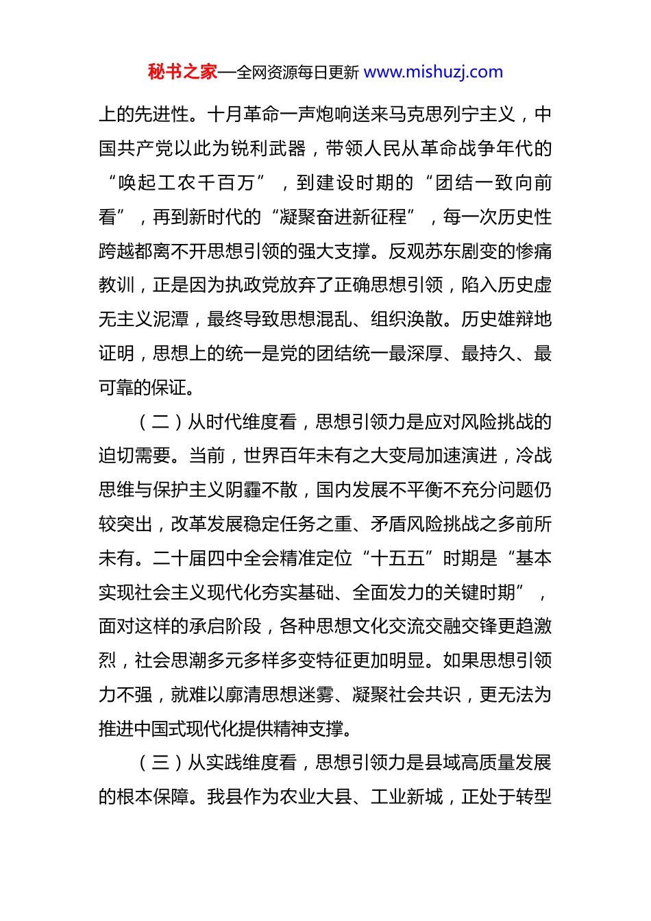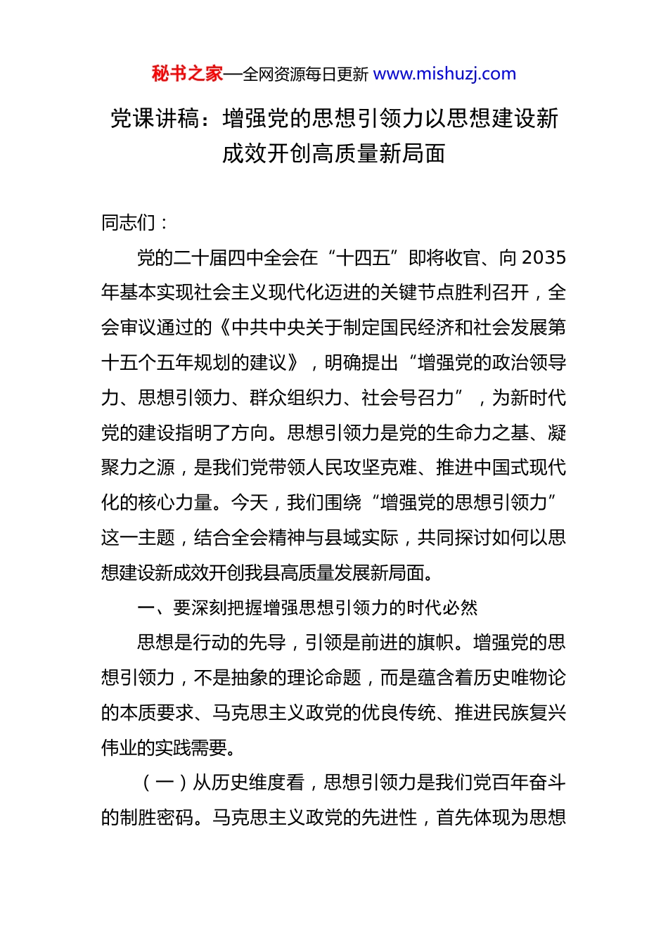 秘书之家—全网资源每日更新 www.mishuzj.com党课讲稿:增强党的思想引领力以思想建设新成效开创高质量新局面 同志们:党的二十届四中全会在“十四五”即将收官、向 2035年基本实现社会主义现代化迈进的关键节点胜利召开,全会审议通过的《中共中央关于制定国民经济和社会发展第十五个五年规划的建议》,明确提出“增强党的政治领导力、思想引领力、群众组织力、社会号召力”,为新时代党的建设指明了方向。思想引领力是党的生命力之基、凝聚力之源,是我们党带领人民攻坚克难、推进中国式现代化的核心力量。今天,我们围绕“增强党的思想引领力”这一主题,结合全会精神与县域实际,共同探讨如何以思想建设新成效开创我县高质量发展新局面。一、要深刻把握增强思想引领力的时代必然思想是行动的先导,引领是前进的旗帜。增强党的思想引领力,不是抽象的理论命题,而是蕴含着历史唯物论的本质要求、马克思主义政党的优良传统、推进民族复兴伟业的实践需要。(一)从历史维度看,思想引领力是我们党百年奋斗的制胜密码。马克思主义政党的先进性,首先体现为思想秘书之家—全网资源每日更新 www.mishuzj.com上的先进性。十月革命一声炮响送来马克思列宁主义,中国共产党以此为锐利武器,带领人民从革命战争年代的“唤起工农千百万”,到建设时期的“团结一致向前看”,再到新时代的“凝聚奋进新征程”,每一次历史性跨越都离不开思想引领的强大支撑。反观苏东剧变的惨痛教训,正是因为执政党放弃了正确思想引领,陷入历史虚无主义泥潭,最终导致思想混乱、组织涣散。历史雄辩地证明,思想上的统一是党的团结统一最深厚、最持久、最可靠的保证。(二)从时代维度看,思想引领力是应对风险挑战的迫切需要。当前,世界百年未有之大变局加速演进,冷战思维与保护主义阴霾不散,国内发展不平衡不充分问题仍较突出,改革发展稳定任务之重、矛盾风险挑战之多前所未有。二十届四中全会精准定位“十五五”时期是“基本实现社会主义现代化夯实基础、全面发力的关键时期”,面对这样的承启阶段,各种思想文化交流交融交锋更趋激烈,社会思潮多元多样多变特征更加明显。如果思想引领力不强,就难以廓清思想迷雾、凝聚社会共识,更无法为推进中国式现代化提供精神支撑。(三)从实践维度看,思想引领力是县域高质量发展的根本保障。我县作为农业大县、工业新城,正处于转型秘书之家—全网资源每日更新 www.mishuzj.com升级的攻坚期,既要承接“十四五”发展成果,又要落实“十五五”部署要求,无论是发展新质生产力、推进乡村振兴,还是优化民生服务,都需要统一思想、凝聚合力。只有把党的创新理论转化为全县党员干部的行动自觉,把思想共识转化为干事创业的实际成效,才能破解发展难题、跨越发展瓶颈,在区域竞争中抢占先机。二、要精准锚定增强思想引领力的核心要义党的二十届四中全会为增强思想引领力提供了根本遵循。从全会精神中,我们可以清晰把握思想引领力的核心要义,这就是以科学理论为根基、以人民至上为灵魂、以与时俱进为特质的综合能力体系。(一)彰显科学理论的真理力量,筑牢思想引领的理论根基。思想引领力首先源于理论的科学性。马克思主义犹如壮丽的日出,照亮了人类探索历史规律的道路,而习近平新时代中国特色社会主义思想作为当代中国马克思主义、21 世纪马克思主义,更是展现出强大的真理穿透力。二十届四中全会将“加快高水平科技自立自强,引领发展新质生产力”作为核心部署,正是马克思主义生产力理论在新时代的生动运用——从“一五”计划建立工业体系到新时代构建现代化产业体系,我们党始终根据生产力发展需求调整生产关系,这背后正是科学理论的指引。对我县秘书之家—全网资源每日更新 www.mishuzj.com而言,筑牢理论根基就是要把学习贯彻习近平新时代中国特色社会主义思想与领会全会精神紧密结合,深刻把握“十个明确”“十四个坚持”“十三个方面成就”的系统内涵,特别要吃透“教育-科技-人才”一体推进、“智能化、绿色化、融合化”产业发展方向等部署要求,让理论学习成为破解我县产业升级、科技创新等难题的“金钥匙”。(二)厚植人民至上的情感力...