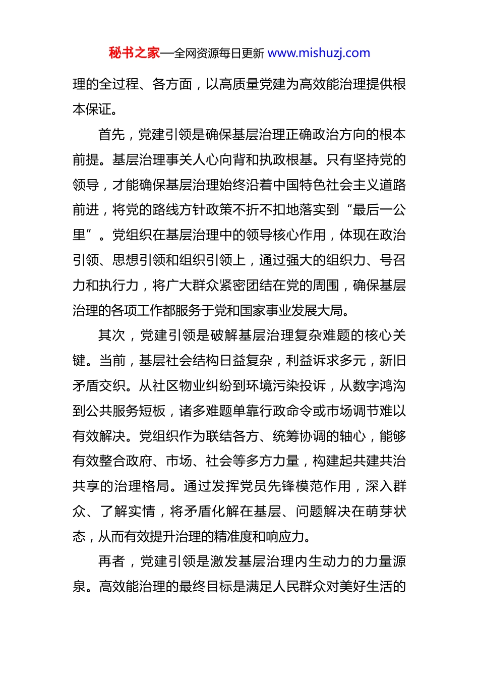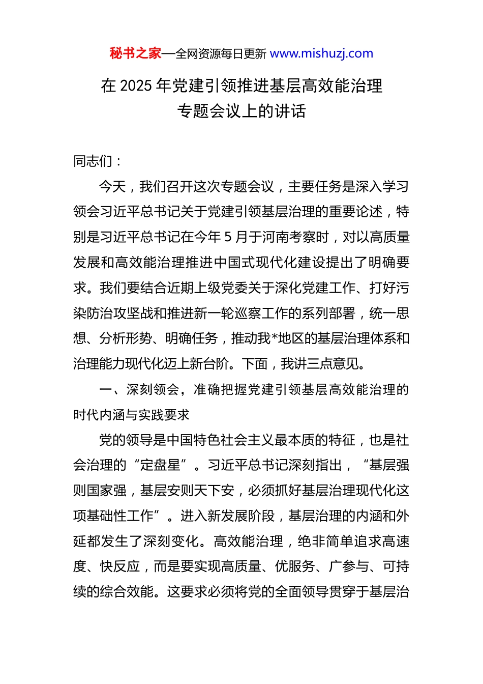 秘书之家—全网资源每日更新 www.mishuzj.com在 2025 年党建引领推进基层高效能治理专题会议上的讲话 同志们:今天,我们召开这次专题会议,主要任务是深入学习领会习近平总书记关于党建引领基层治理的重要论述,特别是习近平总书记在今年 5 月于河南考察时,对以高质量发展和高效能治理推进中国式现代化建设提出了明确要求。我们要结合近期上级党委关于深化党建工作、打好污染防治攻坚战和推进新一轮巡察工作的系列部署,统一思想、分析形势、明确任务,推动我*地区的基层治理体系和治理能力现代化迈上新台阶。下面,我讲三点意见。一、深刻领会,准确把握党建引领基层高效能治理的时代内涵与实践要求党的领导是中国特色社会主义最本质的特征,也是社会治理的“定盘星”。习近平总书记深刻指出,“基层强则国家强,基层安则天下安,必须抓好基层治理现代化这项基础性工作”。进入新发展阶段,基层治理的内涵和外延都发生了深刻变化。高效能治理,绝非简单追求高速度、快反应,而是要实现高质量、优服务、广参与、可持续的综合效能。这要求必须将党的全面领导贯穿于基层治秘书之家—全网资源每日更新 www.mishuzj.com理的全过程、各方面,以高质量党建为高效能治理提供根本保证。首先,党建引领是确保基层治理正确政治方向的根本前提。基层治理事关人心向背和执政根基。只有坚持党的领导,才能确保基层治理始终沿着中国特色社会主义道路前进,将党的路线方针政策不折不扣地落实到“最后一公里”。党组织在基层治理中的领导核心作用,体现在政治引领、思想引领和组织引领上,通过强大的组织力、号召力和执行力,将广大群众紧密团结在党的周围,确保基层治理的各项工作都服务于党和国家事业发展大局。其次,党建引领是破解基层治理复杂难题的核心关键。当前,基层社会结构日益复杂,利益诉求多元,新旧矛盾交织。从社区物业纠纷到环境污染投诉,从数字鸿沟到公共服务短板,诸多难题单靠行政命令或市场调节难以有效解决。党组织作为联结各方、统筹协调的轴心,能够有效整合政府、市场、社会等多方力量,构建起共建共治共享的治理格局。通过发挥党员先锋模范作用,深入群众、了解实情,将矛盾化解在基层、问题解决在萌芽状态,从而有效提升治理的精准度和响应力。再者,党建引领是激发基层治理内生动力的力量源泉。高效能治理的最终目标是满足人民群众对美好生活的秘书之家—全网资源每日更新 www.mishuzj.com向往。党建引领的本质,是践行以人民为中心的发展思想。通过建强基层党组织,拓宽民主渠道,保障群众的知情权、参与权、表达权、监督权,能够最大限度地调动群众参与治理的积极性、主动性和创造性。群众的智慧和力量被充分激发,治理工作就能获得最深厚、最持久的动力,形成“大家的事情大家办”的生动局面。正如近期中央一号文件再次强调的,要加强和改进乡村治理,健全党组织领导的自治、法治、德治相结合的城乡基层治理体系。这是对党建引领基层治理实践的再次肯定和深化。我们必须清醒地认识到,推进党建引领下的高效能治理,是一项系统工程,也是一场深刻变革。它要求我们必须打破传统思维定式,推动党建工作与业务工作深度融合,尤其是在污染防治、巡察整改等硬任务中,更要体现党组织的战斗堡垒作用和党员的先锋模范作用。二、正视成绩与挑战,以问题为导向全面审视治理现状近年来,我*地区坚决贯彻落实上级决策部署,在党建引领基层治理方面进行了一系列积极探索,取得了阶段性成效。但同时,对照高效能治理的目标和人民群众的更高期待,我们必须保持清醒,敢于直面问题和挑战。一方面,治理效能稳步提升,部分领域取得突破。在秘书之家—全网资源每日更新 www.mishuzj.com提升治理响应能力方面,我们构建的“*基层治理综合服务平台”作用日益凸显。截至今年第三季度,平台累计受理群众反映事项 12.3 万件,办结率达到 96.5%,群众满意度评价保持在 95%以上,初步实现了“民有所呼、我有所应”。这表明,通过技术赋能,我们打通服务群众渠道的努力初见成效。在推进生态环境治理方面,成绩尤为显著。我们坚持将污染防治攻坚战作为重大政治任务来抓,压实各...