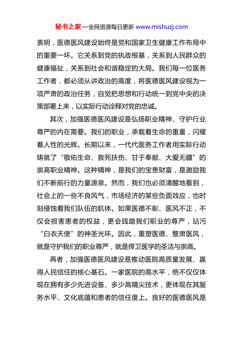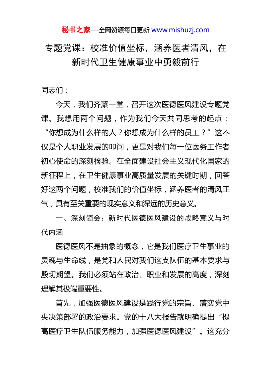 秘书之家—全网资源每日更新 www.mishuzj.com专题党课:校准价值坐标,涵养医者清风,在新时代卫生健康事业中勇毅前行 同志们:今天,我们齐聚一堂,召开这次医德医风建设专题党课。我想用两个问题,作为我们今天共同思考的起点:“你想成为什么样的人?你想成为什么样的员工?”这不仅是个人职业发展的叩问,更是对我们每一位医务工作者初心使命的深刻检验。在全面建设社会主义现代化国家的新征程上,在卫生健康事业高质量发展的关键时期,回答好这两个问题,校准我们的价值坐标,涵养医者的清风正气,具有至关重要的现实意义和深远的历史意义。一、深刻领会:新时代医德医风建设的战略意义与时代内涵医德医风不是抽象的概念,它是我们医疗卫生事业的灵魂与生命线,是党和人民对我们这支队伍的基本要求与殷切期望。我们必须站在政治、职业和发展的高度,深刻理解其极端重要性。首先,加强医德医风建设是践行党的宗旨、落实党中央决策部署的政治要求。党的十八大报告就明确提出“提高医疗卫生队伍服务能力,加强医德医风建设”。这充分秘书之家—全网资源每日更新 www.mishuzj.com表明,医德医风建设始终是党和国家卫生健康工作布局中的重要一环。它关系到党的执政根基,关系到人民群众的健康福祉,关系到社会和谐稳定的大局。我们每一位医务工作者,都必须从讲政治的高度,将医德医风建设视为一项严肃的政治任务,自觉把思想和行动统一到党中央的决策部署上来,以实际行动诠释对党的忠诚。其次,加强医德医风建设是弘扬职业精神、守护行业尊严的内在需要。我们的职业,承载着生命的重量,闪耀着人性的光辉。长期以来,一代代医务工作者用实际行动铸就了“敬佑生命、救死扶伤、甘于奉献、大爱无疆”的崇高职业精神。这种精神,是我们的宝贵财富,是激励我们不断前行的力量源泉。然而,我们也必须清醒地看到,社会上的一些不良风气,市场经济的某些负面效应,也时刻侵蚀着我们队伍的肌体。如果医德不彰、医风不正,不仅会损害患者的权益,更会践踏我们职业的尊严,玷污“白衣天使”的神圣光环。因此,重塑医德、整肃医风,就是守护我们的职业尊严,就是捍卫医学的圣洁与崇高。再者,加强医德医风建设是推动医院高质量发展、赢得人民信任的核心基石。一家医院的高水平,绝不仅仅体现在拥有多少先进设备、多少高精尖技术,更体现在其服务水平、文化底蕴和患者的信任度上。良好的医德医风是秘书之家—全网资源每日更新 www.mishuzj.com医院最宝贵的无形资产,是提升核心竞争力的关键所在。它能够构建和谐的医患关系,减少医疗纠纷,提升患者满意度,从而为医院的持续健康发展营造优良的内部环境和外部口碑。可以说,医德医风建设的成效,直接决定了我们医院能走多远、能飞多高。二、清醒认知:当前我院医德医风建设的成效、挑战与根源近年来,我院党委始终高度重视医德医风建设,通过一系列举措,取得了显著成效。我们欣喜地看到,全院职工的服务意识普遍增强,患者满意度持续攀升。根据最新的数据显示,我院门诊患者满意度已从三年前的 87.5%提升至 96.2%,住院患者满意度稳定在 98%以上。医疗纠纷的发生率同比下降了近 40%,一些科室甚至实现了年度医疗纠纷零发生。通过优化诊疗流程,我们推行了智慧预约、一站式结算等服务,患者平均就诊时间缩短了约30%,入院患者诊断符合率、手术前后诊断符合率等关键指标均稳定保持在 98%以上。这些成绩的取得,凝聚着全院上下每一位同志的辛勤付出和无私奉献。在肯定成绩的同时,我们更要敢于正视问题,保持清醒的头脑。对照党和人民的期望,对照新时代卫生健康事业的要求,我们的医德医风建设依然面临严峻挑战。主要秘书之家—全网资源每日更新 www.mishuzj.com表现在:一是服务态度仍需改进。少数同志存在“生、冷、硬、顶”现象,对患者缺乏耐心和同理心,沟通解释不到位,容易引发误解和矛盾。二是职业操守面临考验。虽然“红包”、回扣等歪风邪气得到有效遏制,但在个别领域、个别环节,依然存在隐性风险,廉洁防线需要进一步加固。三是诊疗行为有待规范。个别医务人员在诊疗过程中,存在过度检查、过度用药的倾向,不仅加重了患...