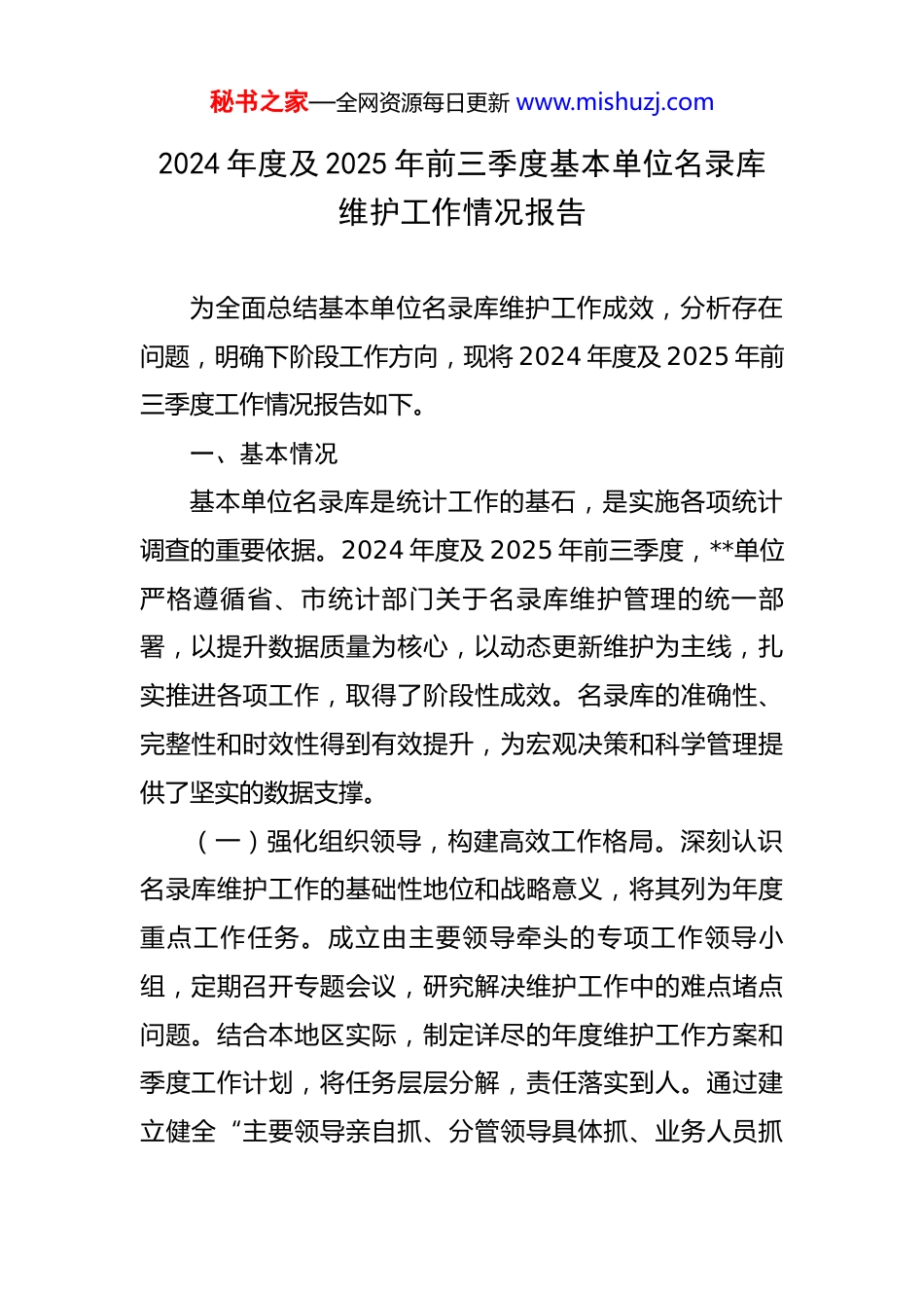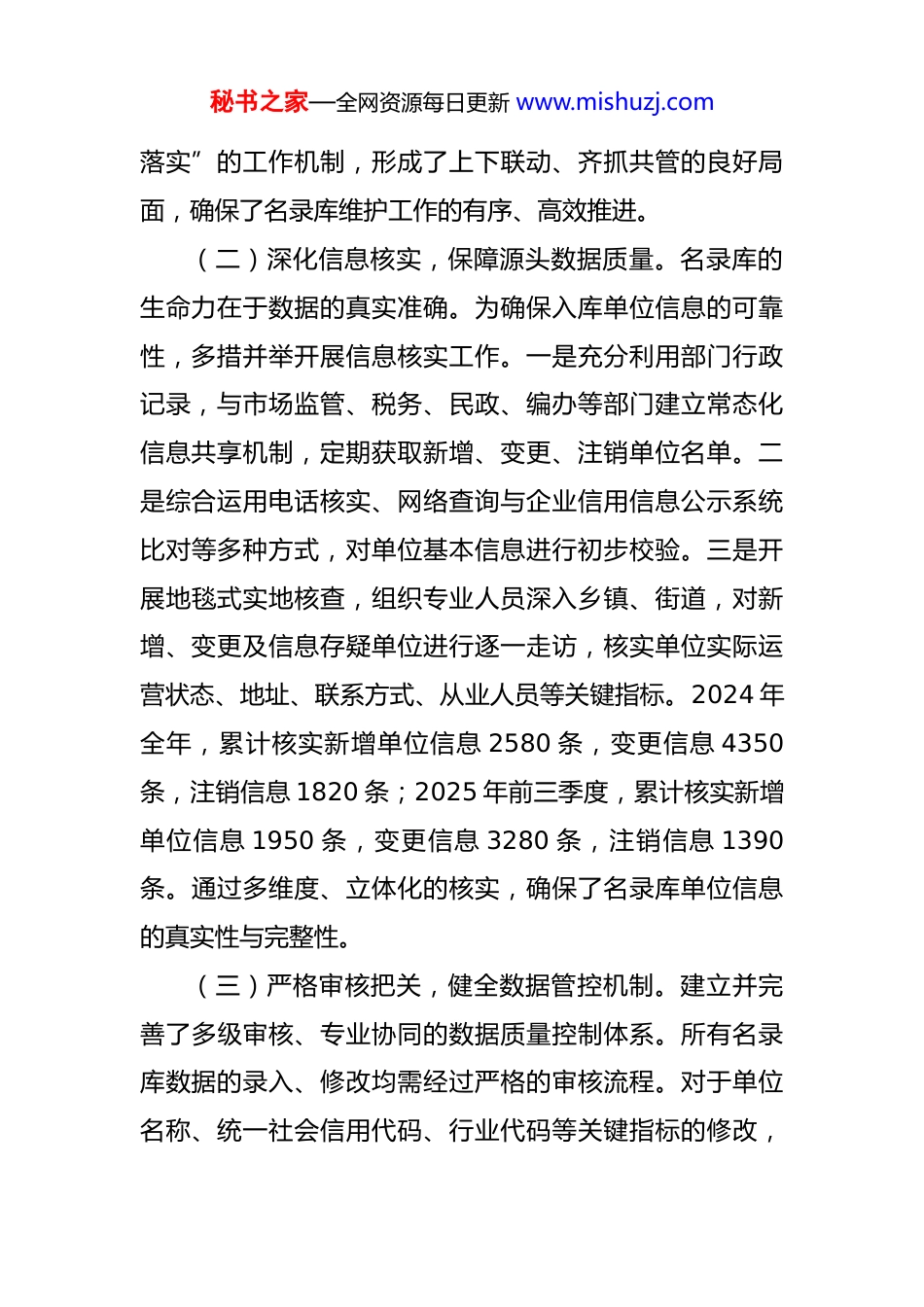秘书之家—全网资源每日更新 www.mishuzj.com2024 年度及 2025 年前三季度基本单位名录库维护工作情况报告 为全面总结基本单位名录库维护工作成效,分析存在问题,明确下阶段工作方向,现将 2024 年度及 2025 年前三季度工作情况报告如下。一、基本情况基本单位名录库是统计工作的基石,是实施各项统计调查的重要依据。2024 年度及 2025 年前三季度,**单位严格遵循省、市统计部门关于名录库维护管理的统一部署,以提升数据质量为核心,以动态更新维护为主线,扎实推进各项工作,取得了阶段性成效。名录库的准确性、完整性和时效性得到有效提升,为宏观决策和科学管理提供了坚实的数据支撑。(一)强化组织领导,构建高效工作格局。深刻认识名录库维护工作的基础性地位和战略意义,将其列为年度重点工作任务。成立由主要领导牵头的专项工作领导小组,定期召开专题会议,研究解决维护工作中的难点堵点问题。结合本地区实际,制定详尽的年度维护工作方案和季度工作计划,将任务层层分解,责任落实到人。通过建立健全“主要领导亲自抓、分管领导具体抓、业务人员抓秘书之家—全网资源每日更新 www.mishuzj.com落实”的工作机制,形成了上下联动、齐抓共管的良好局面,确保了名录库维护工作的有序、高效推进。(二)深化信息核实,保障源头数据质量。名录库的生命力在于数据的真实准确。为确保入库单位信息的可靠性,多措并举开展信息核实工作。一是充分利用部门行政记录,与市场监管、税务、民政、编办等部门建立常态化信息共享机制,定期获取新增、变更、注销单位名单。二是综合运用电话核实、网络查询与企业信用信息公示系统比对等多种方式,对单位基本信息进行初步校验。三是开展地毯式实地核查,组织专业人员深入乡镇、街道,对新增、变更及信息存疑单位进行逐一走访,核实单位实际运营状态、地址、联系方式、从业人员等关键指标。2024 年全年,累计核实新增单位信息 2580 条,变更信息 4350条,注销信息 1820 条;2025 年前三季度,累计核实新增单位信息 1950 条,变更信息 3280 条,注销信息 1390条。通过多维度、立体化的核实,确保了名录库单位信息的真实性与完整性。(三)严格审核把关,健全数据管控机制。建立并完善了多级审核、专业协同的数据质量控制体系。所有名录库数据的录入、修改均需经过严格的审核流程。对于单位名称、统一社会信用代码、行业代码等关键指标的修改,秘书之家—全网资源每日更新 www.mishuzj.com实行双人复核制度。各专业科室深度参与审核工作,对涉及本专业的指标变更进行专业把关,一旦发现差错或逻辑矛盾,立即反馈至名录库维护人员进行修正。2024 年以来,累计发现并修正各类数据错误 680 余笔,其中强制性审核错误修正率达 100%。通过构建专业审核、交叉校验、及时反馈的闭环管理,有效降低了数据差错率,提升了名录库整体数据质量,为后续各项统计报表的顺利开展奠定了坚实基础。二、存在问题在肯定成绩的同时,也清醒地认识到,基本单位名录库维护工作是一项复杂的系统工程,当前仍面临一些亟待解决的困难和挑战。(一)部门协同效能有待提升,数据共享存在壁垒。名录库维护高度依赖各部门的行政记录,但当前部门间的协同配合仍存在障碍。一是数据共享机制不够顺畅,部分部门提供的数据存在滞后性、不完整性和口径不一致问题,如单位注册地址模糊、联系方式缺失、更新不及时等,增加了后续核实工作的难度。二是缺乏统一的数据交换标准和平台,各部门数据格式、指标含义存在差异,数据整合与清洗工作量巨大。三是部分基层单位配合度不高,需要反复沟通协调,影响了整体工作效率。这种“数秘书之家—全网资源每日更新 www.mishuzj.com据孤岛”现象在一定程度上制约了名录库动态更新的及时性和准确性。(二)基层工作力量相对薄弱,维护任务异常繁重。随着商事制度改革的深化和“放管服”改革的推进,市场主体数量激增,名录库维护工作量呈几何级数增长。一个县(区)每季度新增、变更、注销单位数量可达数千家。然而,基层统计部门人员编制有限,往往一人承担多项统计业务,名录库维护专职人员不足。加之基层...