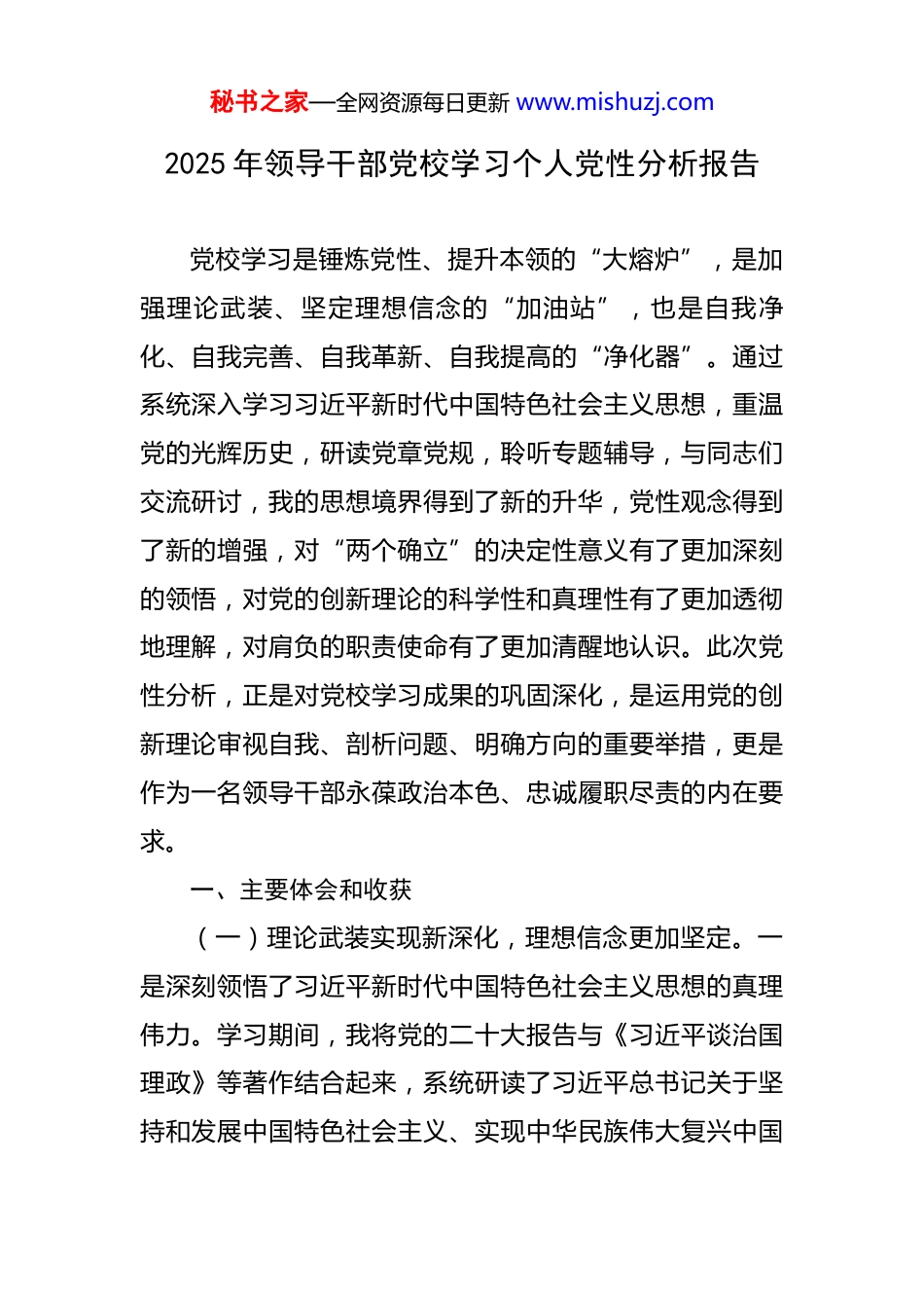 秘书之家—全网资源每日更新 www.mishuzj.com2025 年领导干部党校学习个人党性分析报告 党校学习是锤炼党性、提升本领的“大熔炉”,是加强理论武装、坚定理想信念的“加油站”,也是自我净化、自我完善、自我革新、自我提高的“净化器”。通过系统深入学习习近平新时代中国特色社会主义思想,重温党的光辉历史,研读党章党规,聆听专题辅导,与同志们交流研讨,我的思想境界得到了新的升华,党性观念得到了新的增强,对“两个确立”的决定性意义有了更加深刻的领悟,对党的创新理论的科学性和真理性有了更加透彻地理解,对肩负的职责使命有了更加清醒地认识。此次党性分析,正是对党校学习成果的巩固深化,是运用党的创新理论审视自我、剖析问题、明确方向的重要举措,更是作为一名领导干部永葆政治本色、忠诚履职尽责的内在要求。一、主要体会和收获(一)理论武装实现新深化,理想信念更加坚定。一是深刻领悟了习近平新时代中国特色社会主义思想的真理伟力。学习期间,我将党的二十大报告与《习近平谈治国理政》等著作结合起来,系统研读了习近平总书记关于坚持和发展中国特色社会主义、实现中华民族伟大复兴中国秘书之家—全网资源每日更新 www.mishuzj.com梦的一系列重要论述,特别是对“两个结合”和“六个坚持”的科学内涵有了更加深刻的理解,认识到党的创新理论来源于实践、指导实践、又在实践中不断发展,是当代中国马克思主义、二十一世纪马克思主义。通过深入学习,我的理论素养得到显著提升,对马克思主义信仰、共产主义远大理想和社会主义共同理想的认识更加坚定,对中国特色社会主义道路、理论、制度、文化更加自信。二是深刻把握了党的二十大精神的丰富内涵。党的二十大报告高屋建瓴、思想深邃,深刻阐明了过去五年工作和新时代十年伟大变革的重大意义,系统擘画了以中国式现代化全面推进中华民族伟大复兴的宏伟蓝图。通过专题学习和分组研讨,我对党的二十大精神的核心要义、精神实质、丰富内涵和实践要求有了更全面、更系统地把握,特别是对新时代新征程党的使命任务、中国式现代化的战略部署、全面从严治党的重大意义等有了更为深刻的理解,进一步坚定了捍卫“两个确立”、做到“两个维护”的政治自觉。三是深刻认识到理论学习的长期性和重要性。党的二十大报告强调,拥有马克思主义科学理论指导是我们党坚定信仰信念、把握历史主动的根本所在。我深刻认识到,理论学习是一项长期任务,必须持之以恒、久久为功,不能停留在表面,要做到真学真懂真信真用,把党的秘书之家—全网资源每日更新 www.mishuzj.com创新理论作为修身立业的根本遵循。(二)政治能力实现新提高,对党忠诚更加自觉。一是政治站位进一步提升。通过学习党章、党规党纪以及习近平总书记关于加强党的政治建设的重要论述,我深刻认识到,领导干部必须旗帜鲜明讲政治,善于从政治上看问题、办事情,始终胸怀“国之大者”,把本职工作放到党和国家事业发展大局中去思考和谋划。我更加深刻地理解了“两个确立”的决定性意义,这不仅是历史的选择、人民的选择,更是实践的检验、时代的要求,是新时代取得一切成就最根本的保证。二是政治判断力、政治领悟力、政治执行力显著增强。党校学习中,我们重点学习了党的政治建设的理论与实践,通过案例分析和研讨交流,我认识到,领导干部要不断提高政治敏锐性和鉴别力,善于从纷繁复杂的现象中把握事物的政治本质,从一般事务中发现政治端倪,确保各项工作始终沿着正确政治方向前进。要深刻领会党中央的战略意图,做到不折不扣、雷厉风行地贯彻落实党中央决策部署,不搞变通、不打折扣,坚决维护党中央的集中统一领导。三是严守政治纪律和政治规矩的自觉性进一步增强。纪律是管党治党的“戒尺”,政治纪律是党最根本、最重要的纪律。通过对党内政治生活的若干准则、纪律处分条例的再学习,我进一步强化了对秘书之家—全网资源每日更新 www.mishuzj.com纪律和规矩的敬畏之心,认识到必须时刻绷紧纪律这根弦,严格遵守党的各项纪律特别是政治纪律和政治规矩,做到令行禁止、步调一致,确保在思想上政治上行动上同以习近平同志为核心的党中央保持高度一...