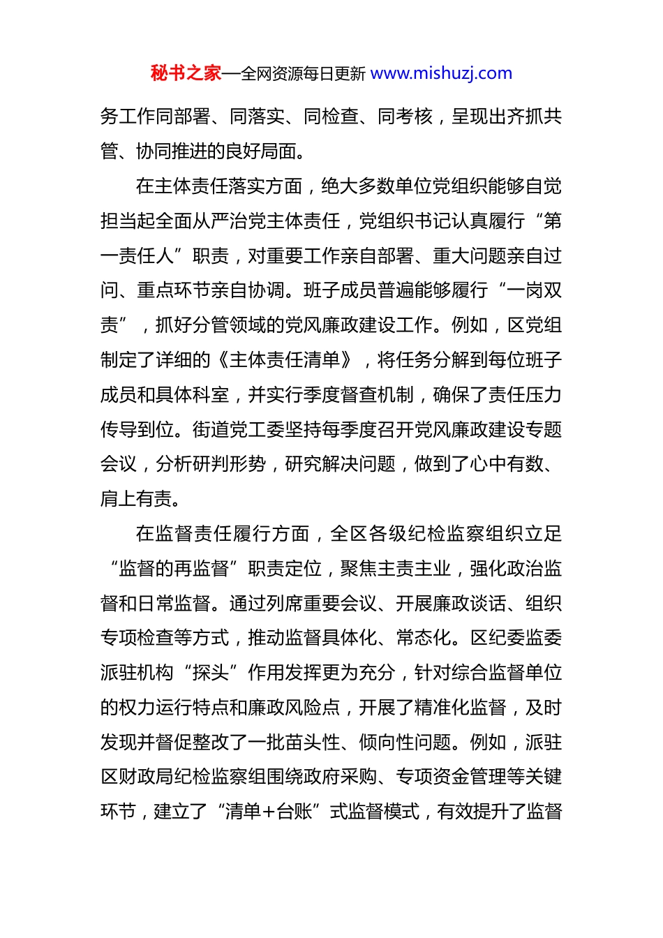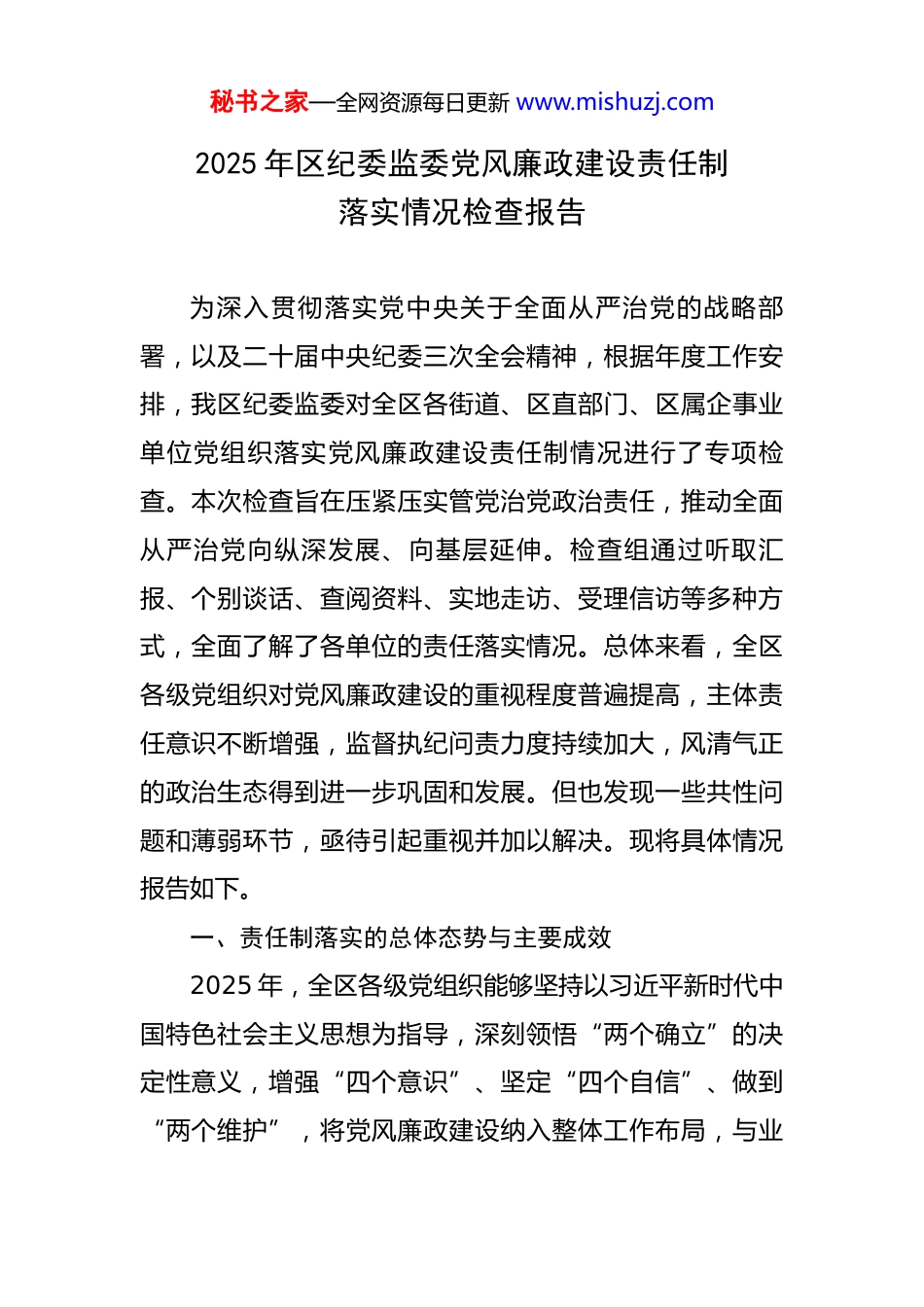 秘书之家—全网资源每日更新 www.mishuzj.com2025 年区纪委监委党风廉政建设责任制落实情况检查报告 为深入贯彻落实党中央关于全面从严治党的战略部署,以及二十届中央纪委三次全会精神,根据年度工作安排,我区纪委监委对全区各街道、区直部门、区属企事业单位党组织落实党风廉政建设责任制情况进行了专项检查。本次检查旨在压紧压实管党治党政治责任,推动全面从严治党向纵深发展、向基层延伸。检查组通过听取汇报、个别谈话、查阅资料、实地走访、受理信访等多种方式,全面了解了各单位的责任落实情况。总体来看,全区各级党组织对党风廉政建设的重视程度普遍提高,主体责任意识不断增强,监督执纪问责力度持续加大,风清气正的政治生态得到进一步巩固和发展。但也发现一些共性问题和薄弱环节,亟待引起重视并加以解决。现将具体情况报告如下。一、责任制落实的总体态势与主要成效2025 年,全区各级党组织能够坚持以习近平新时代中国特色社会主义思想为指导,深刻领悟“两个确立”的决定性意义,增强“四个意识”、坚定“四个自信”、做到“两个维护”,将党风廉政建设纳入整体工作布局,与业秘书之家—全网资源每日更新 www.mishuzj.com务工作同部署、同落实、同检查、同考核,呈现出齐抓共管、协同推进的良好局面。在主体责任落实方面,绝大多数单位党组织能够自觉担当起全面从严治党主体责任,党组织书记认真履行“第一责任人”职责,对重要工作亲自部署、重大问题亲自过问、重点环节亲自协调。班子成员普遍能够履行“一岗双责”,抓好分管领域的党风廉政建设工作。例如,区党组制定了详细的《主体责任清单》,将任务分解到每位班子成员和具体科室,并实行季度督查机制,确保了责任压力传导到位。街道党工委坚持每季度召开党风廉政建设专题会议,分析研判形势,研究解决问题,做到了心中有数、肩上有责。在监督责任履行方面,全区各级纪检监察组织立足“监督的再监督”职责定位,聚焦主责主业,强化政治监督和日常监督。通过列席重要会议、开展廉政谈话、组织专项检查等方式,推动监督具体化、常态化。区纪委监委派驻机构“探头”作用发挥更为充分,针对综合监督单位的权力运行特点和廉政风险点,开展了精准化监督,及时发现并督促整改了一批苗头性、倾向性问题。例如,派驻区财政局纪检监察组围绕政府采购、专项资金管理等关键环节,建立了“清单+台账”式监督模式,有效提升了监督秘书之家—全网资源每日更新 www.mishuzj.com的针对性和实效性。在思想教育和作风建设方面,各单位普遍加强了党纪国法和廉政警示教育,组织学习新修订的《中国共产党纪律处分条例》,观看警示教育片,通报典型案例,用身边事教育身边人,党员干部的纪律规矩意识和廉洁自律意识得到进一步增强。区市场监管局通过开展“廉洁文化宣传月”活动,打造机关廉洁文化长廊,营造了崇廉尚洁的浓厚氛围。在持续纠治“四风”方面,全区对形式主义、官僚主义顽瘴痼疾进行了深入整治,文件会议数量得到有效控制,督查检查考核更加注重实效;对享乐主义、奢靡之风露头就打,严防隐形变异问题,公款吃喝、公车私用等现象得到有效遏制。在权力监督制约方面,各单位注重扎紧制度笼子,针对检查中发现的管理漏洞和廉政风险,及时修订完善内部管理制度。区住建局针对工程招投标领域风险,优化了评审专家抽取和监管流程,减少了人为干预空间。许多单位推行权力运行流程图公开,将关键岗位的行使依据、程序、结果置于阳光之下,主动接受干部群众监督。二、检查中发现的主要问题与不足在肯定成绩的同时,我们必须清醒地看到,与新时代全面从严治党的要求相比,与人民群众的期待相比,我区秘书之家—全网资源每日更新 www.mishuzj.com党风廉政建设责任制落实工作仍存在一些不容忽视的问题。一是主体责任压力传导存在“上热中温下冷”现象。部分区直部门的下属事业单位、基层站所以及街道社区的党组织,对党风廉政建设的重要性认识依然不足,存在“说起来重要、做起来次要”的倾向。有的单位落实责任停留在开会、发文层面,缺乏针对性和有效抓手,责任压力未能有效传导至“神经末梢”。“第一责任人”职责履行不...