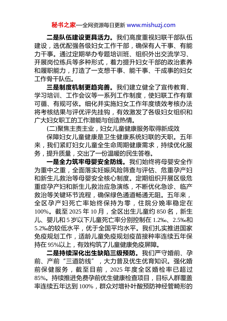 秘书之家—全网资源每日更新 www.mishuzj.comxx 区卫生健康系统妇女联合会工作报告各位代表、同志们:受 xx 区卫生健康系统妇女联合会第一届执行委员会的委托,我向大会作工作报告,请予审议。过去五年,是本系统妇女联合会正式成立并蓬勃发展的五年。在区委、区政府和局*组的坚强领导下,在上级妇联的精心指导下,我们始终坚持以**************思想为指导,全面学习贯彻*的二十大精神,深入践行******关于妇女儿童和妇联工作的重要论述,团结带领全系统广大妇女职工围绕中心、服务大局,锐意进取、扎实工作,圆满完成了各项目标任务,谱写了新时代卫生健康领域妇女事业的新篇章。一、过去五年的主要工作及成效五年来,我们始终坚持“dj 带妇建、妇建服务 dj”的工作原则,将妇女工作融入卫生健康事业发展全局,在组织建设、健康服务、权益维护、岗位建功等方面取得了显著成效。(一)坚持 dj 引领,组织体系建设迈上新台阶我们深刻认识到,加强*对妇女工作的全面领导是根本保证。五年来,我们始终将妇女工作置于系统 dj 工作大局中谋划和推进。一是组织基础更加坚实。2020 年底,我们顺应新时代妇联组织改革要求,成功召开第一次妇女代表大会,选举产生了第一届执行委员会,标志着系统妇联工作进入了规范化、体系化的新阶段。五年来,我们坚持将妇女工作纳入卫生健康事业发展总体规划和年度工作要点,与业务工作同部署、同考核,形成了分管领导主抓、承办股室落实基层单位协同的工作格局。秘书之家—全网资源每日更新 www.mishuzj.com二是队伍建设更具活力。我们高度重视妇联干部队伍建设,选优配强各级妇女工作干部,确保有人干事、有能力干事。通过定期举办专题培训班、组织外出交流学习、开展岗位练兵等多种形式,着力提升妇女干部的政治素养和履职能力,打造了一支想干事、能干事、干成事的妇女工作骨干队伍。三是制度机制更趋完善。我们建立健全了宣传教育、学习培训、工作会议等一系列工作制度,使妇联工作有章可循、有规可依。细化并实施妇女工作年度绩效考核办法将考核结果与评优评先挂钩,有效激发了各级妇女组织和广大妇女职工的工作潜能与创造热情。(二)聚焦主责主业,妇女儿童健康服务取得新成效保障妇女儿童健康是卫生健康系统妇联的天职。五年来,我们紧盯妇女儿童全生命周期健康需求,持续优化服务,提升质量,交出了一份温暖的民生答卷。一是全力筑牢母婴安全防线。我们始终将母婴安全作为重中之重,全面落实妊娠风险筛查与评估、危重孕产妇和新生儿救治等母婴安全核心制度。定期组织开展区级危重症孕产妇和新生儿救治应急演练,不断优化急诊、临产救治等关键环节流程,确保绿色通道畅通无阻。五年来,全区孕产妇死亡率始终保持为零,住院分娩率稳定在100%。截至 2025 年 10 月,全区出生儿童约 850 名,新生儿、婴儿和 5 岁以下儿童死亡率分别控制在 1.2‰、2.5‰和5.2‰的较低水平,优于全国平均水平。我们扎实推进国家免疫规划工作,适龄儿童免疫规划疫苗接种率连续五年保持在 95%以上,有效构筑了儿童健康免疫屏障。二是持续深化出生缺陷三级预防。我们严守婚前、孕前、产前“三道防线”,大力普及优生优育知识。强化婚前保健服务,截至目前,2025 年度全区婚检率已超过85%。持续推进免费孕前优生健康检查项目,目标人群覆盖率连续五年达到 100%,群众对增补叶酸预防神经管畸形的秘书之家—全网资源每日更新 www.mishuzj.com知识知晓率超过 96%。加强产前筛查和诊断网络建设,不断提高产前筛查率,全力做好出生缺陷患儿的医疗和康复救助工作,有效降低了出生缺陷发生率。三是精准抓实重大疾病防治工作。我们持续推进艾滋病、梅毒、乙肝母婴传播阻断项目,通过早发现、早干预早治疗,有效降低了母婴垂直传播率。五年来,孕产妇艾滋病、梅毒、乙肝检测率均保持在 98%以上,孕早期检测率超过 95%,为守护下一代健康奠定了坚实基础。四是稳步扩大“两癌”免费筛查覆盖面。作为牵头实施的重点民生实事项目,我们联合相关部门,持续加大宫颈癌和乳腺癌免费检查的宣传动员和组织实施力度。通过“线上+线下”多种渠道普及“两癌”防治知识...