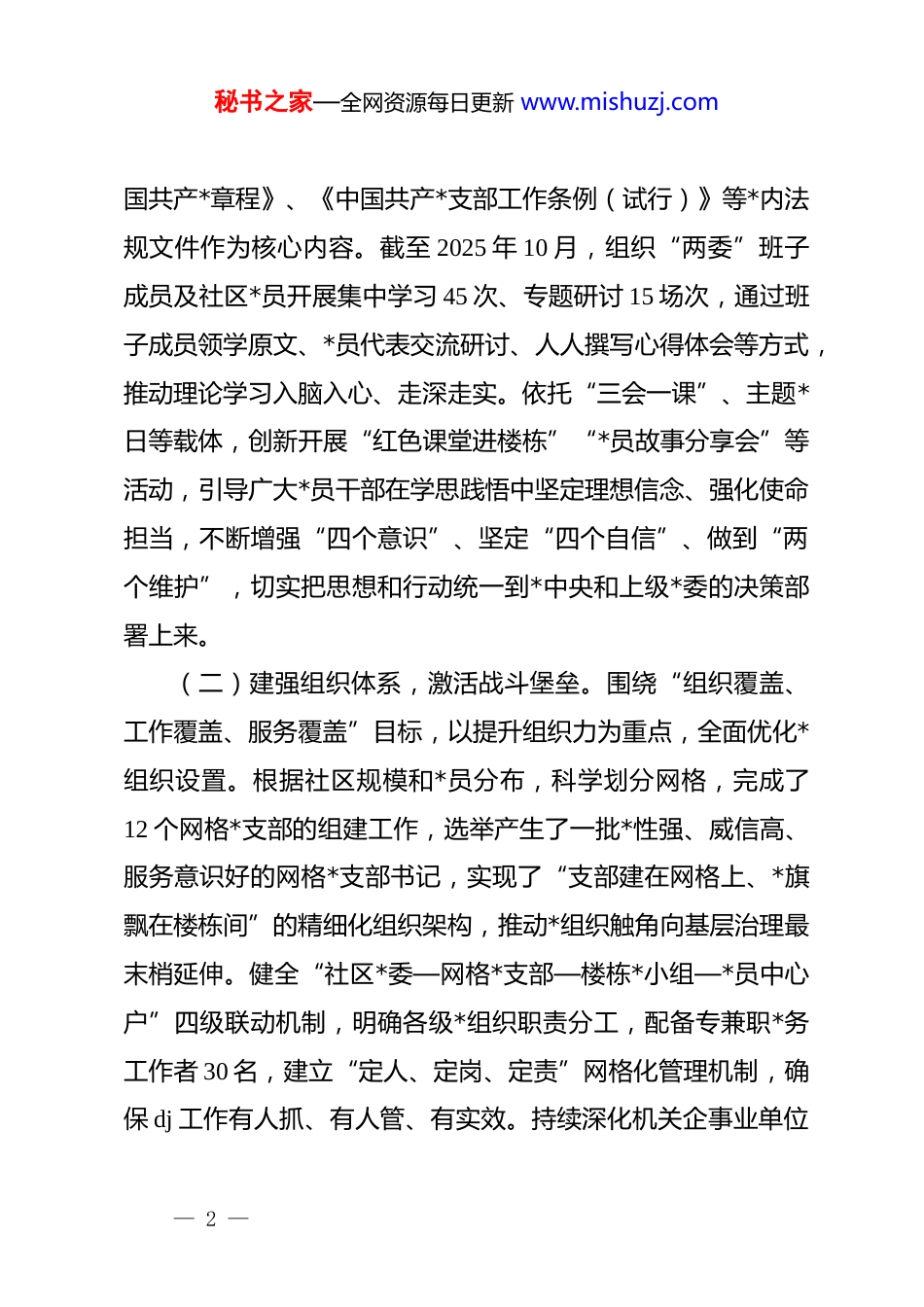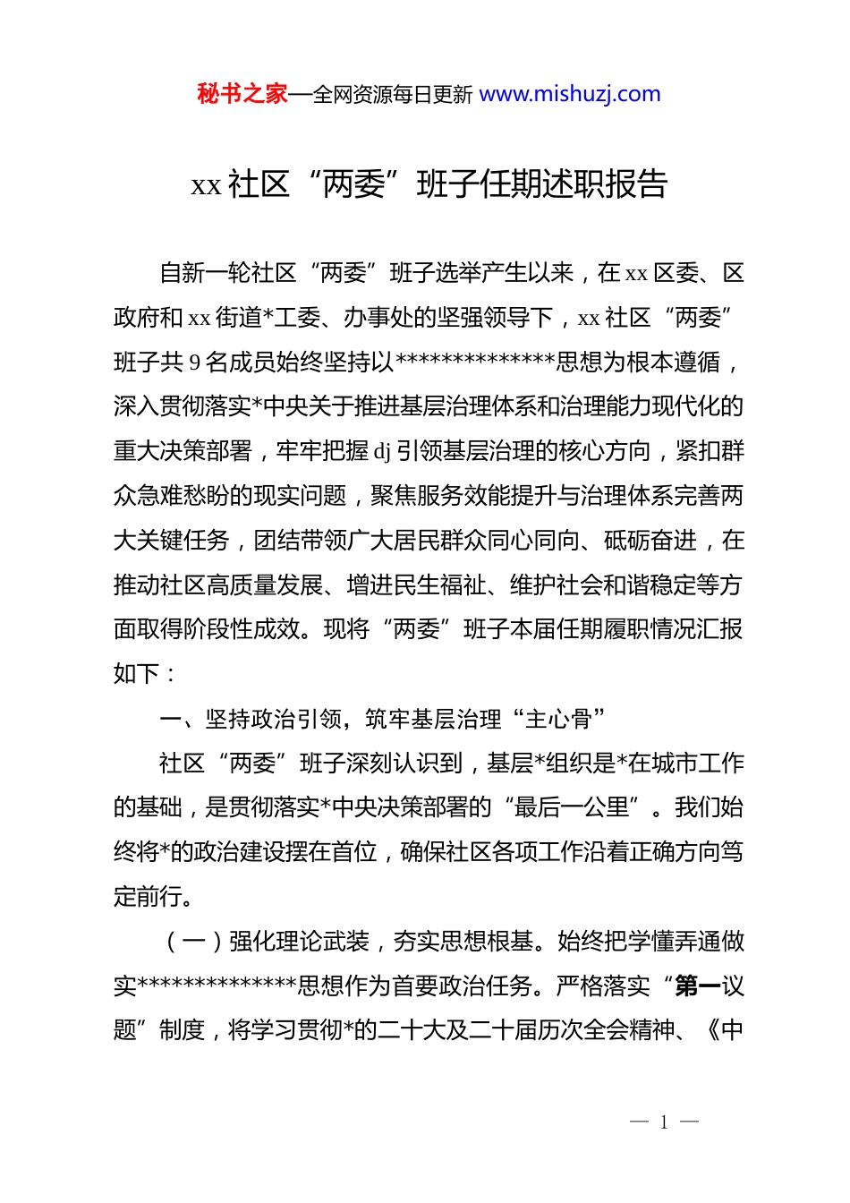 秘书之家—全网资源每日更新 www.mishuzj.comxx 社区“两委”班子任期述职报告自新一轮社区“两委”班子选举产生以来,在 xx 区委、区政府和 xx 街道*工委、办事处的坚强领导下,xx 社区“两委”班子共 9 名成员始终坚持以**************思想为根本遵循,深入贯彻落实*中央关于推进基层治理体系和治理能力现代化的重大决策部署,牢牢把握 dj 引领基层治理的核心方向,紧扣群众急难愁盼的现实问题,聚焦服务效能提升与治理体系完善两大关键任务,团结带领广大居民群众同心同向、砥砺奋进,在推动社区高质量发展、增进民生福祉、维护社会和谐稳定等方面取得阶段性成效。现将“两委”班子本届任期履职情况汇报如下:一、坚持政治引领,筑牢基层治理“主心骨”社区“两委”班子深刻认识到,基层*组织是*在城市工作的基础,是贯彻落实*中央决策部署的“最后一公里”。我们始终将*的政治建设摆在首位,确保社区各项工作沿着正确方向笃定前行。(一)强化理论武装,夯实思想根基。始终把学懂弄通做实**************思想作为首要政治任务。严格落实“第一议题”制度,将学习贯彻*的二十大及二十届历次全会精神、《中— 1 —秘书之家—全网资源每日更新 www.mishuzj.com国共产*章程》、《中国共产*支部工作条例(试行)》等*内法规文件作为核心内容。截至 2025 年 10 月,组织“两委”班子成员及社区*员开展集中学习 45 次、专题研讨 15 场次,通过班子成员领学原文、*员代表交流研讨、人人撰写心得体会等方式,推动理论学习入脑入心、走深走实。依托“三会一课”、主题*日等载体,创新开展“红色课堂进楼栋”“*员故事分享会”等活动,引导广大*员干部在学思践悟中坚定理想信念、强化使命担当,不断增强“四个意识”、坚定“四个自信”、做到“两个维护”,切实把思想和行动统一到*中央和上级*委的决策部署上来。(二)建强组织体系,激活战斗堡垒。围绕“组织覆盖、工作覆盖、服务覆盖”目标,以提升组织力为重点,全面优化*组织设置。根据社区规模和*员分布,科学划分网格,完成了12 个网格*支部的组建工作,选举产生了一批*性强、威信高、服务意识好的网格*支部书记,实现了“支部建在网格上、*旗飘在楼栋间”的精细化组织架构,推动*组织触角向基层治理最末梢延伸。健全“社区*委—网格*支部—楼栋*小组—*员中心户”四级联动机制,明确各级*组织职责分工,配备专兼职*务工作者 30 名,建立“定人、定岗、定责”网格化管理机制,确保 dj 工作有人抓、有人管、有实效。持续深化机关企事业单位— 2 —秘书之家—全网资源每日更新 www.mishuzj.com*组织和在职*员“双报到”机制,主动对接辖区内 xx 局、xx 医院等 10 余家单位,引导其下沉资源、下沉力量。任期内,累计组织“双报到”*员参与社区疫情防控、文明创建、普法宣传等志愿服务 500 余人次,共同认领并完成了居民“微心愿”120 项,有效推动了 dj 资源与社区治理需求精准对接,充分激活了基层*组织的战斗堡垒作用。(三)严明纪律规矩,涵养清朗生态。坚持把纪律和规矩挺在前面,营造风清气正的政治生态和干事创业的良好环境。严格执行民主集中制原则,修订并完善了《xx 社区“两委”议事决策规则》,明确“四议两公开”工作法,凡涉及社区发展规划、重大项目实施、大额资金使用、集体资产处置等重大事项,均经“两委”联席会议、*员大会和居民代表会议集体研究决定。任期内,共召开“两委”联席会议 25 次,审议各类事项80 项,所有事项均严格按照法定程序推进,确保决策过程科学民主、结果合规合法。加强廉政风险防控体系建设,为“两委”干部和社区关键岗位人员建立个人廉洁档案,动态记录廉洁履职情况。定期开展谈心谈话,实现对“两委”干部、网格*支部书记谈心谈话全覆盖。任期内组织观看警示教育片 5 次,赴 xx 市廉政教育基地参观学习 1 次,通报典型违纪违法案例 10起,通过以案为鉴、以案明纪,引导社区干部知敬畏、存戒惧、— 3 —秘书之家—全网资源每日更新 www.mishuzj.com守底线,自觉筑牢拒腐防变的思想防线。二、聚焦为民服务,织密民生保障“暖心网”社...