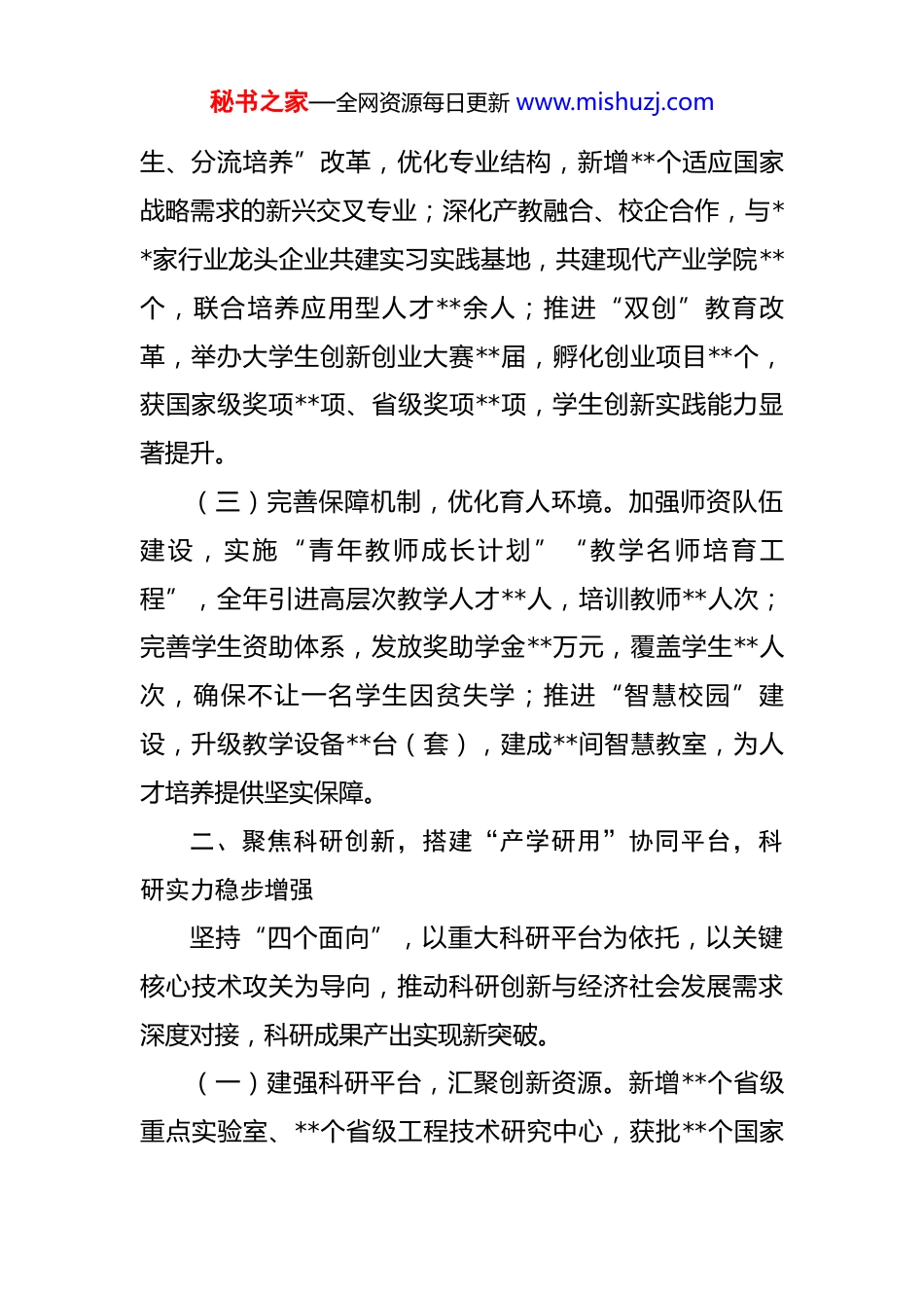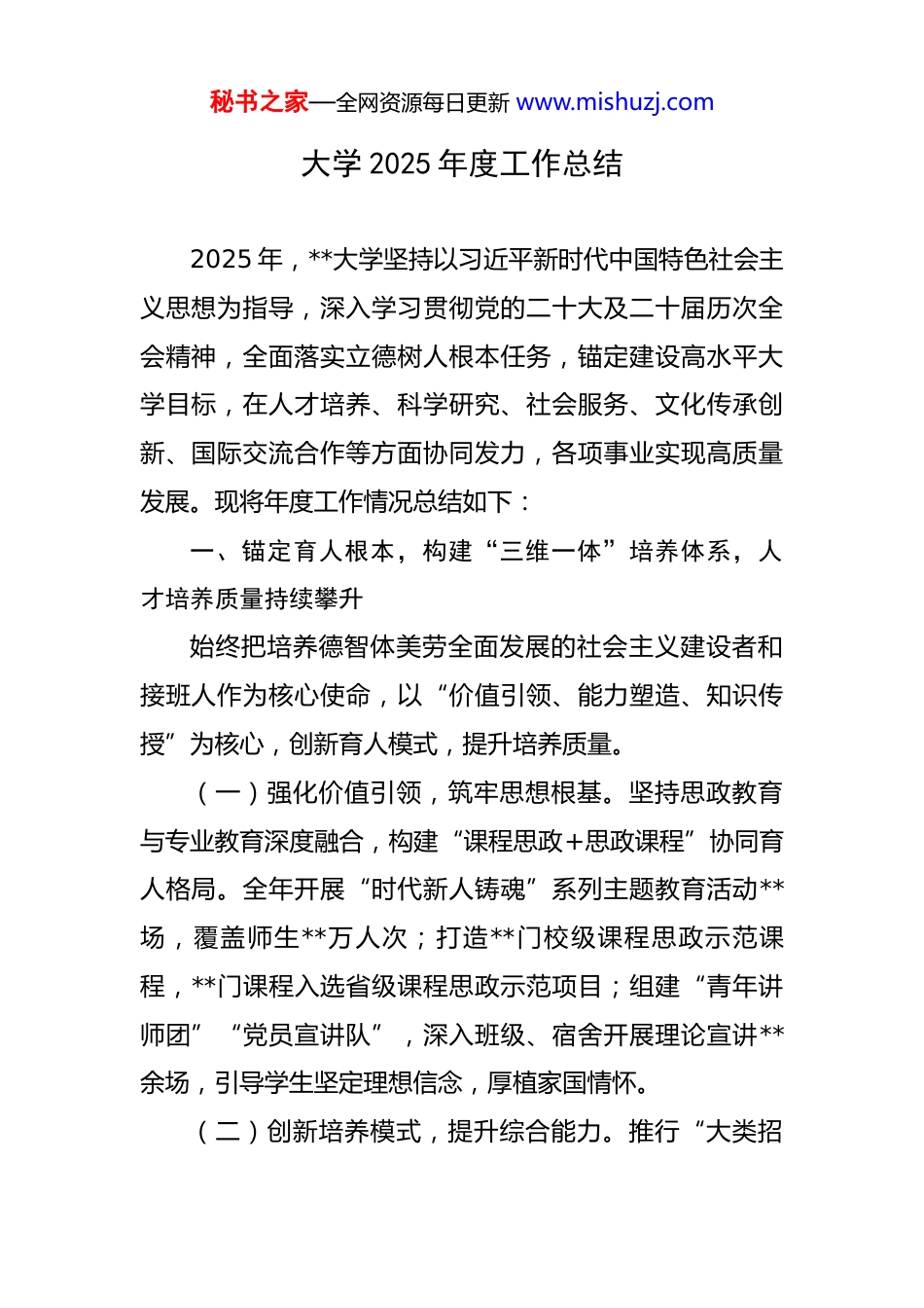 秘书之家—全网资源每日更新 www.mishuzj.com大学 2025 年度工作总结 2025 年,**大学坚持以习近平新时代中国特色社会主义思想为指导,深入学习贯彻党的二十大及二十届历次全会精神,全面落实立德树人根本任务,锚定建设高水平大学目标,在人才培养、科学研究、社会服务、文化传承创新、国际交流合作等方面协同发力,各项事业实现高质量发展。现将年度工作情况总结如下:一、锚定育人根本,构建“三维一体”培养体系,人才培养质量持续攀升始终把培养德智体美劳全面发展的社会主义建设者和接班人作为核心使命,以“价值引领、能力塑造、知识传授”为核心,创新育人模式,提升培养质量。(一)强化价值引领,筑牢思想根基。坚持思政教育与专业教育深度融合,构建“课程思政+思政课程”协同育人格局。全年开展“时代新人铸魂”系列主题教育活动**场,覆盖师生**万人次;打造**门校级课程思政示范课程,**门课程入选省级课程思政示范项目;组建“青年讲师团”“党员宣讲队”,深入班级、宿舍开展理论宣讲**余场,引导学生坚定理想信念,厚植家国情怀。(二)创新培养模式,提升综合能力。推行“大类招秘书之家—全网资源每日更新 www.mishuzj.com生、分流培养”改革,优化专业结构,新增**个适应国家战略需求的新兴交叉专业;深化产教融合、校企合作,与**家行业龙头企业共建实习实践基地,共建现代产业学院**个,联合培养应用型人才**余人;推进“双创”教育改革,举办大学生创新创业大赛**届,孵化创业项目**个,获国家级奖项**项、省级奖项**项,学生创新实践能力显著提升。(三)完善保障机制,优化育人环境。加强师资队伍建设,实施“青年教师成长计划”“教学名师培育工程”,全年引进高层次教学人才**人,培训教师**人次;完善学生资助体系,发放奖助学金**万元,覆盖学生**人次,确保不让一名学生因贫失学;推进“智慧校园”建设,升级教学设备**台(套),建成**间智慧教室,为人才培养提供坚实保障。二、聚焦科研创新,搭建“产学研用”协同平台,科研实力稳步增强坚持“四个面向”,以重大科研平台为依托,以关键核心技术攻关为导向,推动科研创新与经济社会发展需求深度对接,科研成果产出实现新突破。(一)建强科研平台,汇聚创新资源。新增**个省级重点实验室、**个省级工程技术研究中心,获批**个国家秘书之家—全网资源每日更新 www.mishuzj.com级科研平台培育项目;优化科研资源配置,整合学科优势力量,组建**个交叉学科研究团队,围绕人工智能、生物医药、新材料等领域开展协同创新,全年科研经费到账**亿元,同比增长**%。(二)主攻关键领域,突破技术瓶颈。聚焦国家重大战略需求和区域经济发展痛点,承担国家级科研项目**项(其中重大重点项目**项)、省部级科研项目**项;在**等领域取得一批标志性成果,发表高水平学术论文**篇(其中 SCI/EI 收录**篇),获得国家发明专利授权**项,**项成果获省部级科技奖励。(三)深化成果转化,服务社会发展。建立健全科技成果转化机制,与地方政府、企业签订合作协议**项,技术合同成交额达**亿元;选派**名专家学者深入基层、企业开展技术指导和服务,助力地方产业升级和乡村振兴;依托学校智库平台,提交政策咨询报告**份,**份获省部级以上领导批示,为政府决策提供智力支持。三、坚持引育并举,打造“德才兼备”师资队伍,人才支撑作用凸显把师资队伍建设作为学校发展的核心战略,坚持“引才、育才、用才、留才”多措并举,着力打造一支政治素质过硬、业务能力精湛、育人水平高超的教师队伍。秘书之家—全网资源每日更新 www.mishuzj.com(一)精准引才,汇聚高端智力。实施“顶尖人才引育计划”“青年英才集聚计划”,全年引进国家级人才**人、省部级人才**人、青年博士**人;通过“柔性引才”方式,聘请国内外知名专家学者**人担任兼职教授、讲座教授,为学科建设和科研创新注入新活力。(二)系统育才,提升综合素养。完善教师培养培训体系,开展新教师岗前培训、青年教师教学能力提升培训、骨干教师研修等各类培训**场次,覆盖教师**人次;选派**名教师赴国内外知名高校、科研机构访学交流,支持**名...