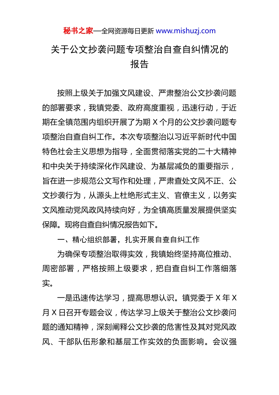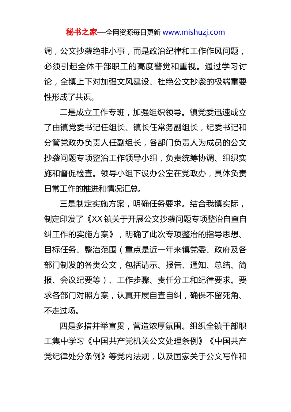 秘书之家—全网资源每日更新 www.mishuzj.com关于公文抄袭问题专项整治自查自纠情况的报告 按照上级关于加强文风建设、严肃整治公文抄袭问题的部署要求,我镇党委、政府高度重视,迅速行动,于近期在全镇范围内组织开展了为期 X 个月的公文抄袭问题专项整治自查自纠工作。本次专项整治以习近平新时代中国特色社会主义思想为指导,全面贯彻落实党的二十大精神和中央关于持续深化作风建设、为基层减负的重要指示,旨在进一步规范公文写作和处理,严肃查处文风不正、公文抄袭行为,从源头上杜绝形式主义、官僚主义,以务实文风推动党风政风持续向好,为全镇高质量发展提供坚实保障。现将自查自纠情况报告如下。一、精心组织部署,扎实开展自查自纠工作为确保专项整治取得实效,我镇始终坚持高位推动、周密部署,严格按照上级要求,把自查自纠工作落细落实。一是迅速传达学习,提高思想认识。镇党委于 X 年 X月 X 日召开专题会议,传达学习上级关于整治公文抄袭问题的通知精神,深刻阐释公文抄袭的危害性及其对党风政风、干部队伍形象和基层工作实效的负面影响。会议强秘书之家—全网资源每日更新 www.mishuzj.com调,公文抄袭绝非小事,而是政治纪律和工作作风问题,必须引起全体干部职工的高度警觉和重视。通过学习讨论,全镇上下对加强文风建设、杜绝公文抄袭的极端重要性形成了共识。二是成立工作专班,加强组织领导。镇党委迅速成立了由镇党委书记任组长、镇长任常务副组长,纪委书记和分管党政办负责人任副组长,各部门负责人为成员的公文抄袭问题专项整治工作领导小组,负责统筹协调、组织实施和督促检查。领导小组下设办公室在党政办,具体负责日常工作的推进和情况汇总。三是制定实施方案,明确任务要求。结合我镇实际,制定印发了《XX 镇关于开展公文抄袭问题专项整治自查自纠工作的实施方案》,明确了此次专项整治的指导思想、目标任务、整治范围(重点是近一年来镇党委、政府及各部门制发的各类公文,包括请示、报告、通知、总结、简报、会议纪要等)、工作步骤、责任分工和纪律要求。要求各部门对照方案,认真开展自查自纠,确保不留死角、不走过场。四是多措并举宣贯,营造浓厚氛围。组织全镇干部职工集中学习《中国共产党机关公文处理条例》《中国共产党纪律处分条例》等党内法规,以及国家关于公文写作和秘书之家—全网资源每日更新 www.mishuzj.com保密工作的相关规定。同时,利用镇政府内网、微信工作群等平台,推送公文写作规范、常见错误警示等内容,持续强化干部职工对公文重要性、严肃性的认识,引导树立严谨细致、实事求是的文风。五是分层分类排查,做到全面覆盖。本次自查自纠采取“部门自查、交叉互查、重点抽查”相结合的方式。首先,各部门对照方案要求,对本科室近一年制发的公文进行全面自查,填写自查表,并提交自查报告。其次,镇纪委和党政办组织人员对各部门自查情况进行交叉互查和重点抽查,特别是对涉及重要决策、资金使用、群众利益等方面的公文进行严格核查。在检查过程中,还积极运用信息化手段,对部分公文文本进行了相似度比对,提高了排查效率和精准度。二、全面排查梳理,发现公文抄袭突出问题通过深入细致地自查自纠和全面排查,我镇在公文文风和写作方面发现了一些不容忽视的问题,主要表现为:一是公文内容同质化现象比较突出。在对全镇近一年来制发的 X 份公文进行筛查后发现,有 X 份公文存在不同程度的同质化问题。其中,部分年度工作总结、会议纪要等,在总体框架、重点工作表述、成绩罗列方面,与上级部门或兄弟单位的公文存在较高相似度,个别甚至出现大秘书之家—全网资源每日更新 www.mishuzj.com段落直接复制粘贴的情况,仅替换了单位名称和少量具体数据。这在一定程度上反映出部分部门和干部对本镇工作缺乏深入思考和系统总结,未能结合实际形成具有本镇特色的工作经验和亮点。二是数据引用不严谨,情况表述不精准。在部分工作报告和请示中,存在对引用数据未加核实、未注明来源,或直接套用上级文件数据而与本镇实际不符的问题。例如,某部门在报送的一份产业发展报告中,引用的 XX 产业产值数据与镇统计...