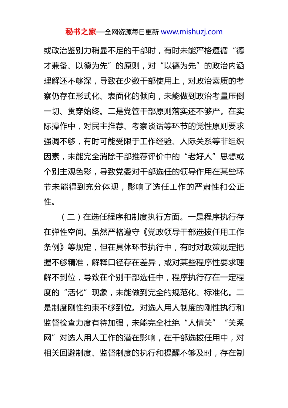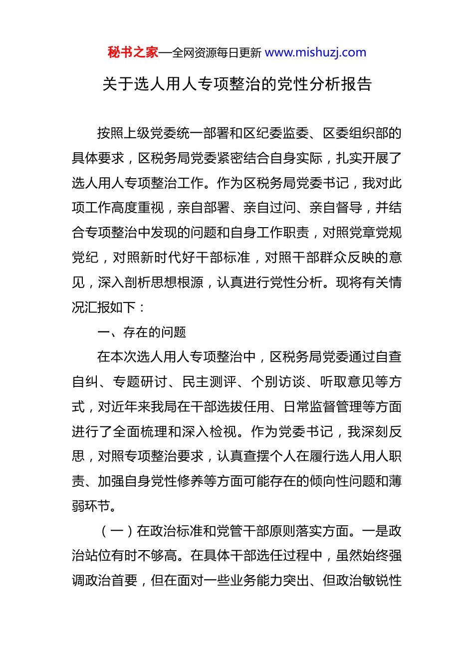 秘书之家—全网资源每日更新 www.mishuzj.com关于选人用人专项整治的党性分析报告 按照上级党委统一部署和区纪委监委、区委组织部的具体要求,区税务局党委紧密结合自身实际,扎实开展了选人用人专项整治工作。作为区税务局党委书记,我对此项工作高度重视,亲自部署、亲自过问、亲自督导,并结合专项整治中发现的问题和自身工作职责,对照党章党规党纪,对照新时代好干部标准,对照干部群众反映的意见,深入剖析思想根源,认真进行党性分析。现将有关情况汇报如下:一、存在的问题在本次选人用人专项整治中,区税务局党委通过自查自纠、专题研讨、民主测评、个别访谈、听取意见等方式,对近年来我局在干部选拔任用、日常监督管理等方面进行了全面梳理和深入检视。作为党委书记,我深刻反思,对照专项整治要求,认真查摆个人在履行选人用人职责、加强自身党性修养等方面可能存在的倾向性问题和薄弱环节。(一)在政治标准和党管干部原则落实方面。一是政治站位有时不够高。在具体干部选任过程中,虽然始终强调政治首要,但在面对一些业务能力突出、但政治敏锐性秘书之家—全网资源每日更新 www.mishuzj.com或政治鉴别力稍显不足的干部时,有时未能严格遵循“德才兼备、以德为先”的原则,对“以德为先”的政治内涵理解还不够深,导致在少数干部使用上,对政治素质的考察仍存在形式化、表面化的倾向,未能做到政治考量压倒一切、贯穿始终。二是党管干部原则落实还不够严。在实际操作中,对民主推荐、考察谈话等环节的党性原则要求强调不够,有时可能受限于工作经验、人际关系等非组织因素,未能完全消除干部推荐评价中的“老好人”思想或个别主观色彩,导致党委对干部选任的领导作用在某些环节未能得到充分体现,影响了选任工作的严肃性和公正性。(二)在选任程序和制度执行方面。一是程序执行存在弹性空间。虽然严格遵守《党政领导干部选拔任用工作条例》等规定,但在具体环节执行中,有时对政策规定把握不够精准,解释口径存在差异,或对某些程序性要求理解不到位,导致在个别干部选任中,程序执行存在一定程度的“活化”现象,未能做到完全的规范化、标准化。二是制度刚性约束不够到位。对选人用人制度的刚性执行和监督检查力度有待加强,未能完全杜绝“人情关”“关系网”对选人用人工作的潜在影响,在干部选拔任用中,对相关回避制度、监督制度的执行和提醒不够及时,存在制秘书之家—全网资源每日更新 www.mishuzj.com度执行中的薄弱点。三是监督问责不够严厉。对选人用人工作中出现的苗头性、倾向性问题,有时警示教育不够及时,对违规违纪行为的查处和问责力度还需进一步加大,未能形成足够的震慑力,一定程度上影响了制度的严肃性。(三)在担当作为和廉洁自律方面。一是担当精神有待提升。在选人用人过程中,有时面对复杂的干部人事问题,存在求稳怕乱、畏难退缩的思想,未能旗帜鲜明地坚持原则,勇于打破常规,大胆启用优秀干部。在对干部考察识别上,有时过于依赖材料,缺乏深入细致地了解,未能真正把那些想干事、能干事、干成事的干部及时选出来、用起来。二是主动接受监督意识不强。作为党委书记,虽然口头上强调接受监督,但在实际工作中,对如何有效搭建监督平台、如何自觉接受各方面监督的思考还不够深入,未能充分发挥纪检监察、组织人力资源和社会保障部门以及干部群众的监督作用,使得权力运行的制约机制还不够完善。三是廉洁自律要求有所放松。在干部选拔任用中,虽然个人能做到洁身自好,但在对身边工作人员和亲属的教育管理上,有时警示提醒不够到位,未能完全杜绝他们打着我的旗号或利用我的影响谋取私利的可能性,存在潜在的廉政风险。秘书之家—全网资源每日更新 www.mishuzj.com二、原因剖析以上问题的存在,根源在于我个人在党性修养、思想认识和实践落实方面存在深层次的不足。(一)政治理论学习不够深入,理想信念有所淡化。一是理论学习存在“碎片化”现象。虽然坚持理论学习,但有时满足于一般性学习,未能深研细读习近平新时代中国特色社会主义思想的精髓要义,特别是对总书记关于党的建设、干部工作的重要论述,未能做到入脑入心、融会贯...