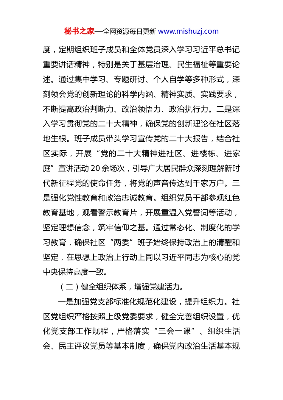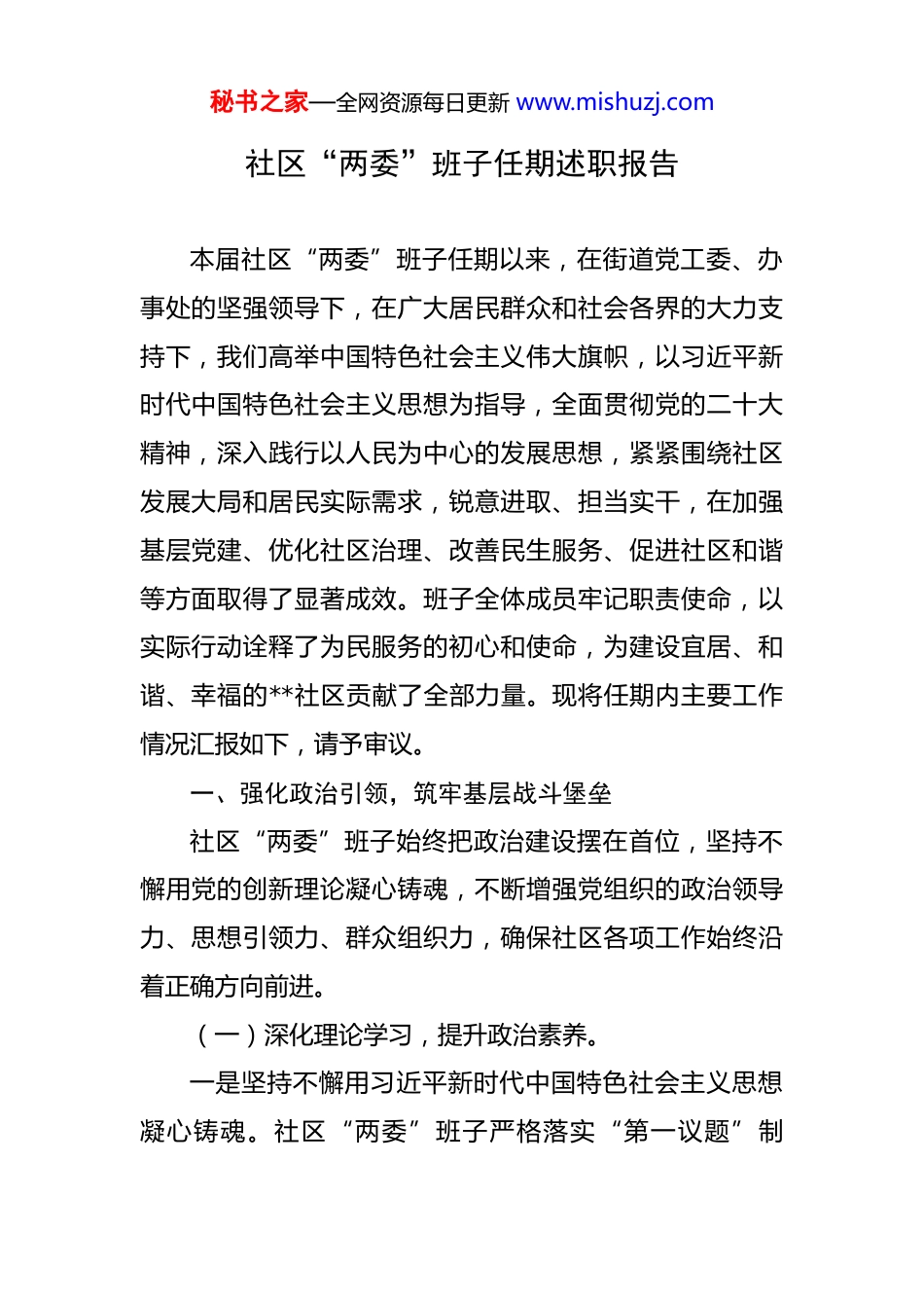 秘书之家—全网资源每日更新 www.mishuzj.com社区“两委”班子任期述职报告 本届社区“两委”班子任期以来,在街道党工委、办事处的坚强领导下,在广大居民群众和社会各界的大力支持下,我们高举中国特色社会主义伟大旗帜,以习近平新时代中国特色社会主义思想为指导,全面贯彻党的二十大精神,深入践行以人民为中心的发展思想,紧紧围绕社区发展大局和居民实际需求,锐意进取、担当实干,在加强基层党建、优化社区治理、改善民生服务、促进社区和谐等方面取得了显著成效。班子全体成员牢记职责使命,以实际行动诠释了为民服务的初心和使命,为建设宜居、和谐、幸福的**社区贡献了全部力量。现将任期内主要工作情况汇报如下,请予审议。一、强化政治引领,筑牢基层战斗堡垒社区“两委”班子始终把政治建设摆在首位,坚持不懈用党的创新理论凝心铸魂,不断增强党组织的政治领导力、思想引领力、群众组织力,确保社区各项工作始终沿着正确方向前进。(一)深化理论学习,提升政治素养。一是坚持不懈用习近平新时代中国特色社会主义思想凝心铸魂。社区“两委”班子严格落实“第一议题”制秘书之家—全网资源每日更新 www.mishuzj.com度,定期组织班子成员和全体党员深入学习习近平总书记重要讲话精神,特别是关于基层治理、民生福祉等重要论述。通过集中学习、专题研讨、个人自学等多种形式,深刻领会党的创新理论的科学内涵、精神实质、实践要求,不断提高政治判断力、政治领悟力、政治执行力。二是深入学习贯彻党的二十大精神,确保党的创新理论在社区落地生根。班子成员带头学习宣传党的二十大报告,结合社区实际,开展“党的二十大精神进社区、进楼栋、进家庭”宣讲活动 20 余场次,引导广大居民群众深刻理解新时代新征程党的使命任务,将党的声音传达到千家万户。三是强化党性教育和政治忠诚教育。组织党员干部参观红色教育基地,观看警示教育片,开展重温入党誓词等活动,坚定理想信念,筑牢信仰之基。通过常态化、制度化的学习教育,确保社区“两委”班子始终保持政治上的清醒和坚定,在思想上政治上行动上同以习近平同志为核心的党中央保持高度一致。(二)健全组织体系,增强党建活力。一是加强党支部标准化规范化建设,提升组织力。社区党组织严格按照上级党委要求,健全完善组织设置,优化党支部工作规程,严格落实“三会一课”、组织生活会、民主评议党员等基本制度,确保党内政治生活基本规秘书之家—全网资源每日更新 www.mishuzj.com范。例如,任期内,我们对支部阵地进行了升级改造,设立了党员活动室、党群服务中心,为党员开展活动提供了良好场所。二是抓实党员队伍建设,发挥先锋模范作用。注重党员的教育管理和作用发挥,定期开展党员教育培训,增强党员的荣誉感和归属感。积极引导社区党员亮身份、作表率,在社区志愿服务、矛盾调解、环境整治等各项工作中冲锋在前,发挥“一个党员一面旗帜”的示范引领作用。任期内,社区党组织共发展了 X 名新党员,为党组织注入了新鲜血液。三是创新党建工作载体,推动党建与社区治理深度融合。探索“党建+物业”“党建+网格”“党建+志愿服务”等模式,将党组织的触角延伸到社区治理的方方面面。例如,成立了“红色业委会”,由党员骨干担任业委会成员,有效提升了物业管理水平;组建了“党员先锋队”“楼栋党小组”,实现党员服务群众零距离,让居民感受到党组织就在身边、温暖就在身边。(三)严明纪律规矩,净化政治生态。一是严格落实全面从严治党主体责任。社区党组织书记作为第一责任人,切实履行管党治党责任,班子其他成员认真履行“一岗双责”,将党风廉政建设与社区各项工作同部署、同落实、同检查、同考核。定期召开党风廉政建设专题会议,分析研判廉政风险,部署防控措施。二是秘书之家—全网资源每日更新 www.mishuzj.com持之以恒正风肃纪反腐。坚决纠治形式主义、官僚主义等不正之风,力戒空谈、务求实效。严格执行中央八项规定及其实施细则精神,杜绝违规吃喝、收送礼品礼金等行为。对苗头性、倾向性问题及时进行提醒谈话,抓早抓小、防微杜渐。三是强化日常监督和警示教育。社区纪检委员发挥监督作...