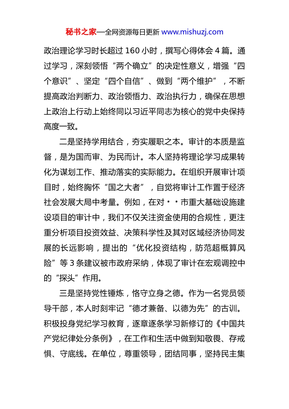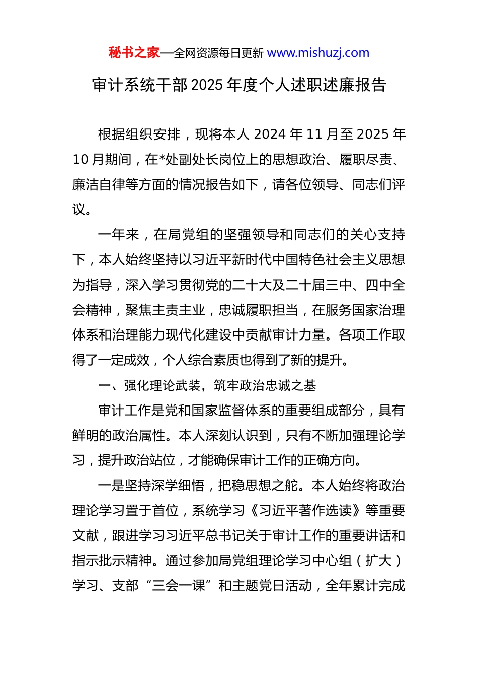 秘书之家—全网资源每日更新 www.mishuzj.com审计系统干部 2025 年度个人述职述廉报告 根据组织安排,现将本人 2024 年 11 月至 2025 年10 月期间,在*处副处长岗位上的思想政治、履职尽责、廉洁自律等方面的情况报告如下,请各位领导、同志们评议。一年来,在局党组的坚强领导和同志们的关心支持下,本人始终坚持以习近平新时代中国特色社会主义思想为指导,深入学习贯彻党的二十大及二十届三中、四中全会精神,聚焦主责主业,忠诚履职担当,在服务国家治理体系和治理能力现代化建设中贡献审计力量。各项工作取得了一定成效,个人综合素质也得到了新的提升。一、强化理论武装,筑牢政治忠诚之基审计工作是党和国家监督体系的重要组成部分,具有鲜明的政治属性。本人深刻认识到,只有不断加强理论学习,提升政治站位,才能确保审计工作的正确方向。一是坚持深学细悟,把稳思想之舵。本人始终将政治理论学习置于首位,系统学习《习近平著作选读》等重要文献,跟进学习习近平总书记关于审计工作的重要讲话和指示批示精神。通过参加局党组理论学习中心组(扩大)学习、支部“三会一课”和主题党日活动,全年累计完成秘书之家—全网资源每日更新 www.mishuzj.com政治理论学习时长超过 160 小时,撰写心得体会 4 篇。通过学习,深刻领悟“两个确立”的决定性意义,增强“四个意识”、坚定“四个自信”、做到“两个维护”,不断提高政治判断力、政治领悟力、政治执行力,确保在思想上政治上行动上始终同以习近平同志为核心的党中央保持高度一致。二是坚持学用结合,夯实履职之本。审计的本质是监督,是为国而审、为民而计。本人坚持将理论学习成果转化为谋划工作、推动落实的实际能力。在组织开展审计项目时,始终胸怀“国之大者”,自觉将审计工作置于经济社会发展大局中考量。例如,在对﹡﹡市重大基础设施建设项目的审计中,我们不仅关注资金使用的合规性,更注重分析项目投资效益、决策科学性及其对区域经济协同发展的长远影响,提出的“优化投资结构,防范超概算风险”等 3 条建议被市政府采纳,体现了审计在宏观调控中的“探头”作用。三是坚持党性锤炼,恪守立身之德。作为一名党员领导干部,本人时刻牢记“德才兼备、以德为先”的古训。积极投身党纪学习教育,逐章逐条学习新修订的《中国共产党纪律处分条例》,在工作和生活中做到知敬畏、存戒惧、守底线。在单位,尊重领导,团结同事,坚持民主集秘书之家—全网资源每日更新 www.mishuzj.com中制原则,凡涉及分管领域的重要事项,均主动向处长和分管局领导汇报,并在处内会议上充分听取意见,营造了和谐共事、团结奋斗的良好氛围。二、聚焦主责主业,提升审计监督之能根据审计署 2025 年审计工作部署,本人紧密围绕“七个围绕”的工作重点,即围绕保障宏观政策落实、提高政府投资效益、发展新质生产力、防范重点领域风险、推进经济体制改革、推动降碳减污扩绿增长、保障和改善民生,在分管领域和具体项目中狠抓落实,力求审计监督取得实效。一是服务宏观大局,护航高质量发展。本人带领或参与完成了 8 个审计项目。其中,在对﹡﹡地区促进新质生产力发展的若干财政政策落实情况的专项审计调查中,我们聚焦“权力集中、资金密集、资源富集”的关键环节,重点关注了科研经费管理、产业引导基金运作、人才引进补贴发放等情况。审计发现,个别单位存在科研经费拨付不及时、部分产业基金“投早、投小、投科技”比例偏低等问题。审计报告提交后,有力推动了﹡﹡区政府出台《关于进一步优化科研项目经费管理的实施细则》,促进了超过 1.5 亿元的产业基金加快投资进度,为新质生产力发展清障护航。秘书之家—全网资源每日更新 www.mishuzj.com二是坚持科技强审,创新审计方式方法。面对日益复杂和隐蔽的经济活动,传统审计手段已难以满足“全覆盖、穿透式”的监督要求。本人积极拥抱变革,大力推动大数据和人工智能技术在审计实践中的应用。在今年牵头的﹡﹡市民生补助资金审计项目中,面对涉及近 50 万人的数千万条繁杂数据,我们摒弃了传统的抽样核对方法。我带领团队的年轻同志,运用 Python 语言和 ...