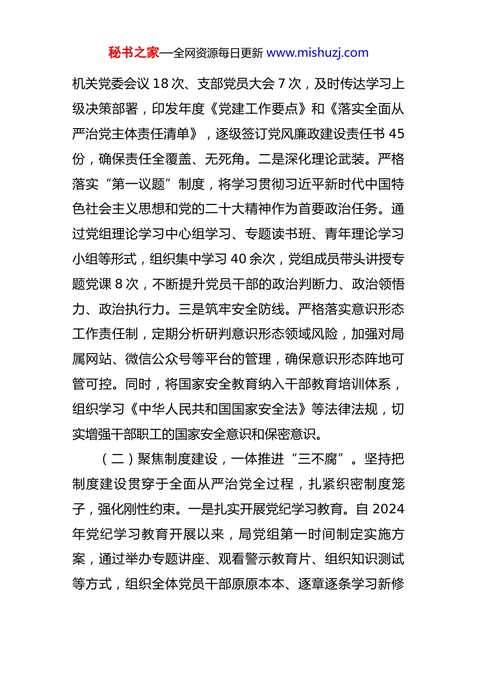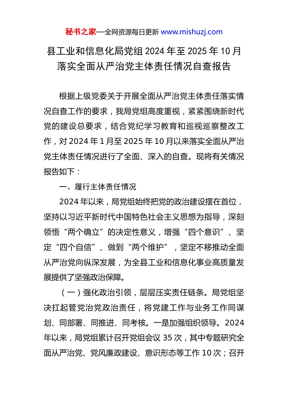 秘书之家—全网资源每日更新 www.mishuzj.com县工业和信息化局党组 2024 年至 2025 年 10 月落实全面从严治党主体责任情况自查报告 根据上级党委关于开展全面从严治党主体责任落实情况自查工作的要求,我局党组高度重视,紧紧围绕新时代党的建设总要求,结合党纪学习教育和巡视巡察整改工作,对 2024 年 1 月至 2025 年 10 月以来落实全面从严治党主体责任情况进行了全面、深入的自查。现将有关情况报告如下:一、履行主体责任情况2024 年以来,局党组始终把党的政治建设摆在首位,坚持以习近平新时代中国特色社会主义思想为指导,深刻领悟“两个确立”的决定性意义,增强“四个意识”、坚定“四个自信”、做到“两个维护”,坚定不移推动全面从严治党向纵深发展,为全县工业和信息化事业高质量发展提供了坚强政治保障。(一)强化政治引领,层层压实责任链条。局党组坚决扛起管党治党政治责任,将党建工作与业务工作同谋划、同部署、同推进、同考核。一是加强组织领导。2024年以来,局党组累计召开党组会议 35 次,其中专题研究全面从严治党、党风廉政建设、意识形态等工作 10 次;召开秘书之家—全网资源每日更新 www.mishuzj.com机关党委会议 18 次、支部党员大会 7 次,及时传达学习上级决策部署,印发年度《党建工作要点》和《落实全面从严治党主体责任清单》,逐级签订党风廉政建设责任书 45份,确保责任全覆盖、无死角。二是深化理论武装。严格落实“第一议题”制度,将学习贯彻习近平新时代中国特色社会主义思想和党的二十大精神作为首要政治任务。通过党组理论学习中心组学习、专题读书班、青年理论学习小组等形式,组织集中学习 40 余次,党组成员带头讲授专题党课 8 次,不断提升党员干部的政治判断力、政治领悟力、政治执行力。三是筑牢安全防线。严格落实意识形态工作责任制,定期分析研判意识形态领域风险,加强对局属网站、微信公众号等平台的管理,确保意识形态阵地可管可控。同时,将国家安全教育纳入干部教育培训体系,组织学习《中华人民共和国国家安全法》等法律法规,切实增强干部职工的国家安全意识和保密意识。(二)聚焦制度建设,一体推进“三不腐”。坚持把制度建设贯穿于全面从严治党全过程,扎紧织密制度笼子,强化刚性约束。一是扎实开展党纪学习教育。自 2024年党纪学习教育开展以来,局党组第一时间制定实施方案,通过举办专题讲座、观看警示教育片、组织知识测试等方式,组织全体党员干部原原本本、逐章逐条学习新修秘书之家—全网资源每日更新 www.mishuzj.com订的《中国共产党纪律处分条例》,教育引导党员干部学纪、知纪、明纪、守纪。二是深入贯彻中央八项规定精神。持之以恒纠“四风”树新风,紧盯重要节点和关键岗位,开展作风建设专项检查 8 次,坚决整治违规吃喝、违规收送礼品礼金等顽瘴痼疾。严格执行公务用车、办公用房、公务接待等规定,持续整治形式主义为基层减负,发文、会议数量较往年同期持续压减。三是严肃党内政治生活。严格执行“三会一课”、民主生活会和组织生活会、领导干部双重组织生活、民主评议党员等制度,用好批评和自我批评武器,增强党内政治生活的政治性、时代性、原则性、战斗性。(三)坚持严管厚爱,锻造过硬干部队伍。把严的要求贯穿于干部队伍建设全过程,同时注重人文关怀,激励干部担当作为。一是抓实巡视巡察整改。全力配合 2024 年市委对局党组的巡察工作,针对反馈的 25 个问题,制定详细整改方案,建立台账、销号管理。截至 2025 年 10 月,已 完 成 整 改 24 个 , 基 本 完 成 1 个 , 整 改 完 成 率 达 到96%,并通过整改建立和完善了 12 项长效机制。二是严格干部选拔任用。坚持党管干部原则和新时代好干部标准,严格执行干部选拔任用工作条例,树立重实干、重实绩、重担当的用人导向,确保选人用人风清气正。三是强化人秘书之家—全网资源每日更新 www.mishuzj.com才引育工作。围绕我县产业链发展需求,积极落实人才政策,2024 年以来协助企业引进高层次技术人才 5 名,并加强对本土企业经营管理人才的培训,为工业经济...