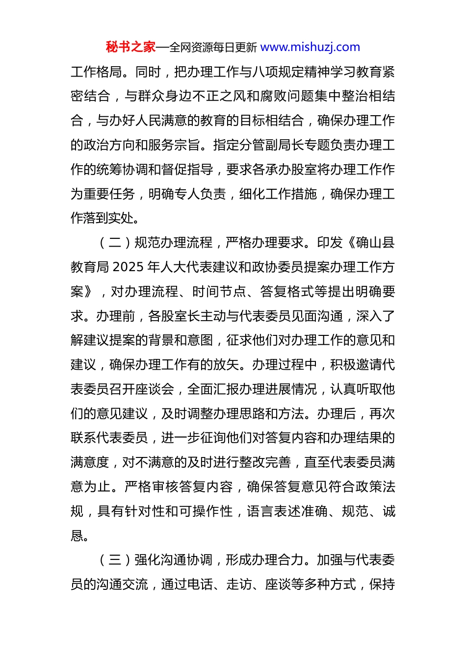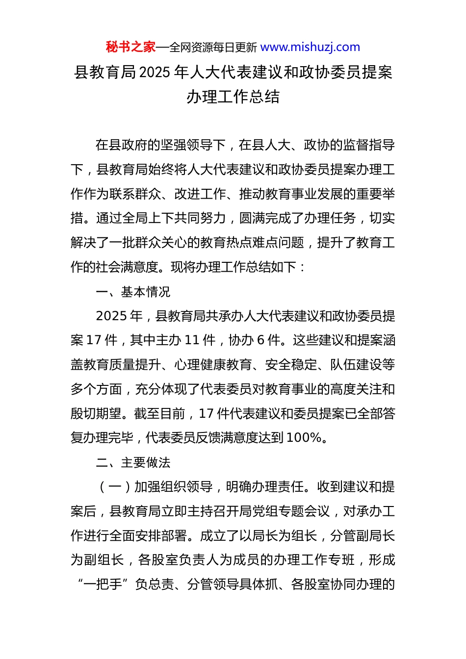 秘书之家—全网资源每日更新 www.mishuzj.com县教育局 2025 年人大代表建议和政协委员提案办理工作总结 在县政府的坚强领导下,在县人大、政协的监督指导下,县教育局始终将人大代表建议和政协委员提案办理工作作为联系群众、改进工作、推动教育事业发展的重要举措。通过全局上下共同努力,圆满完成了办理任务,切实解决了一批群众关心的教育热点难点问题,提升了教育工作的社会满意度。现将办理工作总结如下:一、基本情况2025 年,县教育局共承办人大代表建议和政协委员提案 17 件,其中主办 11 件,协办 6 件。这些建议和提案涵盖教育质量提升、心理健康教育、安全稳定、队伍建设等多个方面,充分体现了代表委员对教育事业的高度关注和殷切期望。截至目前,17 件代表建议和委员提案已全部答复办理完毕,代表委员反馈满意度达到 100%。二、主要做法(一)加强组织领导,明确办理责任。收到建议和提案后,县教育局立即主持召开局党组专题会议,对承办工作进行全面安排部署。成立了以局长为组长,分管副局长为副组长,各股室负责人为成员的办理工作专班,形成“一把手”负总责、分管领导具体抓、各股室协同办理的秘书之家—全网资源每日更新 www.mishuzj.com工作格局。同时,把办理工作与八项规定精神学习教育紧密结合,与群众身边不正之风和腐败问题集中整治相结合,与办好人民满意的教育的目标相结合,确保办理工作的政治方向和服务宗旨。指定分管副局长专题负责办理工作的统筹协调和督促指导,要求各承办股室将办理工作作为重要任务,明确专人负责,细化工作措施,确保办理工作落到实处。(二)规范办理流程,严格办理要求。印发《确山县教育局 2025 年人大代表建议和政协委员提案办理工作方案》,对办理流程、时间节点、答复格式等提出明确要求。办理前,各股室长主动与代表委员见面沟通,深入了解建议提案的背景和意图,征求他们对办理工作的意见和建议,确保办理工作有的放矢。办理过程中,积极邀请代表委员召开座谈会,全面汇报办理进展情况,认真听取他们的意见建议,及时调整办理思路和方法。办理后,再次联系代表委员,进一步征询他们对答复内容和办理结果的满意度,对不满意的及时进行整改完善,直至代表委员满意为止。严格审核答复内容,确保答复意见符合政策法规,具有针对性和可操作性,语言表述准确、规范、诚恳。(三)强化沟通协调,形成办理合力。加强与代表委员的沟通交流,通过电话、走访、座谈等多种方式,保持秘书之家—全网资源每日更新 www.mishuzj.com与代表委员的密切联系,及时了解他们的想法和需求,让代表委员参与到办理工作中来,增强办理工作的透明度和互动性。对于协办件,主动与主办单位沟通协调,及时提供协办意见和相关材料,积极配合主办单位共同做好办理工作。在办理涉及多个股室的建议提案时,建立股室间沟通协调机制,加强信息共享和工作协同,形成办理工作合力,共同推进问题的解决。(四)注重调查研究,力求办理实效。把调查研究作为办理工作的重要环节,要求承办股室深入基层学校、师生和家长中开展实地调研,全面了解问题的实际情况,广泛听取各方意见建议,为制定切实可行的办理方案提供依据。对于代表委员提出的热点难点问题,组织相关人员进行专题研究,分析问题产生的原因,寻找解决问题的办法和途径。在办理过程中,注重将建议提案办理与推动教育工作实际相结合,以办理工作为契机,改进工作方法,完善工作机制,推动教育事业发展,切实提高办理工作的实效性。三、办理工作成效(一)聚焦教育质量提升,推动教育内涵式发展。针对代表委员提出的关于提高教育质量的建议提案,县教育局采取了一系列有力措施。加强教学常规管理,制定出台教学常规管理办法,定期开展教学常规检查和视导,规范秘书之家—全网资源每日更新 www.mishuzj.com学校教学行为,提高课堂教学质量。深化课程改革,积极推进素质教育,加强课程体系建设,开发丰富多彩的校本课程,满足学生多样化发展需求。加强教育科研工作,鼓励教师开展教学研究和课题实验,推广优秀教学成果,以科研促教学,提升教师教学水平和专业素养。通过这些措施的实...