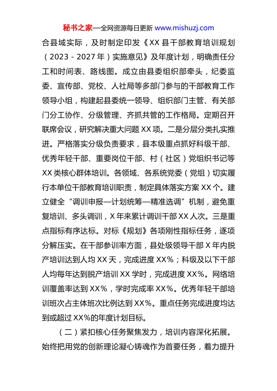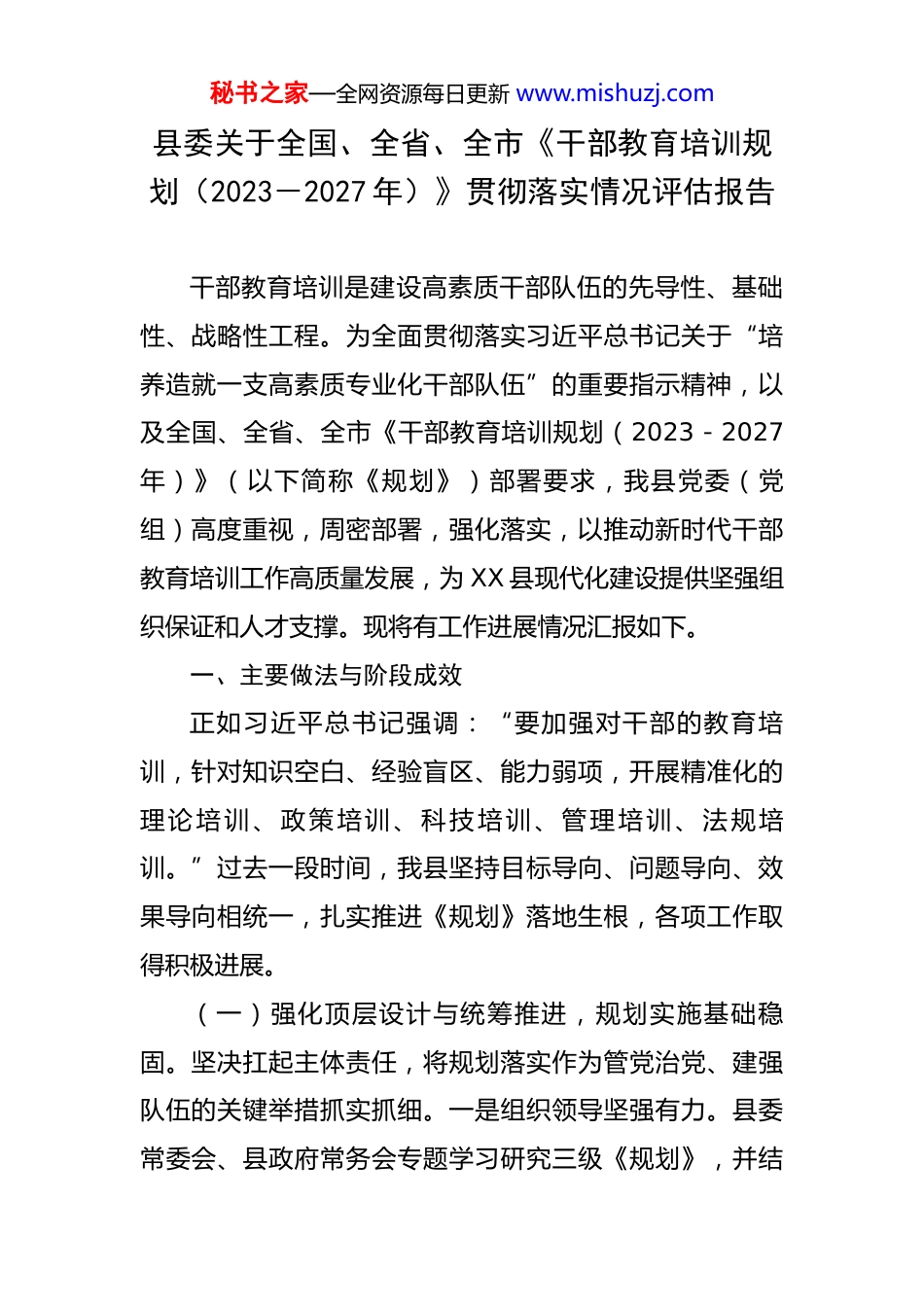 秘书之家—全网资源每日更新 www.mishuzj.com县委关于全国、全省、全市《干部教育培训规划(2023-2027 年)》贯彻落实情况评估报告 干部教育培训是建设高素质干部队伍的先导性、基础性、战略性工程。为全面贯彻落实习近平总书记关于“培养造就一支高素质专业化干部队伍”的重要指示精神,以及全国、全省、全市《干部教育培训规划(2023-2027年)》(以下简称《规划》)部署要求,我县党委(党组)高度重视,周密部署,强化落实,以推动新时代干部教育培训工作高质量发展,为 XX 县现代化建设提供坚强组织保证和人才支撑。现将有工作进展情况汇报如下。一、主要做法与阶段成效正如习近平总书记强调:“要加强对干部的教育培训,针对知识空白、经验盲区、能力弱项,开展精准化的理论培训、政策培训、科技培训、管理培训、法规培训。”过去一段时间,我县坚持目标导向、问题导向、效果导向相统一,扎实推进《规划》落地生根,各项工作取得积极进展。(一)强化顶层设计与统筹推进,规划实施基础稳固。坚决扛起主体责任,将规划落实作为管党治党、建强队伍的关键举措抓实抓细。一是组织领导坚强有力。县委常委会、县政府常务会专题学习研究三级《规划》,并结秘书之家—全网资源每日更新 www.mishuzj.com合县域实际,及时制定印发《 XX 县干部教育培训规划(2023-2027 年)实施意见》及年度计划,明确责任分工和时间表、路线图。成立由县委组织部牵头,纪委监委、宣传部、党校、人社局等多部门参与的干部教育工作领导小组,构建起县委统一领导、组织部门主管、有关部门分工协作、分级管理、齐抓共管的工作格局。定期召开联席会议,研究解决重大问题 XX 项。二是分层分类扎实推进。严格落实分级负责要求,县本级重点抓好科级干部、优秀年轻干部、重要岗位干部、村(社区)党组织书记等XX 类核心群体培训。各领域、各系统党委(党组)切实履行本单位干部教育培训职责,制定具体落实方案 XX 个。建立健全“调训申报—计划统筹—精准选调”机制,避免重复培训、多头调训,X 年来累计调训干部 XX 人次。三是重点指标有序达标。对标《规划》各项刚性指标任务,逐项分解压实。在干部参训率方面,县处级领导干部 X 年内脱产培训达到人均 XX 天,完成进度 XX%;科级及以下干部人均每年达到脱产培训 XX 学时,完成进度 XX%。网络培训覆盖率达到 XX%,学时完成率 XX%。优秀年轻干部培训班次占主体班次比例达到 XX%。重点任务完成进度均达到或超过 XX%的年度计划目标。(二)紧扣核心任务聚焦发力,培训内容深化拓展。始终把用党的创新理论凝心铸魂作为首要任务,着力提升秘书之家—全网资源每日更新 www.mishuzj.com干部的政治能力和专业本领。一是深化新思想教育培训体系化。坚持把习近平新时代中国特色社会主义思想作为干部教育培训的主课、首课、必修课,持续完善“总论+分领域”的课程体系。围绕党的 XX 大精神及系列重要会议精神,举办集中轮训班 XX 期,覆盖全县科级以上干部 XX 人次。依托县委党校主阵地,开设“新思想专题研修班”XX班次。组织“送教下乡”XX 场次,覆盖基层干部和党员XX 人次。举办专题理论读书班 XX 期,组织理论中心组学习研讨 XX 次,推动理论学习深化内化转化。二是突出政治训练精准化。紧扣提升政治判断力、政治领悟力、政治执行力,将党章党规党纪、党史、新中国史、改革开放史、社会主义发展史、中华民族发展史作为基础内容,融入各类培训班次。开发“严守政治纪律和政治规矩”、“提升政治能力”等系列课程 XX 门。组织干部赴党性教育基地开展沉浸式教学 XX 批次,累计 XX 人次参训。开展警示教育XX 场次,覆盖 XX 人次。三是强化履职能力培训实战化。立足县域发展所需和干部能力短板,围绕高质量发展、乡村振兴、基层治理、风险防控、营商环境、招商引资、现代产业体系、数字经济、绿色低碳发展等关键领域,精准设计培训项目 XX 个。实施“干部专业化能力提升计划”,举办城建、金融、产业、科技、统计等专题班次 XX 期,培训专业干部 XX 人次。推广案例教学、结构化研讨、情景模秘书之家...