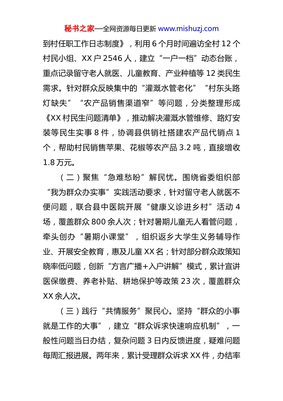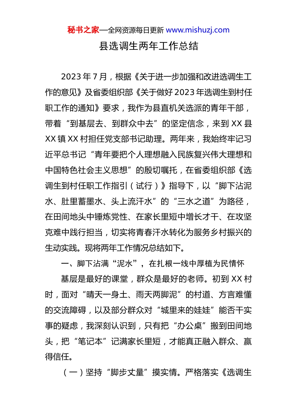 秘书之家—全网资源每日更新 www.mishuzj.com县选调生两年工作总结 2023 年 7 月,根据《关于进一步加强和改进选调生工作的意见》及省委组织部《关于做好 2023 年选调生到村任职工作的通知》要求,我作为县直机关选派的青年干部,带着“到基层去、到群众中去”的坚定信念,来到 XX 县XX 镇 XX 村担任党支部书记助理。两年来,我始终牢记习近平总书记“青年要把个人理想融入民族复兴伟大理想和中国特色社会主义思想”的殷切嘱托,在省委组织部《选调生到村任职工作指引(试行)》指导下,以“脚下沾泥水、肚里蓄墨水、头上流汗水”的“三水之道”为路径,在田间地头中锤炼党性、在家长里短中增长才干、在攻坚克难中践行担当,切实将青春汗水转化为服务乡村振兴的生动实践。现将两年工作情况总结如下。一、脚下沾满“泥水”,在扎根一线中厚植为民情怀基层是最好的课堂,群众是最好的老师。初到 XX 村时,面对“晴天一身土、雨天两脚泥”的村道、方言难懂的交流障碍,以及部分群众对“城里来的娃娃”能否干实事的疑虑,我深刻认识到,只有把“办公桌”搬到田间地头,把“笔记本”记满家长里短,才能真正融入群众、赢得信任。(一)坚持“脚步丈量”摸实情。严格落实《选调生秘书之家—全网资源每日更新 www.mishuzj.com到村任职工作日志制度》,利用 6 个月时间遍访全村 12 个村民小组、XX 户 2546 人,建立“一户一档”动态台账,重点记录留守老人就医、儿童教育、产业种植等 12 类民生需求。针对群众反映集中的“灌溉水管老化”“村东头路灯缺失”“农产品销售渠道窄”等问题,分类整理形成《XX 村民生问题清单》,推动解决灌溉水管维修、路灯安装等民生实事 8 件,协调县供销社搭建农产品代销点 1个,帮助村民销售苹果、花椒等农产品 3.2 吨,直接增收1.8 万元。(二)聚焦“急难愁盼”解民忧。围绕省委组织部“我为群众办实事”实践活动要求,针对留守老人就医不便问题,联合县中医院开展“健康义诊进乡村”活动 4场,覆盖群众 800 余人次;针对暑期儿童无人看管问题,牵头创办“暑期小课堂”,组织返乡大学生义务辅导作业、开展安全教育,惠及儿童 XX 名;针对部分群众政策知晓率低问题,创新“方言广播+入户讲解”模式,累计宣讲医保缴费、养老补贴、耕地保护等政策 23 次,覆盖群众XX 余人次。(三)践行“共情服务”聚民心。坚持“群众的小事就是工作的大事”,建立“群众诉求快速响应机制”,一般性问题当日办结,复杂问题 3 日内反馈进度,疑难问题每周汇报进展。两年来,累计受理群众诉求 XX 件,办结率秘书之家—全网资源每日更新 www.mishuzj.com100%,群众满意度从 78%提升至 95%。2024 年村“两委”换届选举中,我高票当选为村党支部委员。二、肚里装满“墨水”,在勤学善思中锤炼过硬本领基层工作千头万绪,“上面千条线,下面一根针”,既需要“宽肩膀”,更需要“真本事”。面对政策落实、产业发展、矛盾调解等复杂任务,我坚持“在干中学、在学中干”,努力成长为服务基层发展的多面手。(一)以学促干强根基。系统学习《乡村振兴促进法》《中国共产党农村工作条例》等法律法规,研读中央一号文件及省、市关于乡村振兴的实施意见,参加县委组织部“选调生能力提升班”“乡村振兴专题讲座”等培训12 次,及时撰写学习笔记和心得体会。针对产业发展难题,主动向农业农村局专家、村“老把式”请教,系统学习苹果种植技术、电商运营模式等知识,逐步从“政策盲”成长为“行家里手”。(二)以研促行破难题。围绕“如何推动村集体经济提质增效”这一核心问题,牵头开展“XX 村产业发展调研”,通过入户访谈、座谈交流、实地考察等方式,梳理出“产业单一、品牌薄弱、链条短浅”三大短板。结合村情实际,提出“党支部+合作社+农户”发展模式,推动成立 XX 村苹果种植专业合作社,引进优质品种,建设 XX 亩矮砧密植示范园,2024 年村集体增收 12 万元,带动 16秘书之家—全网资源每日更新 www.mishuzj.com户脱贫户年均增收 7000 元。(三)以践 促新提能力。在实践中锤炼“ 七种能力”,重点提升群众工作...