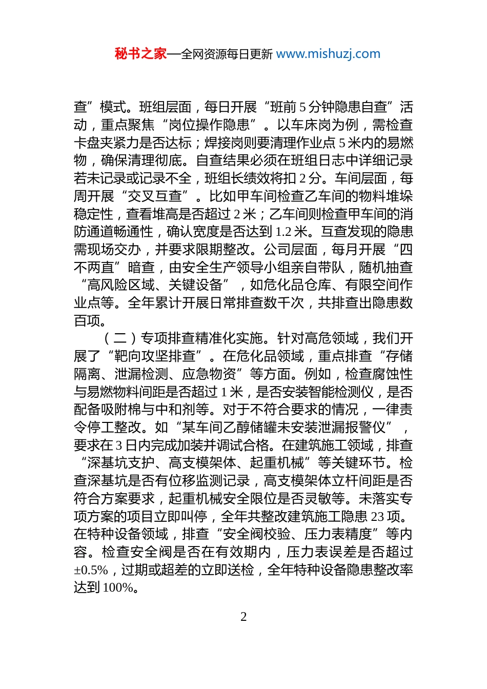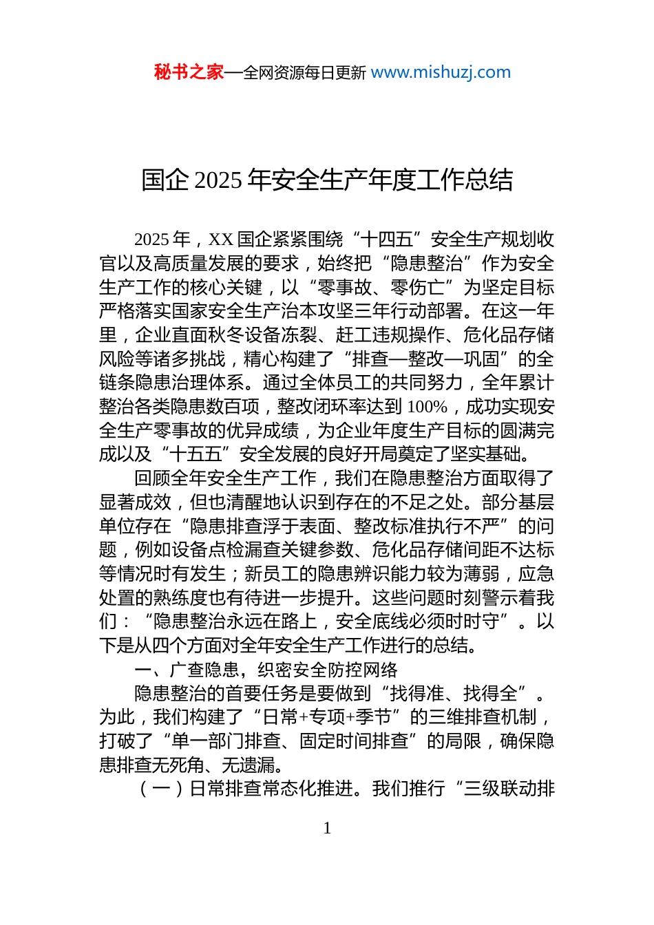 秘书之家—全网资源每日更新 www.mishuzj.com国企 2025 年安全生产年度工作总结2025 年,XX 国企紧紧围绕“十四五”安全生产规划收官以及高质量发展的要求,始终把“隐患整治”作为安全生产工作的核心关键,以“零事故、零伤亡”为坚定目标严格落实国家安全生产治本攻坚三年行动部署。在这一年里,企业直面秋冬设备冻裂、赶工违规操作、危化品存储风险等诸多挑战,精心构建了“排查—整改—巩固”的全链条隐患治理体系。通过全体员工的共同努力,全年累计整治各类隐患数百项,整改闭环率达到 100%,成功实现安全生产零事故的优异成绩,为企业年度生产目标的圆满完成以及“十五五”安全发展的良好开局奠定了坚实基础。回顾全年安全生产工作,我们在隐患整治方面取得了显著成效,但也清醒地认识到存在的不足之处。部分基层单位存在“隐患排查浮于表面、整改标准执行不严”的问题,例如设备点检漏查关键参数、危化品存储间距不达标等情况时有发生;新员工的隐患辨识能力较为薄弱,应急处置的熟练度也有待进一步提升。这些问题时刻警示着我们:“隐患整治永远在路上,安全底线必须时时守”。以下是从四个方面对全年安全生产工作进行的总结。一、广查隐患,织密安全防控网络隐患整治的首要任务是要做到“找得准、找得全”。为此,我们构建了“日常+专项+季节”的三维排查机制,打破了“单一部门排查、固定时间排查”的局限,确保隐患排查无死角、无遗漏。(一)日常排查常态化推进。我们推行“三级联动排1秘书之家—全网资源每日更新 www.mishuzj.com查”模式。班组层面,每日开展“班前 5 分钟隐患自查”活动,重点聚焦“岗位操作隐患”。以车床岗为例,需检查卡盘夹紧力是否达标;焊接岗则要清理作业点 5 米内的易燃物,确保清理彻底。自查结果必须在班组日志中详细记录若未记录或记录不全,班组长绩效将扣 2 分。车间层面,每周开展“交叉互查”。比如甲车间检查乙车间的物料堆垛稳定性,查看堆高是否超过 2 米;乙车间则检查甲车间的消防通道畅通性,确认宽度是否达到 1.2 米。互查发现的隐患需现场交办,并要求限期整改。公司层面,每月开展“四不两直”暗查,由安全生产领导小组亲自带队,随机抽查“高风险区域、关键设备”,如危化品仓库、有限空间作业点等。全年累计开展日常排查数千次,共排查出隐患数百项。(二)专项排查精准化实施。针对高危领域,我们开展了“靶向攻坚排查”。在危化品领域,重点排查“存储隔离、泄漏检测、应急物资”等方面。例如,检查腐蚀性与易燃物料间距是否超过 1 米,是否安装智能检测仪,是否配备吸附棉与中和剂等。对于不符合要求的情况,一律责令停工整改。如“某车间乙醇储罐未安装泄漏报警仪”,要求在 3 日内完成加装并调试合格。在建筑施工领域,排查“深基坑支护、高支模架体、起重机械”等关键环节。检查深基坑是否有位移监测记录,高支模架体立杆间距是否符合方案要求,起重机械安全限位是否灵敏等。未落实专项方案的项目立即叫停,全年共整改建筑施工隐患 23 项。在特种设备领域,排查“安全阀校验、压力表精度”等内容。检查安全阀是否在有效期内,压力表误差是否超过±0.5%,过期或超差的立即送检,全年特种设备隐患整改率达到 100%。2秘书之家—全网资源每日更新 www.mishuzj.com(三)季节排查动态化调整。结合不同季节的风险特点,我们及时调整排查重点。春季,聚焦“防雷防静电”排查户外设备、储罐区防雷装置是否完好,检测接地电阻是否达标(不大于 10 欧姆),对于不合格的要求在 24 小时内完成整改。夏季,聚焦“防暑降温与防汛”,检查车间通风设备是否正常运行,应急防汛物资(沙袋、水泵)是否充足。在高温时段(11:00-15:00),严禁户外作业。秋冬季节,聚焦“设备防冻与火灾防控”,排查户外管道是否加装保温层(厚度不低于 50mm),液压系统是否更换低温油液,同时清理“三合一”场所的违规住人情况。全年季节排查共整改隐患 80 余项,有效防范了低温冻裂、火灾等季节性事故的发生。二、严抓整改,闭环管理消除隐患隐患整治的核心在于“改得实、改得透”。我们实行“分级分类、跟踪督...