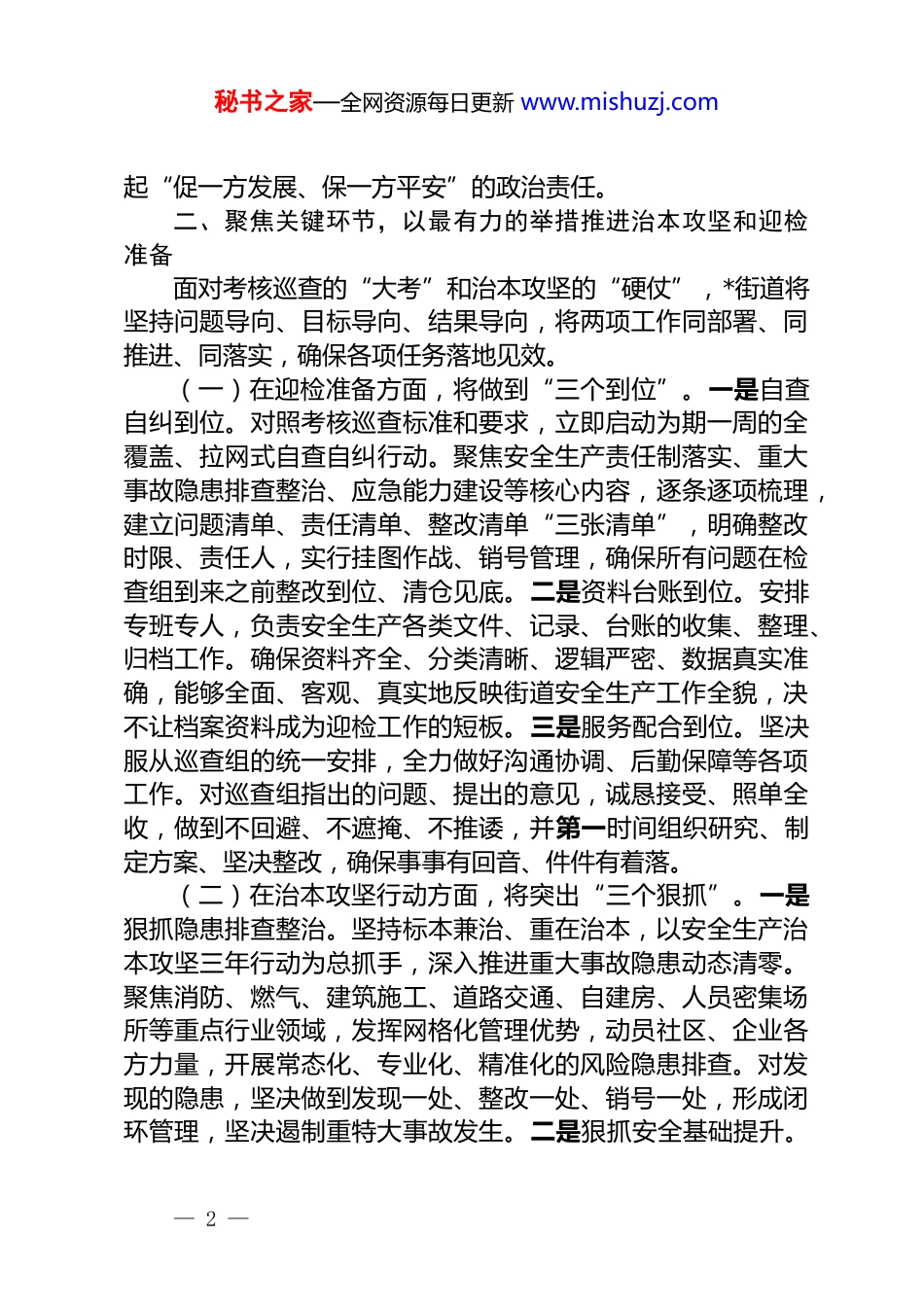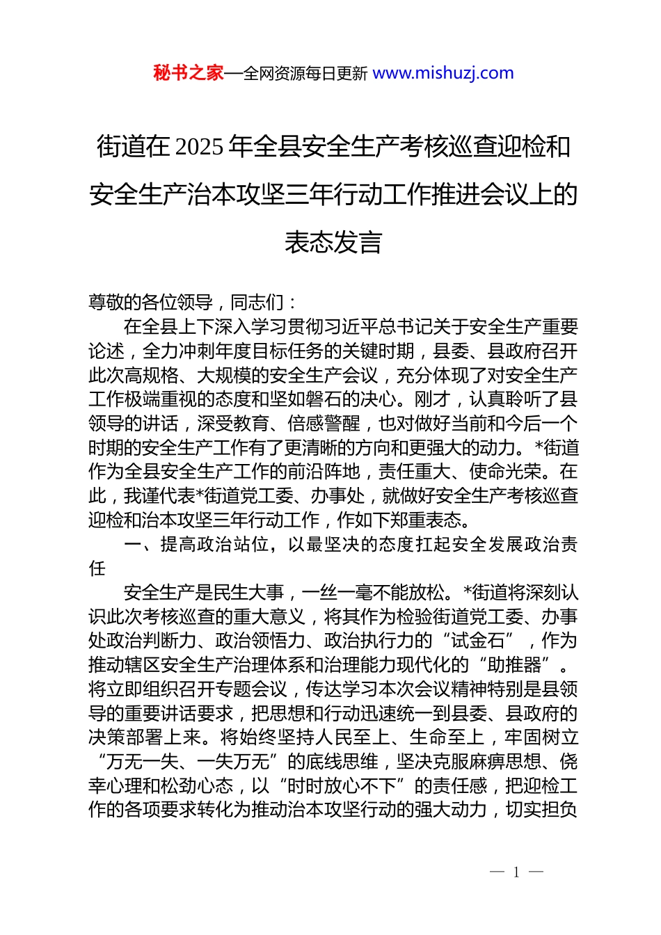 秘书之家—全网资源每日更新 www.mishuzj.com街道在 2025 年全县安全生产考核巡查迎检和安全生产治本攻坚三年行动工作推进会议上的表态发言尊敬的各位领导,同志们:在全县上下深入学习贯彻习近平总书记关于安全生产重要论述,全力冲刺年度目标任务的关键时期,县委、县政府召开此次高规格、大规模的安全生产会议,充分体现了对安全生产工作极端重视的态度和坚如磐石的决心。刚才,认真聆听了县领导的讲话,深受教育、倍感警醒,也对做好当前和今后一个时期的安全生产工作有了更清晰的方向和更强大的动力。*街道作为全县安全生产工作的前沿阵地,责任重大、使命光荣。在此,我谨代表*街道党工委、办事处,就做好安全生产考核巡查迎检和治本攻坚三年行动工作,作如下郑重表态。一、提高政治站位,以最坚决的态度扛起安全发展政治责任安全生产是民生大事,一丝一毫不能放松。*街道将深刻认识此次考核巡查的重大意义,将其作为检验街道党工委、办事处政治判断力、政治领悟力、政治执行力的“试金石”,作为推动辖区安全生产治理体系和治理能力现代化的“助推器”。将立即组织召开专题会议,传达学习本次会议精神特别是县领导的重要讲话要求,把思想和行动迅速统一到县委、县政府的决策部署上来。将始终坚持人民至上、生命至上,牢固树立“万无一失、一失万无”的底线思维,坚决克服麻痹思想、侥幸心理和松劲心态,以“时时放心不下”的责任感,把迎检工作的各项要求转化为推动治本攻坚行动的强大动力,切实担负— 1 —秘书之家—全网资源每日更新 www.mishuzj.com起“促一方发展、保一方平安”的政治责任。二、聚焦关键环节,以最有力的举措推进治本攻坚和迎检准备面对考核巡查的“大考”和治本攻坚的“硬仗”,*街道将坚持问题导向、目标导向、结果导向,将两项工作同部署、同推进、同落实,确保各项任务落地见效。(一)在迎检准备方面,将做到“三个到位”。一是自查自纠到位。对照考核巡查标准和要求,立即启动为期一周的全覆盖、拉网式自查自纠行动。聚焦安全生产责任制落实、重大事故隐患排查整治、应急能力建设等核心内容,逐条逐项梳理,建立问题清单、责任清单、整改清单“三张清单”,明确整改时限、责任人,实行挂图作战、销号管理,确保所有问题在检查组到来之前整改到位、清仓见底。二是资料台账到位。安排专班专人,负责安全生产各类文件、记录、台账的收集、整理、归档工作。确保资料齐全、分类清晰、逻辑严密、数据真实准确,能够全面、客观、真实地反映街道安全生产工作全貌,决不让档案资料成为迎检工作的短板。三是服务配合到位。坚决服从巡查组的统一安排,全力做好沟通协调、后勤保障等各项工作。对巡查组指出的问题、提出的意见,诚恳接受、照单全收,做到不回避、不遮掩、不推诿,并第一时间组织研究、制定方案、坚决整改,确保事事有回音、件件有着落。(二)在治本攻坚行动方面,将突出“三个狠抓”。一是狠抓隐患排查整治。坚持标本兼治、重在治本,以安全生产治本攻坚三年行动为总抓手,深入推进重大事故隐患动态清零。聚焦消防、燃气、建筑施工、道路交通、自建房、人员密集场所等重点行业领域,发挥网格化管理优势,动员社区、企业各方力量,开展常态化、专业化、精准化的风险隐患排查。对发现的隐患,坚决做到发现一处、整改一处、销号一处,形成闭环管理,坚决遏制重特大事故发生。二是狠抓安全基础提升。— 2 —秘书之家—全网资源每日更新 www.mishuzj.com加大安全投入,推动老旧小区消防设施改造、燃气安全装置更新等民生工程。加强对企业负责人、安全管理人员和一线从业者的安全教育培训,提升全民安全意识和应急避险能力。完善应急预案,定期组织开展实战化应急演练,检验预案、锻炼队伍、磨合机制,提升街道整体应急处置水平。三是狠抓长效机制建设。深刻剖析隐患背后深层次矛盾和原因,举一反三,将行之有效的做法固化为制度规范。进一步健全“党政同责、‘一岗双责’、齐抓共管、失职追责”的安全生产责任体系,压实企业主体责任,推动企业由被动接受监管向主动加强管理转变,从根本上提升街道本质安全水平。(三)在监督考核方面,...