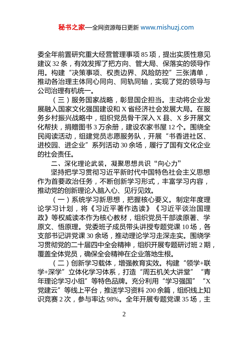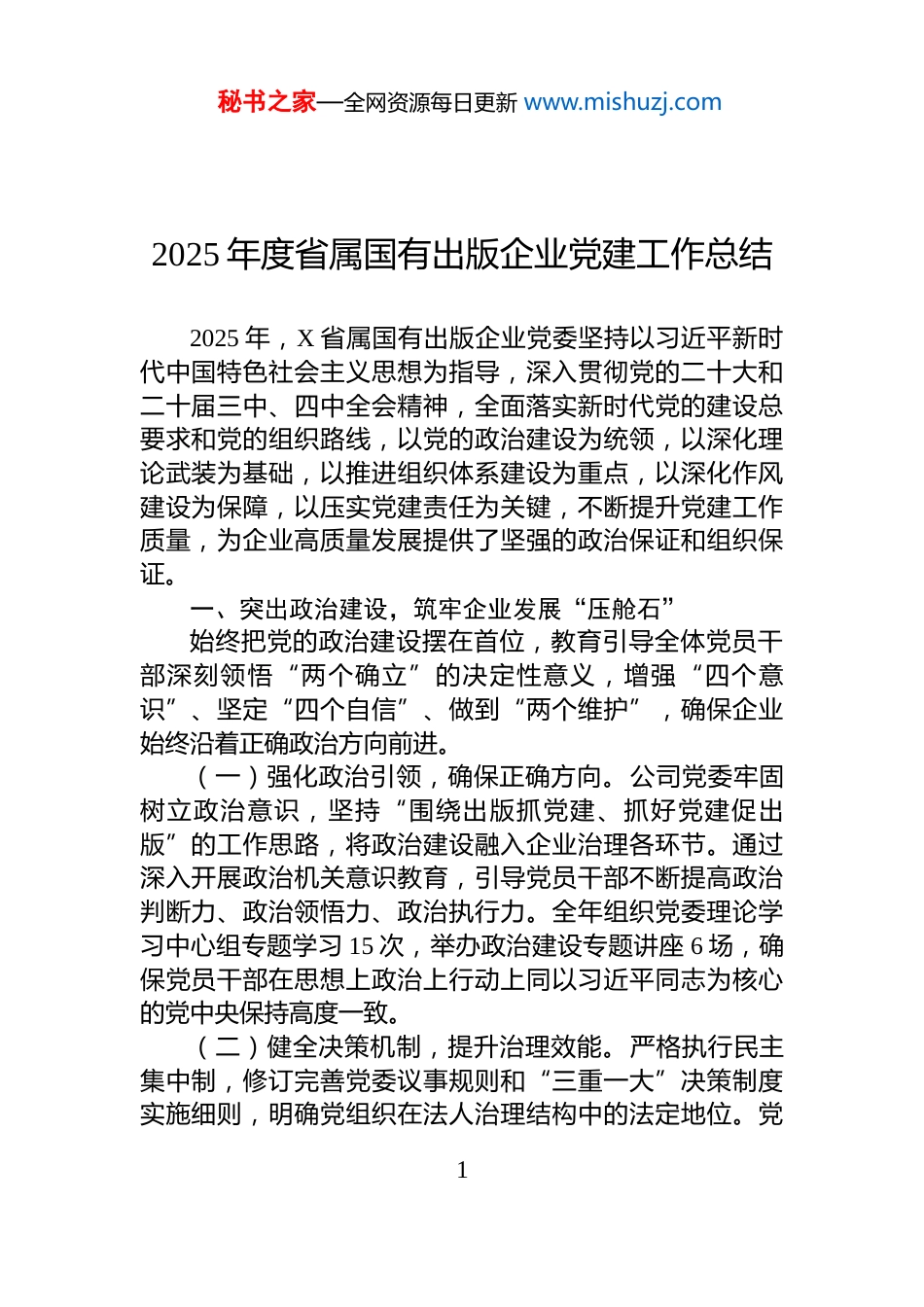 秘书之家—全网资源每日更新 www.mishuzj.com2025 年度省属国有出版企业党建工作总结2025 年,X 省属国有出版企业党委坚持以习近平新时代中国特色社会主义思想为指导,深入贯彻党的二十大和二十届三中、四中全会精神,全面落实新时代党的建设总要求和党的组织路线,以党的政治建设为统领,以深化理论武装为基础,以推进组织体系建设为重点,以深化作风建设为保障,以压实党建责任为关键,不断提升党建工作质量,为企业高质量发展提供了坚强的政治保证和组织保证。一、突出政治建设,筑牢企业发展“压舱石”始终把党的政治建设摆在首位,教育引导全体党员干部深刻领悟“两个确立”的决定性意义,增强“四个意识”、坚定“四个自信”、做到“两个维护”,确保企业始终沿着正确政治方向前进。(一)强化政治引领,确保正确方向。公司党委牢固树立政治意识,坚持“围绕出版抓党建、抓好党建促出版”的工作思路,将政治建设融入企业治理各环节。通过深入开展政治机关意识教育,引导党员干部不断提高政治判断力、政治领悟力、政治执行力。全年组织党委理论学习中心组专题学习 15 次,举办政治建设专题讲座 6 场,确保党员干部在思想上政治上行动上同以习近平同志为核心的党中央保持高度一致。(二)健全决策机制,提升治理效能。严格执行民主集中制,修订完善党委议事规则和“三重一大”决策制度实施细则,明确党组织在法人治理结构中的法定地位。党1秘书之家—全网资源每日更新 www.mishuzj.com委全年前置研究重大经营管理事项 85 项,提出实质性意见建议 32 条,有效发挥了把方向、管大局、保落实的领导作用。构建“决策事项、权责边界、风险防控”三张清单,推动各治理主体同心同向、同轨同轴,实现了党的领导与公司治理有机统一。(三)服务国家战略,彰显国企担当。主动将企业发展融入国家文化强国建设和 X 省经济社会发展大局。在服务乡村振兴战略中,组织党员骨干深入 X 县、X 乡开展文化帮扶,捐赠图书 3 万余册,建设农家书屋 12 个。围绕全民阅读活动,组建党员志愿服务队,开展“书香进社区、进校园、进企业”系列活动 30 余场,履行了国有文化企业的社会责任。二、深化理论武装,凝聚思想共识“向心力”坚持把学习贯彻习近平新时代中国特色社会主义思想作为首要政治任务,不断创新学习形式,丰富学习内容,推动党的创新理论入脑入心、见行见效。(一)系统学习新思想,把握核心要义。制定年度理论学习计划,将《习近平著作选读》《习近平谈治国理政》等权威读本作为核心教材,组织党员干部读原著、学原文、悟原理。党委班子成员带头讲授专题党课 10 场,各支部书记讲党课 30 余场,推动理论学习走深走实。围绕学习贯彻党的二十届四中全会精神,组织开展专题研讨班 2 期,覆盖全体党员,确保全会精神在企业落地生根。(二)创新学习载体,增强教育实效。构建“领学+联学+深学”立体化学习体系,打造“周五机关大讲堂”“青年理论学习小组”等特色品牌。充分利用“学习强国”“X党建云”等线上平台,推送学习资料 200 余篇,组织线上知识竞赛 2 次,参与率达 98%。全年开展专题党课 35 场,主2秘书之家—全网资源每日更新 www.mishuzj.com题党日活动 50 余次,各类党员轮训累计覆盖 1500 余人次,形成了比学赶超的浓厚氛围。(三)推动学用结合,促进成果转化。大力弘扬理论联系实际的学风,党委班子成员建立基层联系点 8 个,围绕“出版数字化转型”“精品内容生产”等课题开展“学用结合”主题调研,形成高质量调研报告 12 篇,解决实际问题 25 项。鼓励党员干部在主流媒体刊发理论文章和典型经验 30 余篇,制作微视频 15 部,有效将学习成果转化为推动企业发展的具体思路和实际举措。三、推进组织体系建设,锻造坚强战斗“堡垒群”牢固树立大抓基层的鲜明导向,以提升组织力为重点,持续夯实基层基础,推动基层党组织全面进步、全面过硬。(一)优化组织设置,实现有效覆盖。根据业务发展和机构调整情况,动态优化党组织设置,按编辑、发行、行政等业务板块重新划分党员,新成立数字出版党支部,实现党组织在业务单元...
