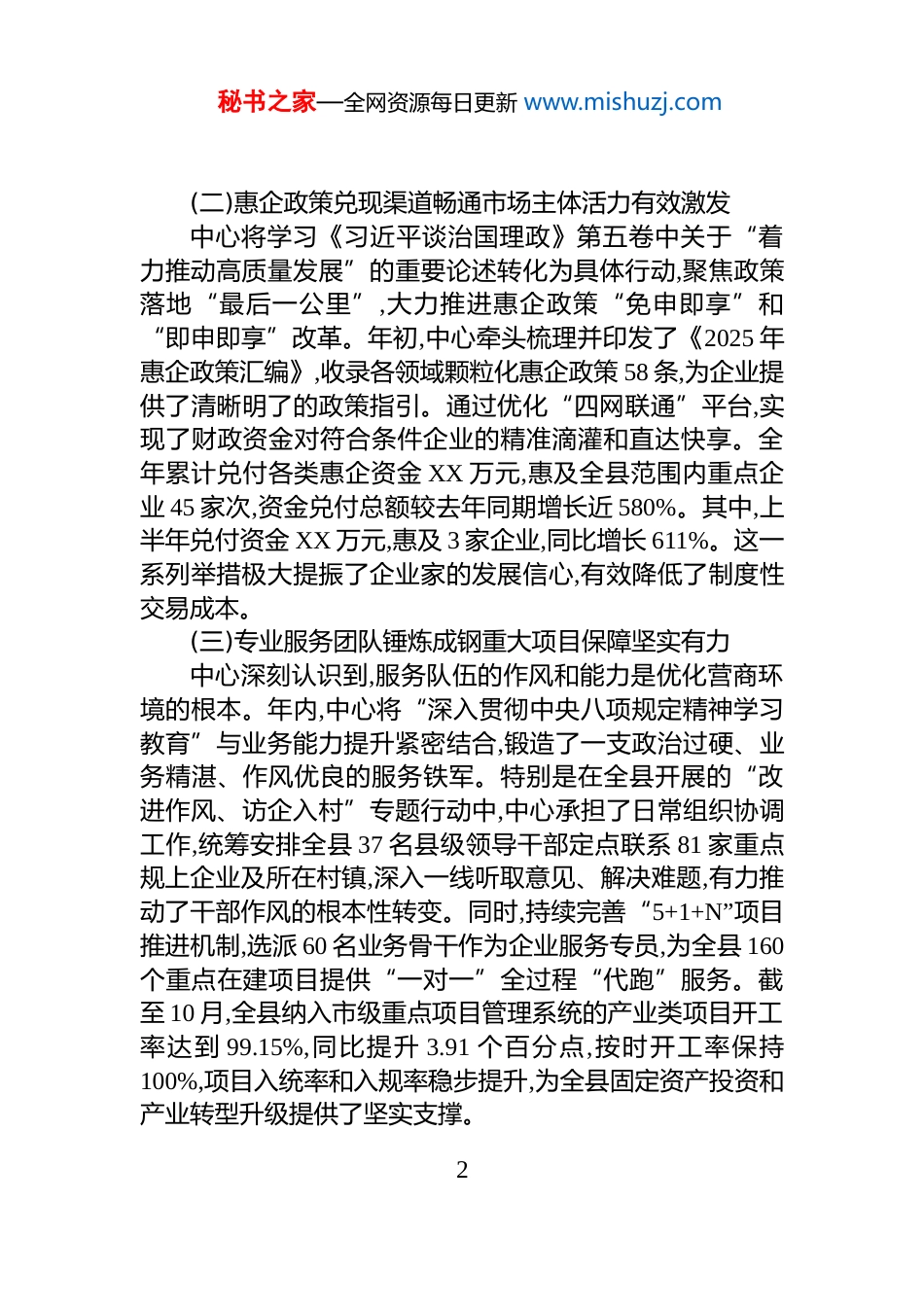 秘书之家—全网资源每日更新 www.mishuzj.comXX 县企业服务中心 2025 年度工作总结2025 年是全面贯彻落实党的二十大精神的关键之年,是实施“十四五”规划的攻坚之年。一年来,在县委、县政府的坚强领导下,XX 县企业服务中心坚持以习近平新时代中国特色社会主义思想为指导,深入学习《习近平谈治国理政》第五卷的精髓要义,全面贯彻党的二十届四中全会精神,扎实开展深入贯彻中央八项规定精神学习教育,紧紧围绕全县经济社会发展大局,以“宿事速办”营商环境品牌建设为总抓手,聚焦企业急难愁盼,持续深化改革创新,全力构建亲清政商关系,各项工作取得显著成效,为全县经济高质量发展注入了强劲动力。一、年度核心指标完成情况与主要成效2025 年,中心坚持目标导向和问题导向相结合,各项核心工作指标均超额完成年度预期,服务能级与企业满意度实现双提升。(一)诉求响应机制持续优化服务闭环效能显著提升中心坚定不移地推深做实企业诉求“挂号制”,将其作为检验服务成效的“试金石”。通过整合线上平台与线下走访渠道,构建了“企呼政应、接诉即办”的全天候、全覆盖响应体系。截至目前,全年共受理并办结企业各类诉求 158项,远超年初预计的 120 项。其中,线上平台接收并办结诉求108 项,线下通过“访企入村”等活动收集并解决的诉求 50项。所有诉求均实现“一诉一码”追踪管理,办结率达 98%,企业回访满意率稳定在 95%以上,真正实现了从“回应一个诉求”到“解决一类问题,提升一个领域”的转变。1秘书之家—全网资源每日更新 www.mishuzj.com(二)惠企政策兑现渠道畅通市场主体活力有效激发中心将学习《习近平谈治国理政》第五卷中关于“着力推动高质量发展”的重要论述转化为具体行动,聚焦政策落地“最后一公里”,大力推进惠企政策“免申即享”和“即申即享”改革。年初,中心牵头梳理并印发了《2025 年惠企政策汇编》,收录各领域颗粒化惠企政策 58 条,为企业提供了清晰明了的政策指引。通过优化“四网联通”平台,实现了财政资金对符合条件企业的精准滴灌和直达快享。全年累计兑付各类惠企资金 XX 万元,惠及全县范围内重点企业 45 家次,资金兑付总额较去年同期增长近 580%。其中,上半年兑付资金 XX 万元,惠及 3 家企业,同比增长 611%。这一系列举措极大提振了企业家的发展信心,有效降低了制度性交易成本。(三)专业服务团队锤炼成钢重大项目保障坚实有力中心深刻认识到,服务队伍的作风和能力是优化营商环境的根本。年内,中心将“深入贯彻中央八项规定精神学习教育”与业务能力提升紧密结合,锻造了一支政治过硬、业务精湛、作风优良的服务铁军。特别是在全县开展的“改进作风、访企入村”专题行动中,中心承担了日常组织协调工作,统筹安排全县 37 名县级领导干部定点联系 81 家重点规上企业及所在村镇,深入一线听取意见、解决难题,有力推动了干部作风的根本性转变。同时,持续完善“5+1+N”项目推进机制,选派 60 名业务骨干作为企业服务专员,为全县 160个重点在建项目提供“一对一”全过程“代跑”服务。截至 10 月,全县纳入市级重点项目管理系统的产业类项目开工率达到 99.15%,同比提升 3.91 个百分点,按时开工率保持100%,项目入统率和入规率稳步提升,为全县固定资产投资和产业转型升级提供了坚实支撑。2秘书之家—全网资源每日更新 www.mishuzj.com二、年度重点工作任务落实情况中心对照《政府工作报告》确定的 4 项重点任务,逐一分解、压实责任、全力推进,所有任务均高质量完成。(一)精准滴灌惠企政策直达快享机制全面落实为确保各项惠企政策应享尽享,中心一方面持续更新《惠企政策汇编》,并利用“蒲公英特训营”等平台开展政策宣讲活动,变“企业找政策”为“政策找企业”。另一方面,依托大数据技术对企业进行精准画像,主动筛选符合“免申即享”条件的企业名单,并协调财政、税务等部门简化兑付流程。全年的资金兑付实践表明,“免申即享”模式已成为我县激发企业活力的重要引擎,尤其在支持科技创新和专精特新企业发展方面成效卓著。(二)全程帮办企业服务专员制度持续深化中心起草并推动实施了《XX 县企业服务专员服务三化改革方案》,以标准化、专业化、规...