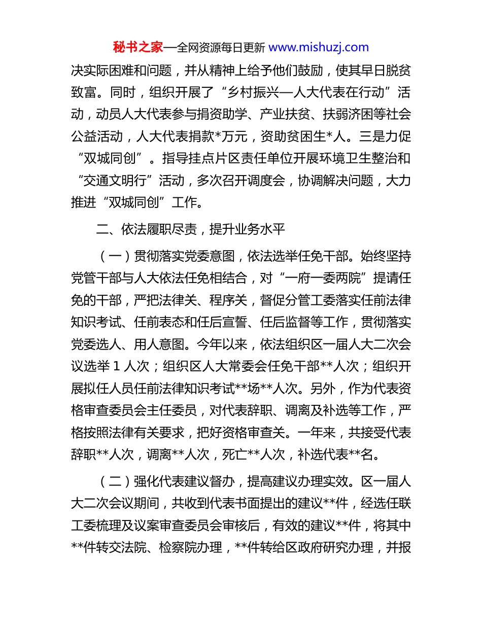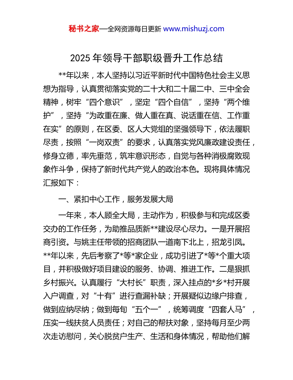 秘书之家—全网资源每日更新 www.mishuzj.com2025 年领导干部职级晋升工作总结**年以来,本人坚持以习近平新时代中国特色社会主义思想为指导,认真贯彻落实党的二十大和二十届二中、三中全会精神,树牢“四个意识”,坚定“四个自信”,坚持“两个维护”,坚持“为政重在廉、做人重在真、说话重在信、工作重在实”的原则,在区委、区人大党组的坚强领导下,依法履职尽责,按照“一岗双责”的要求,认真落实党风廉政建设责任,修身立德,率先垂范,筑牢意识形态,自觉与各种消极腐败现象作斗争,保持了新时代共产党人的政治本色。现将具体情况汇报如下:一、紧扣中心工作,服务发展大局一年来,本人顾全大局,主动作为,积极参与和完成区委交办的工作任务,为助推品质新**建设尽心尽力。一是开展招商引资。与姚主任带领的招商团队一道南下北上,招龙引凤。**年以来,先后考察了*等*家企业,成功引进了*等*个重大项目,并积极做好项目建设的服务、协调、推进工作。二是狠抓乡村振兴。认真履行“大村长”职责,深入挂点的*乡*村开展入户调查,对“十有”进行查漏补缺;开展疑似边缘户排查,做到应纳尽纳;做到每旬“五个一”,统筹调度“四套人马”,压实一线扶贫人员责任;对自己的帮扶对象,坚持每月至少两次走访慰问,关心脱贫户生产、生活和身体情况,帮助他们解秘书之家—全网资源每日更新 www.mishuzj.com决实际困难和问题,并从精神上给予他们鼓励,使其早日脱贫致富。同时,组织开展了“乡村振兴—人大代表在行动”活动,动员人大代表参与捐资助学、产业扶贫、扶弱济困等社会公益活动,人大代表捐款*万元,资助贫困生*人。三是力促“双城同创”。指导挂点片区责任单位开展环境卫生整治和“交通文明行”活动,多次召开调度会,协调解决问题,大力推进“双城同创”工作。二、依法履职尽责,提升业务水平(一)贯彻落实党委意图,依法选举任免干部。始终坚持党管干部与人大依法任免相结合,对“一府一委两院”提请任免的干部,严把法律关、程序关,督促分管工委落实任前法律知识考试、任前表态和任后宣誓、任后监督等工作,贯彻落实党委选人、用人意图。今年以来,依法组织区一届人大二次会议选举 1 人次;组织区人大常委会任免干部**人次;组织开展拟任人员任前法律知识考试**场**人次。另外,作为代表资格审查委员会主任委员,对代表辞职、调离及补选等工作,严格按照法律有关要求,把好资格审查关。一年来,共接受代表辞职**人次,调离**人次,死亡**人次,补选代表**名。(二)强化代表建议督办,提高建议办理实效。区一届人大二次会议期间,共收到代表书面提出的建议**件,经选任联工委梳理及议案审查委员会审核后,有效的建议**件,将其中**件转交法院、检察院办理,**件转给区政府研究办理,并报秘书之家—全网资源每日更新 www.mishuzj.com请主任会议研究确定了**件重点建议,由常委会领导领衔督办。建议交办后,及时组织研究了《关于加强代表建议、批评和意见督办工作的办法》,多次组织对口督办工委、相关责任单位和部分代表到建议较为集中的交通、城管、交警大队等部门开展现场督察、召开座谈会,促使建议办理落到实处。(四)创新述职测评方式,强化干部任后监督。**月,对**个区政府组成部门负责人及区监委、区法院、区检察院副职领导共 30 位工作人员开展述职测评,安排**个测评小组,分别到被测评对象单位、乡镇及服务对象了解情况,并形成初评报告,为常委会组成人员测评提供参考,提高了监督实效。通过述职测评,进一步提高了干部的履职意识以及自觉接受人大和群众监督的意识。三、坚持从严治党,落实廉政责任(一)听党指挥,贯彻民主集中。严格遵守人大党组议事规则,坚持个人服从组织、少数服从多数、下级服从上级的工作原则,贯彻民主集中,凡是重大问题、重要事项,按照“三重一大”有关规定,事前向党组书记汇报,与其他班子成员沟通,提交党组讨论,决定后才付诸实施,保证决策科学化、合理化。严格执行《中国共产党党内监督条例》和《关于领导干部报告个人重大事项的规定》,如实向组织汇报个人重大事项相关情况。秘书之家—全网资源每日更新 ...