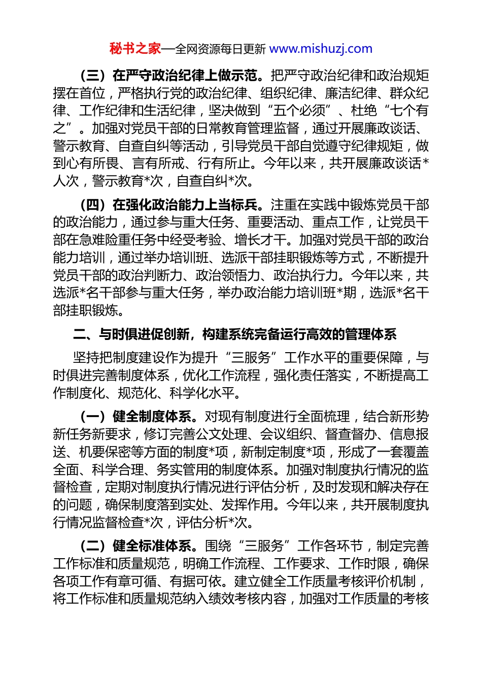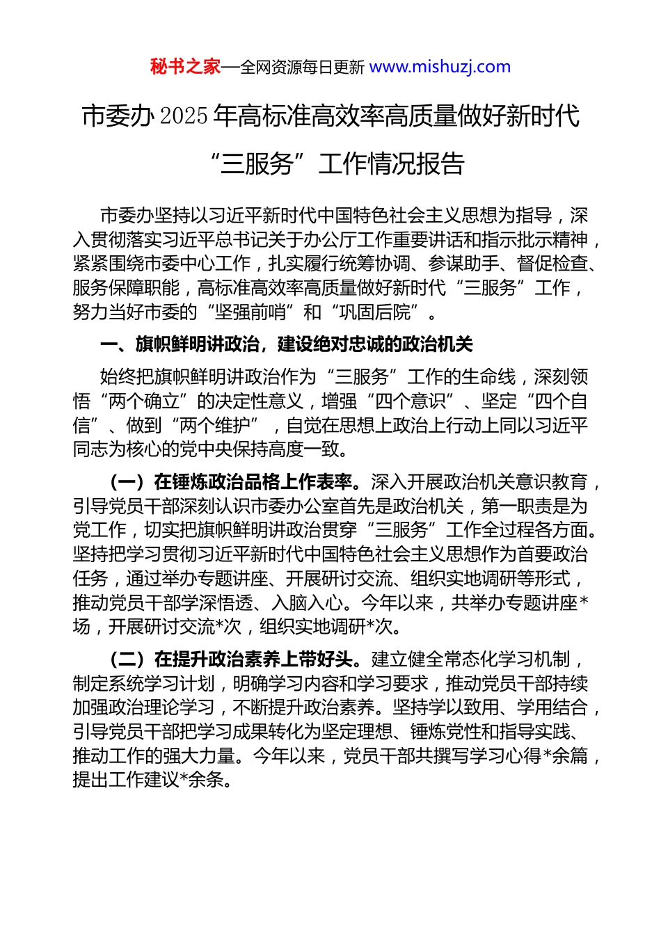 秘书之家—全网资源每日更新 www.mishuzj.com市委办 2025 年高标准高效率高质量做好新时代“三服务”工作情况报告市委办坚持以习近平新时代中国特色社会主义思想为指导,深入贯彻落实习近平总书记关于办公厅工作重要讲话和指示批示精神,紧紧围绕市委中心工作,扎实履行统筹协调、参谋助手、督促检查、服务保障职能,高标准高效率高质量做好新时代“三服务”工作,努力当好市委的“坚强前哨”和“巩固后院”。一、旗帜鲜明讲政治,建设绝对忠诚的政治机关始终把旗帜鲜明讲政治作为“三服务”工作的生命线,深刻领悟“两个确立”的决定性意义,增强“四个意识”、坚定“四个自信”、做到“两个维护”,自觉在思想上政治上行动上同以习近平同志为核心的党中央保持高度一致。(一)在锤炼政治品格上作表率。深入开展政治机关意识教育,引导党员干部深刻认识市委办公室首先是政治机关,第一职责是为党工作,切实把旗帜鲜明讲政治贯穿“三服务”工作全过程各方面。坚持把学习贯彻习近平新时代中国特色社会主义思想作为首要政治任务,通过举办专题讲座、开展研讨交流、组织实地调研等形式,推动党员干部学深悟透、入脑入心。今年以来,共举办专题讲座*场,开展研讨交流*次,组织实地调研*次。(二)在提升政治素养上带好头。建立健全常态化学习机制,制定系统学习计划,明确学习内容和学习要求,推动党员干部持续加强政治理论学习,不断提升政治素养。坚持学以致用、学用结合,引导党员干部把学习成果转化为坚定理想、锤炼党性和指导实践、推动工作的强大力量。今年以来,党员干部共撰写学习心得*余篇,提出工作建议*余条。秘书之家—全网资源每日更新 www.mishuzj.com(三)在严守政治纪律上做示范。把严守政治纪律和政治规矩摆在首位,严格执行党的政治纪律、组织纪律、廉洁纪律、群众纪律、工作纪律和生活纪律,坚决做到“五个必须”、杜绝“七个有之”。加强对党员干部的日常教育管理监督,通过开展廉政谈话、警示教育、自查自纠等活动,引导党员干部自觉遵守纪律规矩,做到心有所畏、言有所戒、行有所止。今年以来,共开展廉政谈话*人次,警示教育*次,自查自纠*次。(四)在强化政治能力上当标兵。注重在实践中锻炼党员干部的政治能力,通过参与重大任务、重要活动、重点工作,让党员干部在急难险重任务中经受考验、增长才干。加强对党员干部的政治能力培训,通过举办培训班、选派干部挂职锻炼等方式,不断提升党员干部的政治判断力、政治领悟力、政治执行力。今年以来,共选派*名干部参与重大任务,举办政治能力培训班*期,选派*名干部挂职锻炼。二、与时俱进促创新,构建系统完备运行高效的管理体系坚持把制度建设作为提升“三服务”工作水平的重要保障,与时俱进完善制度体系,优化工作流程,强化责任落实,不断提高工作制度化、规范化、科学化水平。(一)健全制度体系。对现有制度进行全面梳理,结合新形势新任务新要求,修订完善公文处理、会议组织、督查督办、信息报送、机要保密等方面的制度*项,新制定制度*项,形成了一套覆盖全面、科学合理、务实管用的制度体系。加强对制度执行情况的监督检查,定期对制度执行情况进行评估分析,及时发现和解决存在的问题,确保制度落到实处、发挥作用。今年以来,共开展制度执行情况监督检查*次,评估分析*次。(二)健全标准体系。围绕“三服务”工作各环节,制定完善工作标准和质量规范,明确工作流程、工作要求、工作时限,确保各项工作有章可循、有据可依。建立健全工作质量考核评价机制,将工作标准和质量规范纳入绩效考核内容,加强对工作质量的考核秘书之家—全网资源每日更新 www.mishuzj.com评价,推动工作质量不断提升。今年以来,共制定工作标准和质量规范*项,开展工作质量考核评价*次。(三)健全流程体系。对办文、办会、办事等工作流程进行全面优化,简化不必要的环节,减少不必要的程序,提高工作效率。建立健全工作流程跟踪反馈机制,加强对工作流程执行情况的跟踪监控,及时发现和解决流程运行中存在的问题,确保工作流程顺畅高效。今年以来,共优化工作流程*个,开展工作流程跟踪反馈*次。(四)健全责任体系...