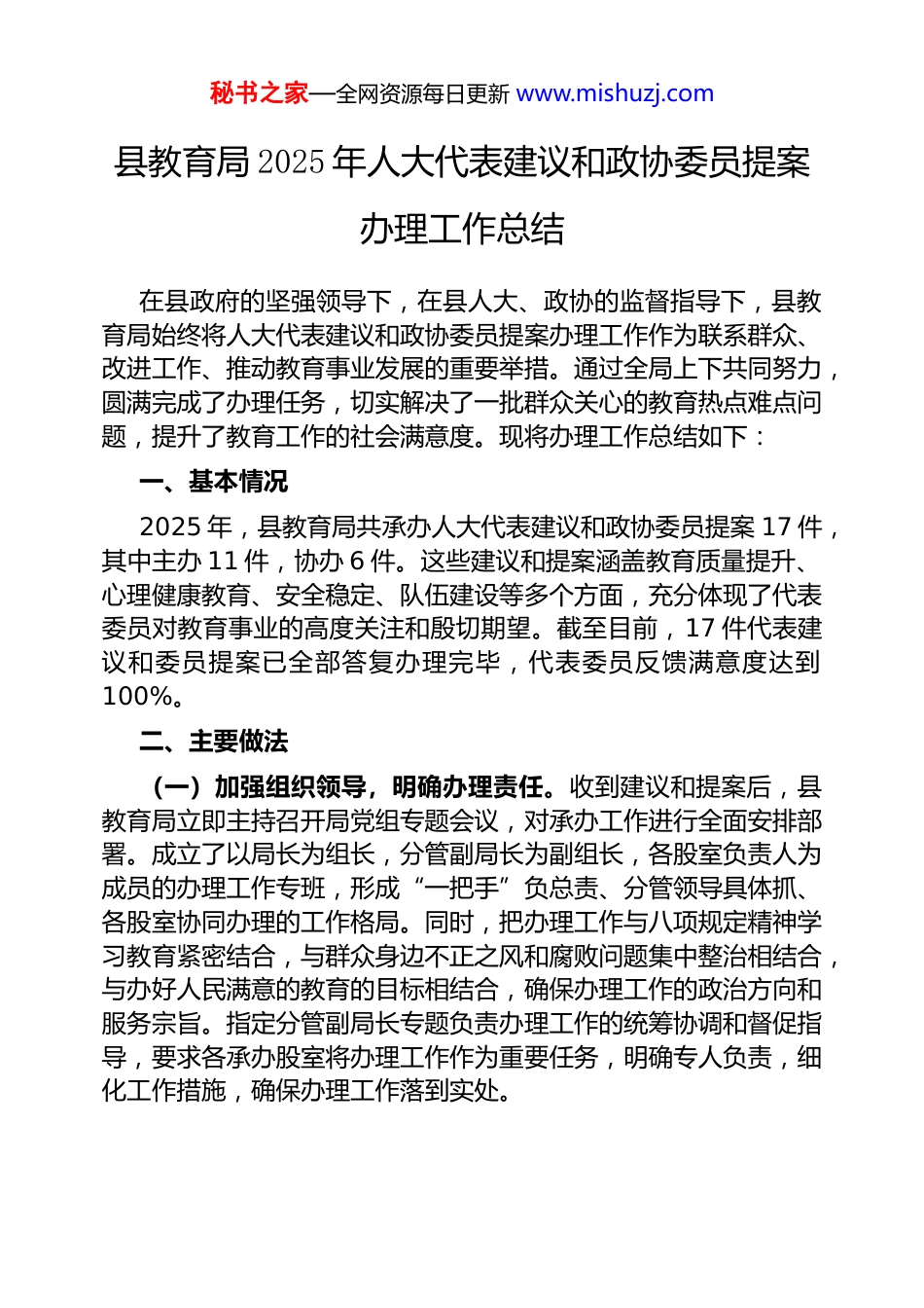秘书之家—全网资源每日更新 www.mishuzj.com县教育局 2025 年人大代表建议和政协委员提案办理工作总结在县政府的坚强领导下,在县人大、政协的监督指导下,县教育局始终将人大代表建议和政协委员提案办理工作作为联系群众、改进工作、推动教育事业发展的重要举措。通过全局上下共同努力,圆满完成了办理任务,切实解决了一批群众关心的教育热点难点问题,提升了教育工作的社会满意度。现将办理工作总结如下:一、基本情况2025 年,县教育局共承办人大代表建议和政协委员提案 17 件,其中主办 11 件,协办 6 件。这些建议和提案涵盖教育质量提升、心理健康教育、安全稳定、队伍建设等多个方面,充分体现了代表委员对教育事业的高度关注和殷切期望。截至目前,17 件代表建议和委员提案已全部答复办理完毕,代表委员反馈满意度达到100%。二、主要做法(一)加强组织领导,明确办理责任。收到建议和提案后,县教育局立即主持召开局党组专题会议,对承办工作进行全面安排部署。成立了以局长为组长,分管副局长为副组长,各股室负责人为成员的办理工作专班,形成“一把手”负总责、分管领导具体抓、各股室协同办理的工作格局。同时,把办理工作与八项规定精神学习教育紧密结合,与群众身边不正之风和腐败问题集中整治相结合,与办好人民满意的教育的目标相结合,确保办理工作的政治方向和服务宗旨。指定分管副局长专题负责办理工作的统筹协调和督促指导,要求各承办股室将办理工作作为重要任务,明确专人负责,细化工作措施,确保办理工作落到实处。秘书之家—全网资源每日更新 www.mishuzj.com(二)规范办理流程,严格办理要求。印发《确山县教育局2025 年人大代表建议和政协委员提案办理工作方案》,对办理流程、时间节点、答复格式等提出明确要求。办理前,各股室长主动与代表委员见面沟通,深入了解建议提案的背景和意图,征求他们对办理工作的意见和建议,确保办理工作有的放矢。办理过程中,积极邀请代表委员召开座谈会,全面汇报办理进展情况,认真听取他们的意见建议,及时调整办理思路和方法。办理后,再次联系代表委员,进一步征询他们对答复内容和办理结果的满意度,对不满意的及时进行整改完善,直至代表委员满意为止。严格审核答复内容,确保答复意见符合政策法规,具有针对性和可操作性,语言表述准确、规范、诚恳。(三)强化沟通协调,形成办理合力。加强与代表委员的沟通交流,通过电话、走访、座谈等多种方式,保持与代表委员的密切联系,及时了解他们的想法和需求,让代表委员参与到办理工作中来,增强办理工作的透明度和互动性。对于协办件,主动与主办单位沟通协调,及时提供协办意见和相关材料,积极配合主办单位共同做好办理工作。在办理涉及多个股室的建议提案时,建立股室间沟通协调机制,加强信息共享和工作协同,形成办理工作合力,共同推进问题的解决。(四)注重调查研究,力求办理实效。把调查研究作为办理工作的重要环节,要求承办股室深入基层学校、师生和家长中开展实地调研,全面了解问题的实际情况,广泛听取各方意见建议,为制定切实可行的办理方案提供依据。对于代表委员提出的热点难点问题,组织相关人员进行专题研究,分析问题产生的原因,寻找解决问题的办法和途径。在办理过程中,注重将建议提案办理与推动教育工作实际相结合,以办理工作为契机,改进工作方法,完善工作机制,推动教育事业发展,切实提高办理工作的实效性。三、办理工作成效秘书之家—全网资源每日更新 www.mishuzj.com(一)聚焦教育质量提升,推动教育内涵式发展。针对代表委员提出的关于提高教育质量的建议提案,县教育局采取了一系列有力措施。加强教学常规管理,制定出台教学常规管理办法,定期开展教学常规检查和视导,规范学校教学行为,提高课堂教学质量。深化课程改革,积极推进素质教育,加强课程体系建设,开发丰富多彩的校本课程,满足学生多样化发展需求。加强教育科研工作,鼓励教师开展教学研究和课题实验,推广优秀教学成果,以科研促教学,提升教师教学水平和专业素养。通过这些措施的实施,全县教育质量稳步提升,在今年的中高考中取得了优...