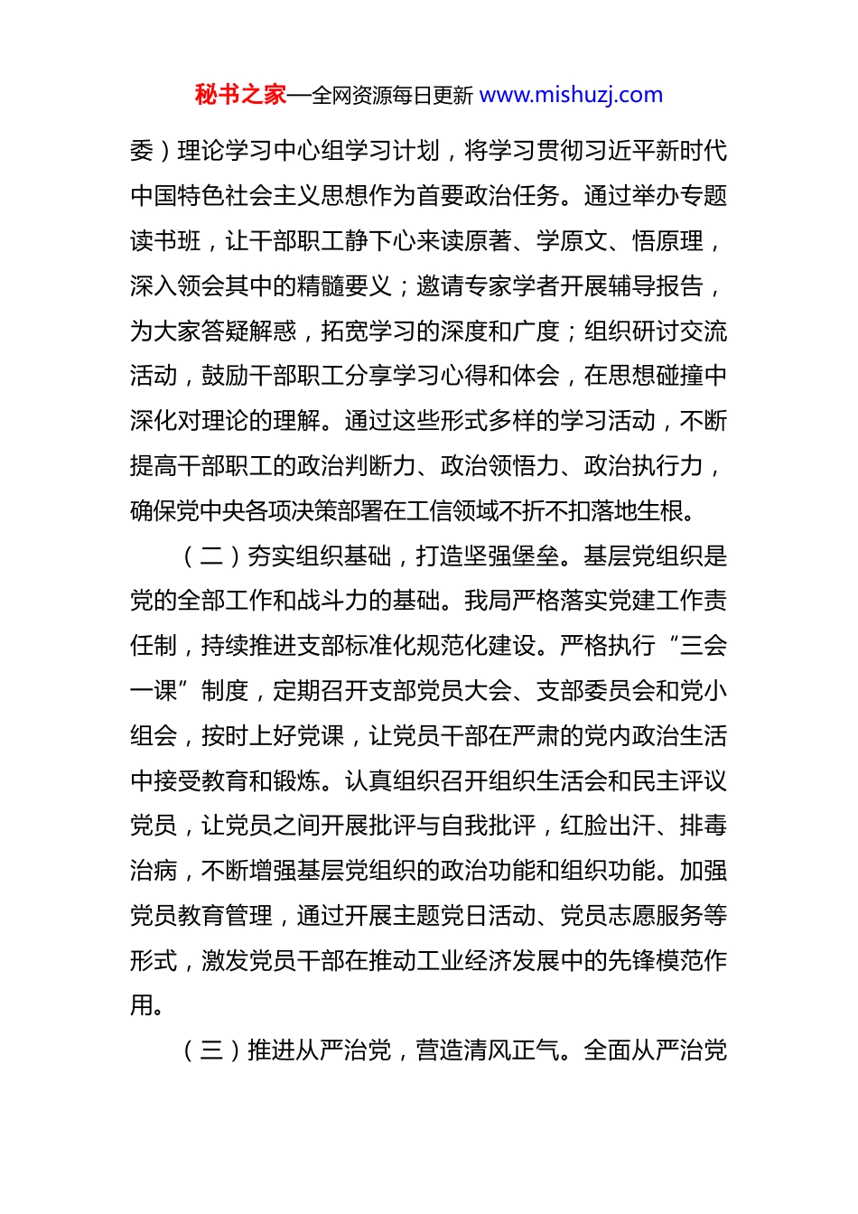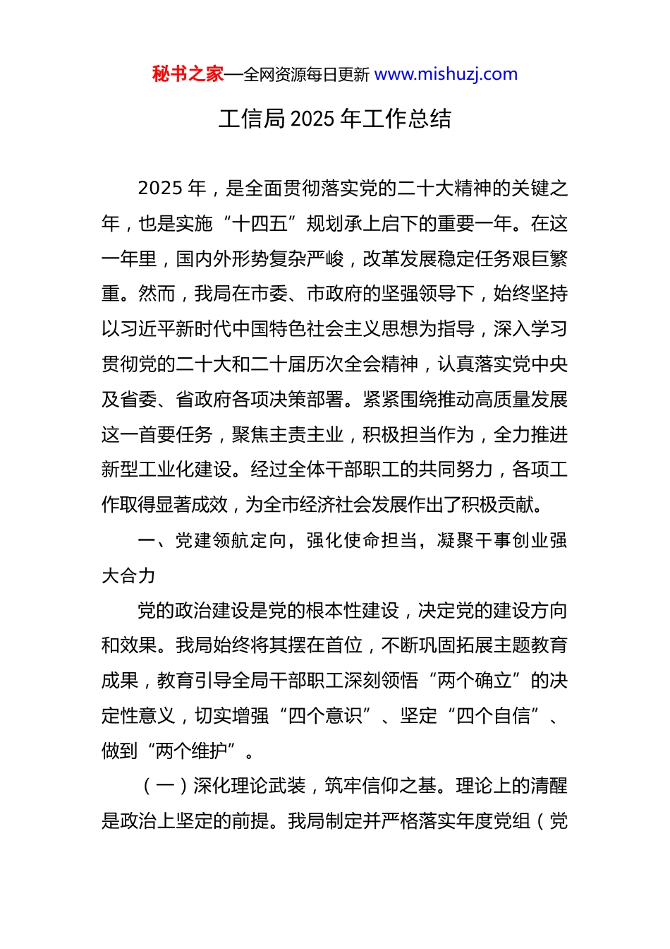 秘书之家—全网资源每日更新 www.mishuzj.com工信局 2025 年工作总结 2025 年,是全面贯彻落实党的二十大精神的关键之年,也是实施“十四五”规划承上启下的重要一年。在这一年里,国内外形势复杂严峻,改革发展稳定任务艰巨繁重。然而,我局在市委、市政府的坚强领导下,始终坚持以习近平新时代中国特色社会主义思想为指导,深入学习贯彻党的二十大和二十届历次全会精神,认真落实党中央及省委、省政府各项决策部署。紧紧围绕推动高质量发展这一首要任务,聚焦主责主业,积极担当作为,全力推进新型工业化建设。经过全体干部职工的共同努力,各项工作取得显著成效,为全市经济社会发展作出了积极贡献。一、党建领航定向,强化使命担当,凝聚干事创业强大合力党的政治建设是党的根本性建设,决定党的建设方向和效果。我局始终将其摆在首位,不断巩固拓展主题教育成果,教育引导全局干部职工深刻领悟“两个确立”的决定性意义,切实增强“四个意识”、坚定“四个自信”、做到“两个维护”。(一)深化理论武装,筑牢信仰之基。理论上的清醒是政治上坚定的前提。我局制定并严格落实年度党组(党秘书之家—全网资源每日更新 www.mishuzj.com委)理论学习中心组学习计划,将学习贯彻习近平新时代中国特色社会主义思想作为首要政治任务。通过举办专题读书班,让干部职工静下心来读原著、学原文、悟原理,深入领会其中的精髓要义;邀请专家学者开展辅导报告,为大家答疑解惑,拓宽学习的深度和广度;组织研讨交流活动,鼓励干部职工分享学习心得和体会,在思想碰撞中深化对理论的理解。通过这些形式多样的学习活动,不断提高干部职工的政治判断力、政治领悟力、政治执行力,确保党中央各项决策部署在工信领域不折不扣落地生根。(二)夯实组织基础,打造坚强堡垒。基层党组织是党的全部工作和战斗力的基础。我局严格落实党建工作责任制,持续推进支部标准化规范化建设。严格执行“三会一课”制度,定期召开支部党员大会、支部委员会和党小组会,按时上好党课,让党员干部在严肃的党内政治生活中接受教育和锻炼。认真组织召开组织生活会和民主评议党员,让党员之间开展批评与自我批评,红脸出汗、排毒治病,不断增强基层党组织的政治功能和组织功能。加强党员教育管理,通过开展主题党日活动、党员志愿服务等形式,激发党员干部在推动工业经济发展中的先锋模范作用。(三)推进从严治党,营造清风正气。全面从严治党秘书之家—全网资源每日更新 www.mishuzj.com是党永葆生机活力、走好新的赶考之路的必由之路。我局认真履行管党治党政治责任,锲而不舍落实中央八项规定精神,持续深化纠治“四风”。加强廉政风险防控,对重点岗位和关键环节进行全面排查,制定相应的防控措施,从源头上预防腐败问题的发生。深入开展警示教育,通过组织观看警示教育片、参观廉政教育基地等方式,让干部职工深刻认识到腐败的危害性,自觉做到廉洁自律。一体推进不敢腐、不能腐、不想腐,营造风清气正的政治生态和干事创业的良好环境。二、聚焦核心任务,加速转型升级,推动工业经济稳健向好面对复杂多变的经济形势和激烈的市场竞争,我局积极应对风险挑战,加强经济运行监测调度,着力稳增长、调结构、促转型,推动工业经济呈现持续恢复向好态势。(一)工业运行稳健,主要指标合理增长。准确把握经济运行态势是做好工业经济工作的前提。我局密切跟踪重点行业、重点企业、重点指标运行情况,建立健全经济运行监测体系,加强对工业增加值、工业投资、工业用电量等关键指标的分析研判,及时发现经济运行中存在的问题和潜在风险,并提前做好政策储备。全年规模以上工业增加值预计同比增长*%,工业投资同比增长*%,实现了质秘书之家—全网资源每日更新 www.mishuzj.com的有效提升和量的合理增长。同时,全力保障产业链供应链稳定畅通,积极协调解决企业在原材料供应、物流运输等方面遇到的困难和问题,有效应对了各类风险冲击。(二)产业结构优化,升级步伐显著加快。产业结构优化升级是工业经济高质量发展的关键。我局深入实施产业基础再造和重大技术装备攻关工程,加大对关键核心技术的研发投入,组织...