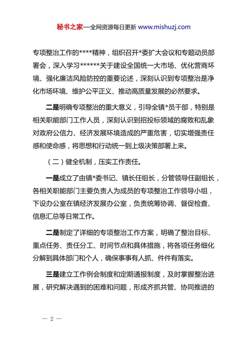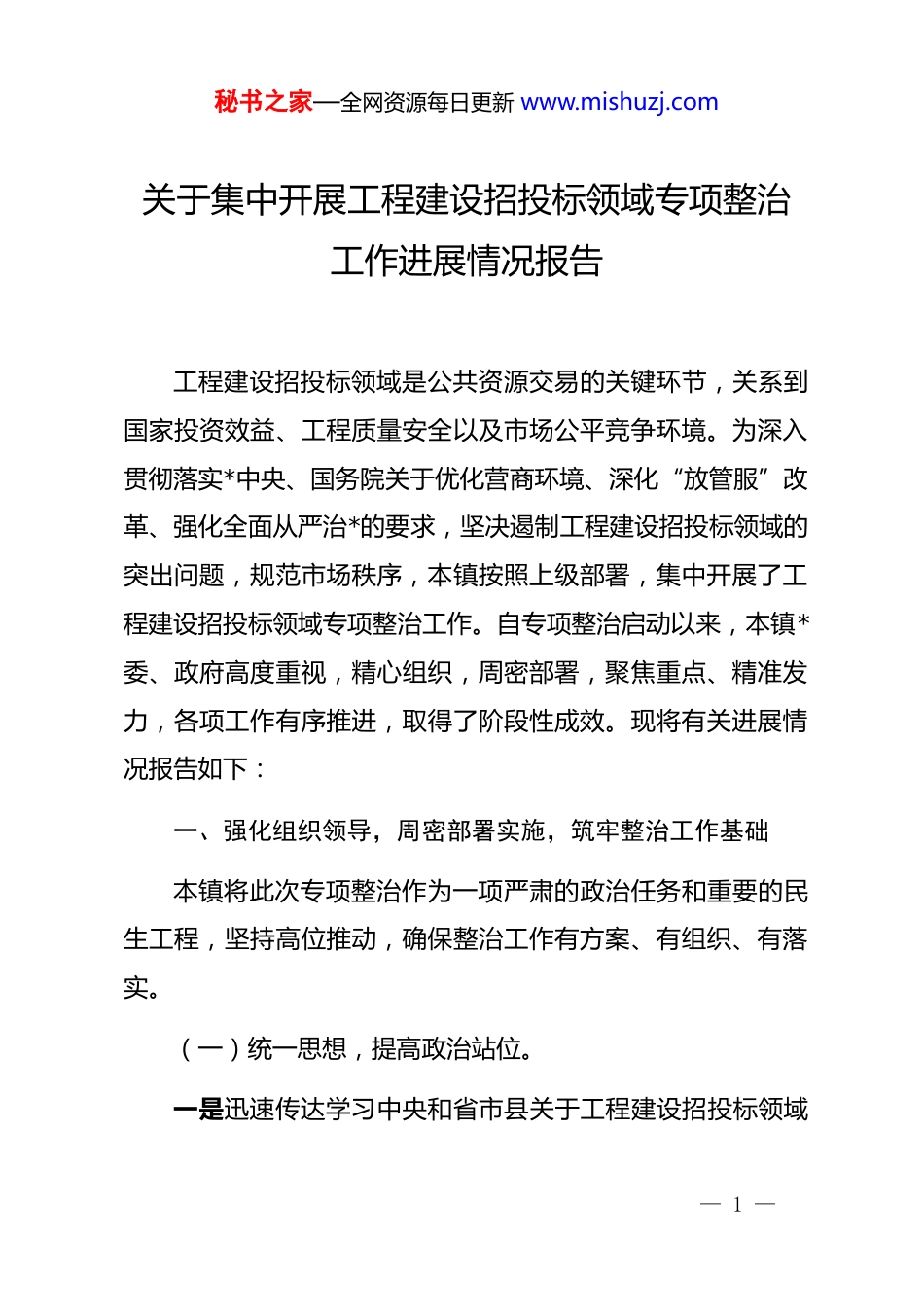 秘书之家—全网资源每日更新 www.mishuzj.com关于集中开展工程建设招投标领域专项整治工作进展情况报告工程建设招投标领域是公共资源交易的关键环节,关系到国家投资效益、工程质量安全以及市场公平竞争环境。为深入贯彻落实*中央、国务院关于优化营商环境、深化“放管服”改革、强化全面从严治*的要求,坚决遏制工程建设招投标领域的突出问题,规范市场秩序,本镇按照上级部署,集中开展了工程建设招投标领域专项整治工作。自专项整治启动以来,本镇*委、政府高度重视,精心组织,周密部署,聚焦重点、精准发力,各项工作有序推进,取得了阶段性成效。现将有关进展情况报告如下:一、强化组织领导,周密部署实施,筑牢整治工作基础本镇将此次专项整治作为一项严肃的政治任务和重要的民生工程,坚持高位推动,确保整治工作有方案、有组织、有落实。(一)统一思想,提高政治站位。一是迅速传达学习中央和省市县关于工程建设招投标领域— 1 —秘书之家—全网资源每日更新 www.mishuzj.com专项整治工作的****精神,组织召开*委扩大会议和专题动员部署会,深入学习******关于建设全国统一大市场、优化营商环境、强化廉洁风险防控的重要论述,深刻认识到专项整治是净化市场环境、维护公平正义、推动高质量发展的必然要求。二是明确专项整治的重大意义,引导全镇*员干部,特别是相关职能部门工作人员,深刻认识到招投标领域的腐败和乱象对政府公信力、经济发展环境造成的严重危害,切实增强责任感和使命感,将思想和行动统一到上级决策部署上来。(二)健全机制,压实工作责任。一是成立了由镇*委书记、镇长任组长,分管领导任副组长,各相关职能部门主要负责人为成员的专项整治工作领导小组,下设办公室在镇经济发展办公室,负责统筹协调、督促检查、信息汇总等日常工作。二是制定了详细的专项整治工作方案,明确了整治目标、重点任务、责任分工、时间节点和具体措施,将各项任务细化分解到具体部门和个人,确保事事有人抓、件件有落实。三是建立工作例会制度和定期通报制度,及时掌握整治进展,研究解决遇到的困难和问题,形成齐抓共管、协同推进的— 2 —秘书之家—全网资源每日更新 www.mishuzj.com工作格局。(三)广泛宣传,营造良好氛围。一是通过镇政府网站、微信公众号、村(社区)公示栏等多种渠道,广泛宣传专项整治的目的意义、政策法规和举报方式,引导社会各界积极参与和监督。二是向工程建设相关企业、从业人员发放告知书,明确招投标行为规范和法律责任,重申纪律红线,形成强大震慑,督促市场主体规范自身行为。二、聚焦重点问题,全面深入排查,精准锁定风险隐患本镇在排查环节坚持问题导向,突出重点,运用多种方式力求全面、深入、精准地发现招投标领域存在的突出问题。(一)全面摸排,梳理问题线索。一是组织各职能部门对 2023 年以来本镇范围内的工程建设项目招投标活动进行全面“回头看”,重点审查项目立项、招投标方案制定、招标文件编制、资格审查、开标评标、定标备案、合同签订等关键环节,排查是否存在违法违规行为。二是针对政府投资工程、民生工程、重点工程等项目,开— 3 —秘书之家—全网资源每日更新 www.mishuzj.com展重点检查和专项审计,对招投标全流程进行穿透式监督,不放过任何可疑环节和线索。三是畅通举报渠道,设立举报电话、举报信箱,鼓励群众、企业和内部员工积极举报招投标领域的违法违规问题,对收集到的线索实行专人管理、优先核查、严格**。(二)聚焦突出问题,精准靶向排查。一是严查围标串标行为。通过对不同项目的投标单位、投标报价、保证金缴纳、标书制作、ip 地址等进行大数据分析比对,深挖是否存在投标人之间相互串通投标、与招标人串通投标等行为。二是严查弄虚作假行为。重点核查投标企业资质、业绩、项目负责人执业资格等证明材料的真实性,对发现的虚假承诺、虚报业绩等行为一查到底。三是严查行政干预和插手工程行为。严肃查处行政机关及其工作人员以任何形式干预或插手工程项目招投标活动的线索,坚决斩断权力寻租的链条。四是严查资质挂靠和转包转借行为。通过现场核查、资金流向分析等方式,倒查中...